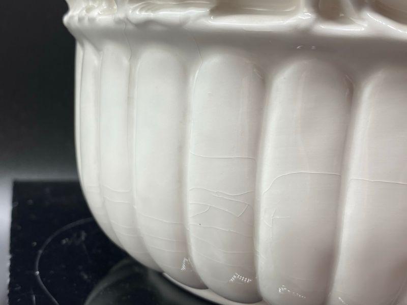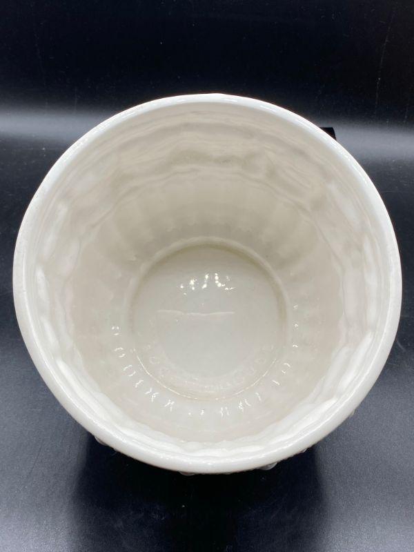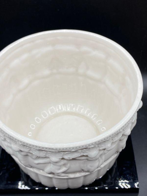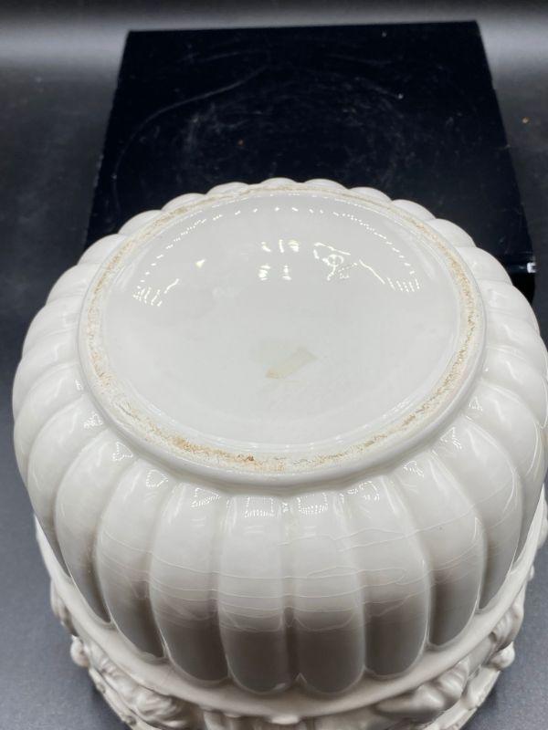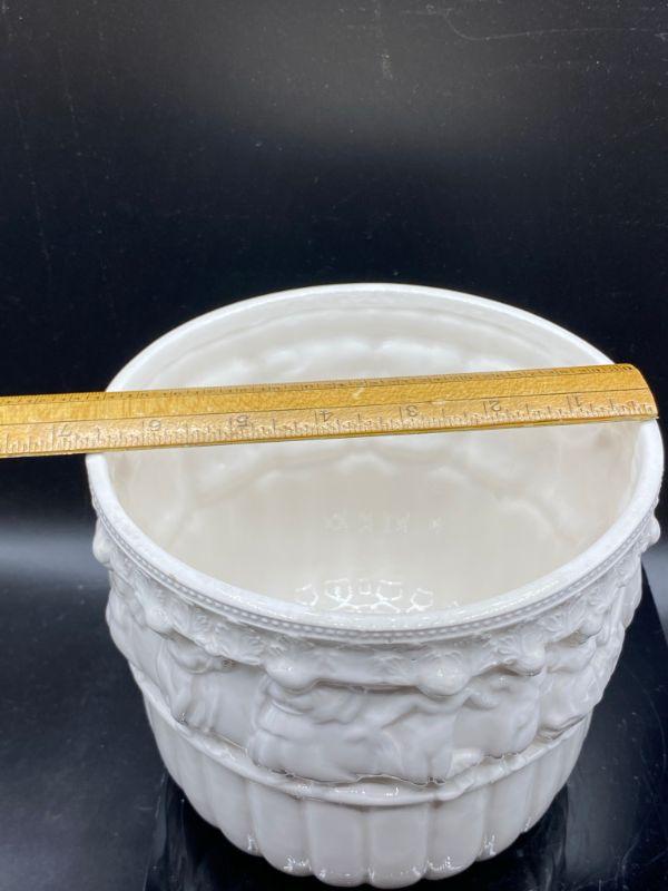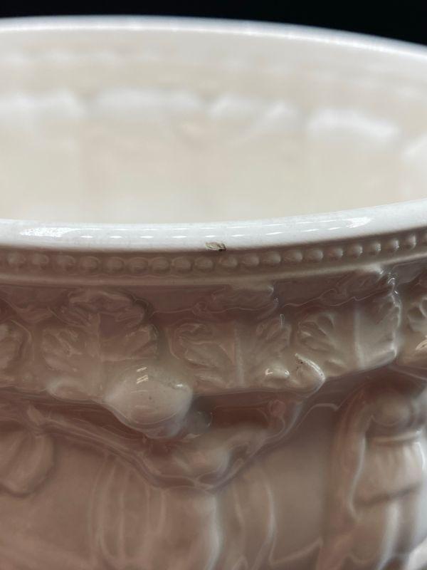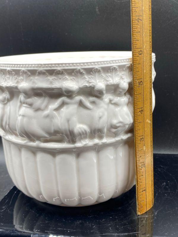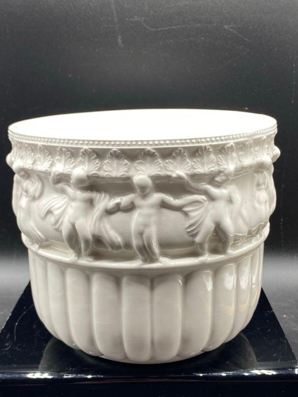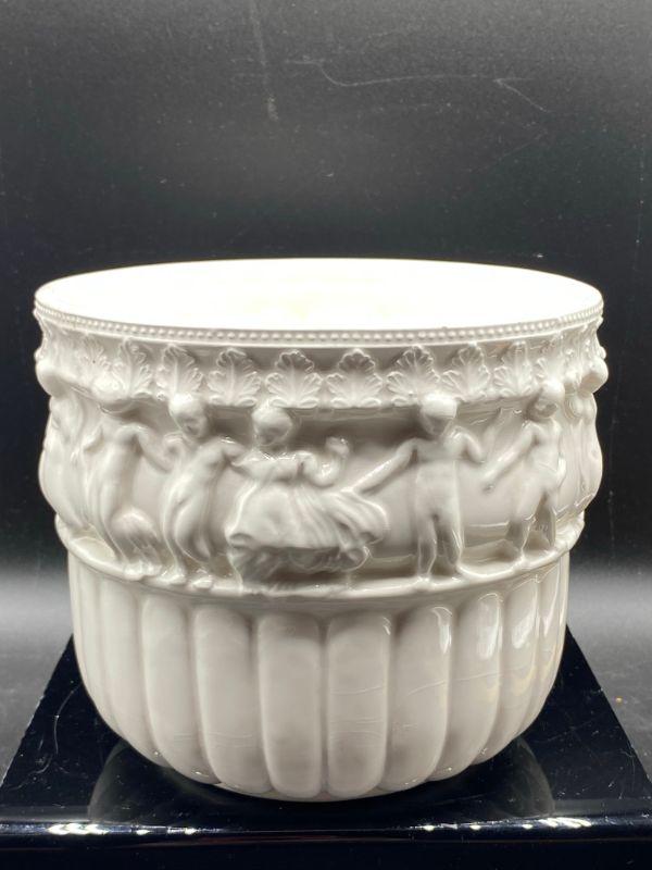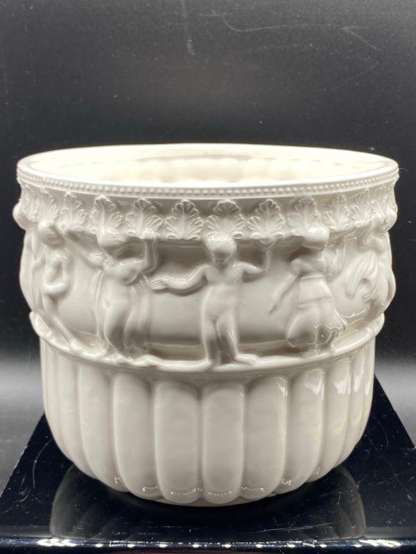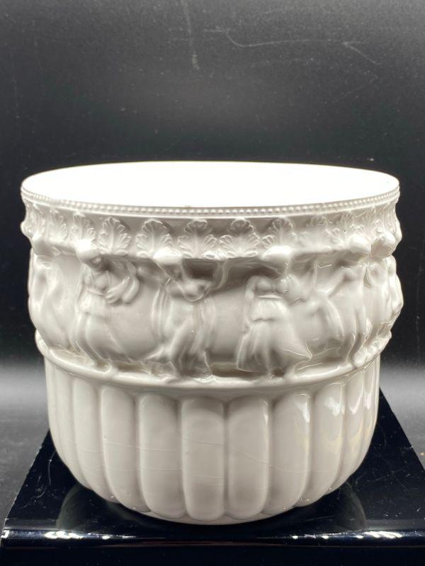Interesting planter pot. Has images of people, some with clothes some look without, dancing. Has a Ancient Greek or Roman look to it. Stands at almost 6". Small chip in the edge. Unmarked.