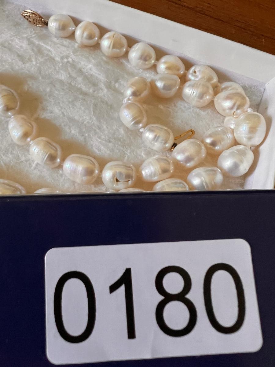Classic pearl necklace 18” from one end to the other. Clasp stamped 10k
