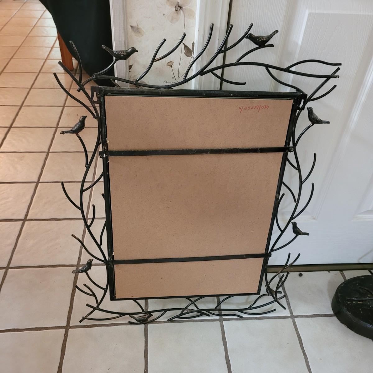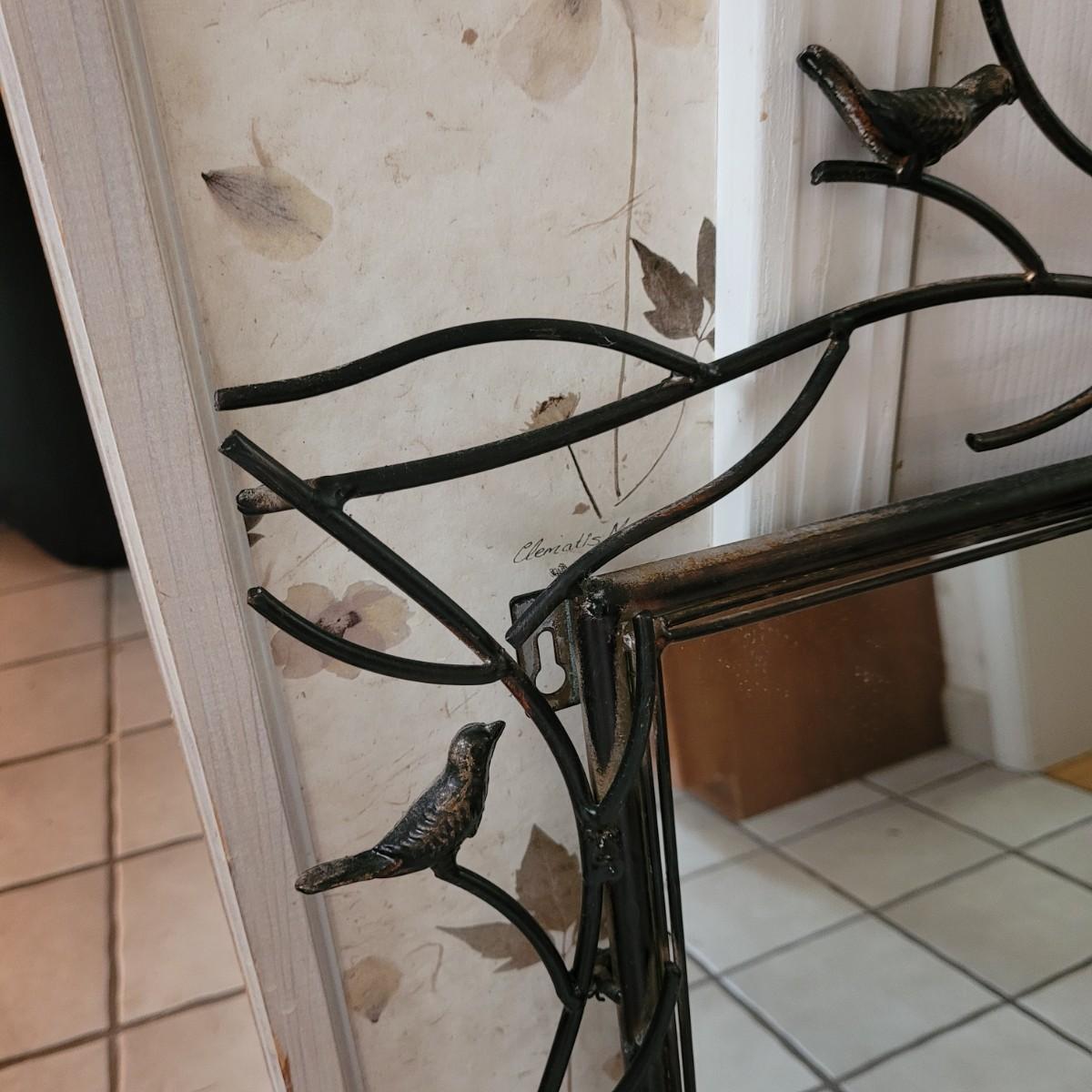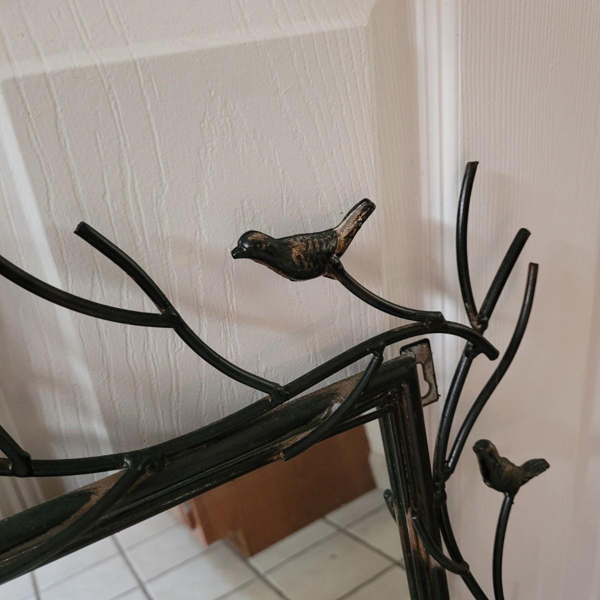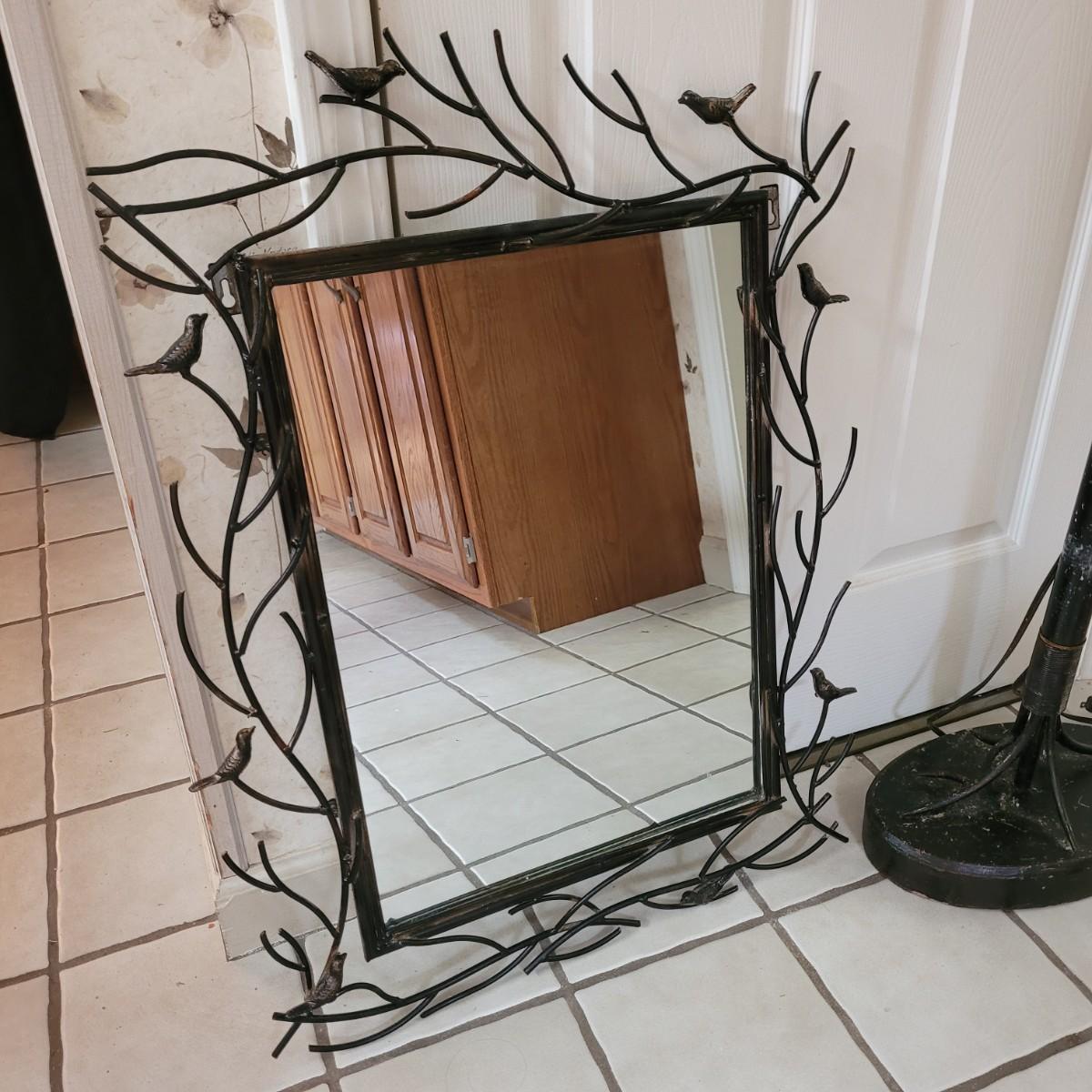 Metal framing around this mirror and lamp depicts perched birds on branches. Mirror measures approximately 11” x 30”H and lamp 62.5”H. Some scratches and chips on both pieces. See photos.lamp has three way switch. Local pickup only.