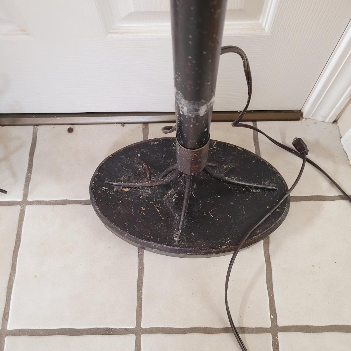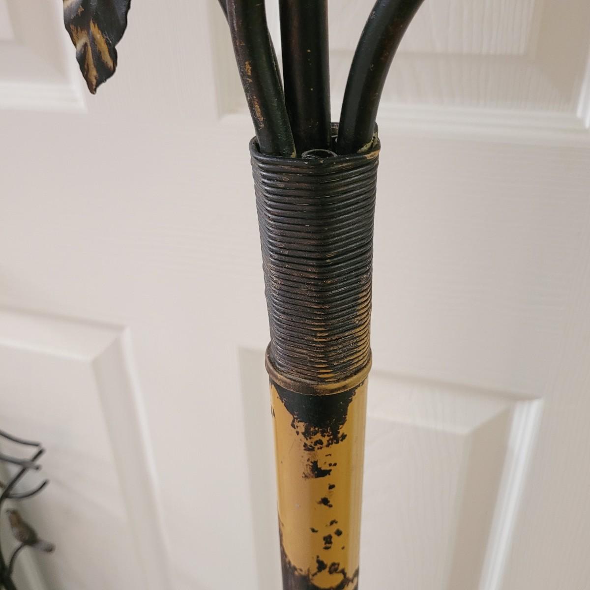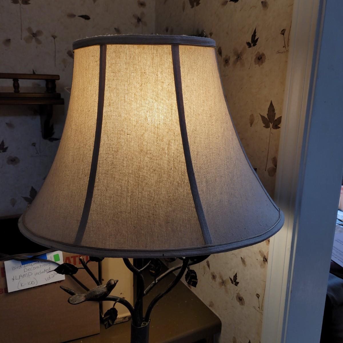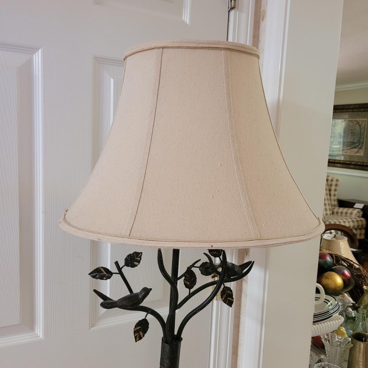 Metal framing around this mirror and lamp depicts perched birds on branches. Mirror measures approximately 11” x 30”H and lamp 62.5”H. Some scratches and chips on both pieces. See photos.lamp has three way switch. Local pickup only.