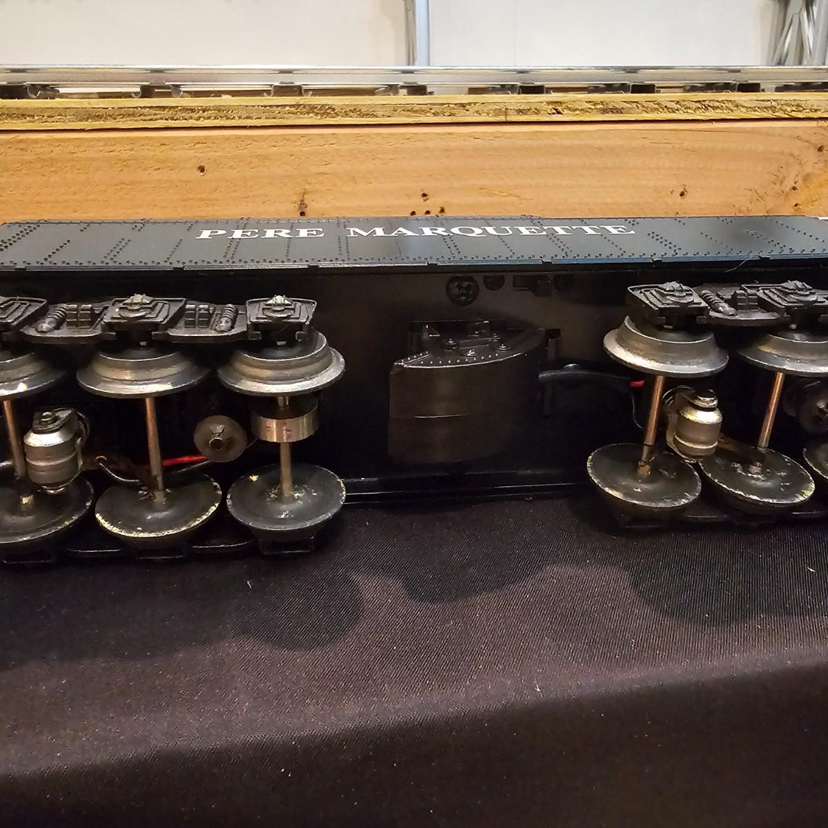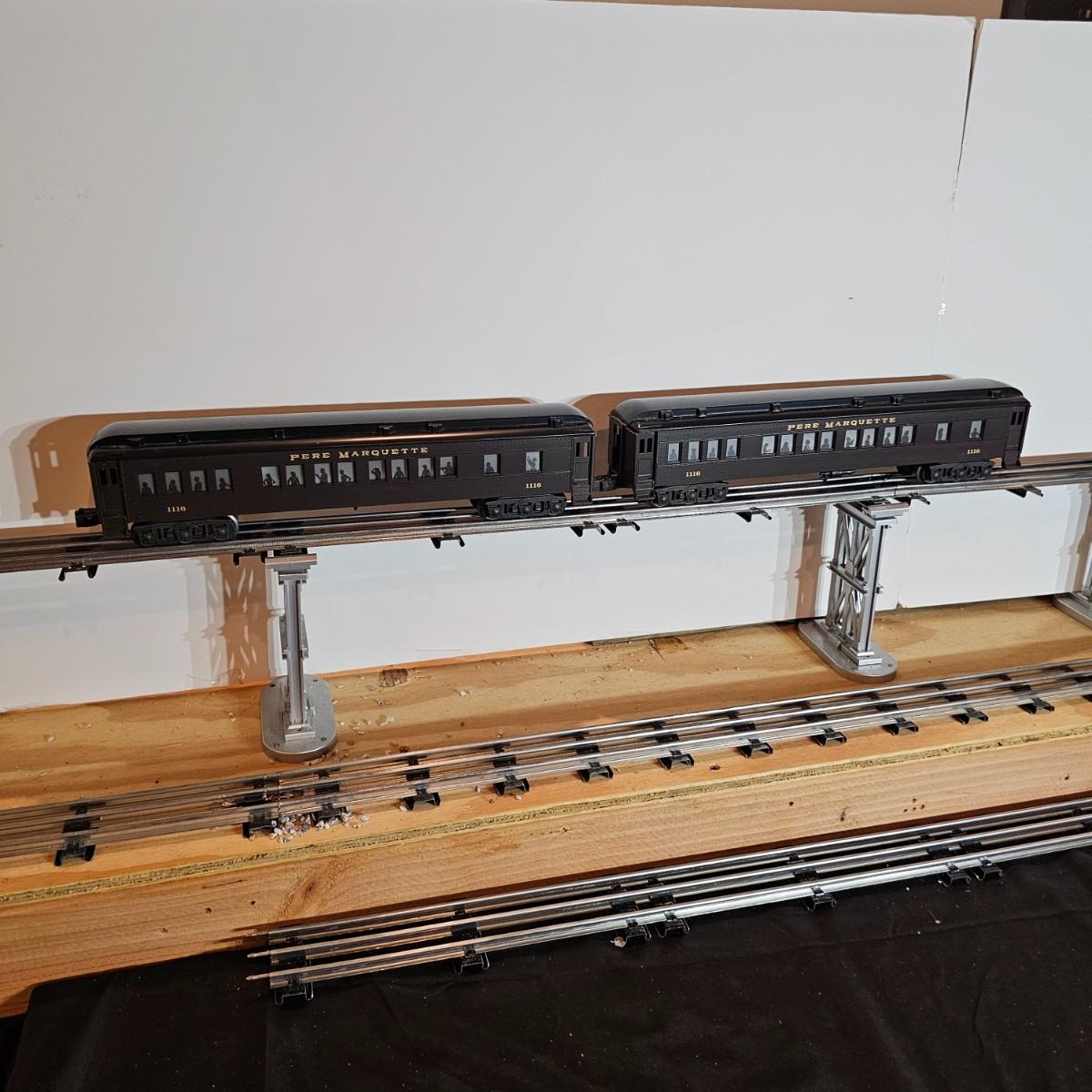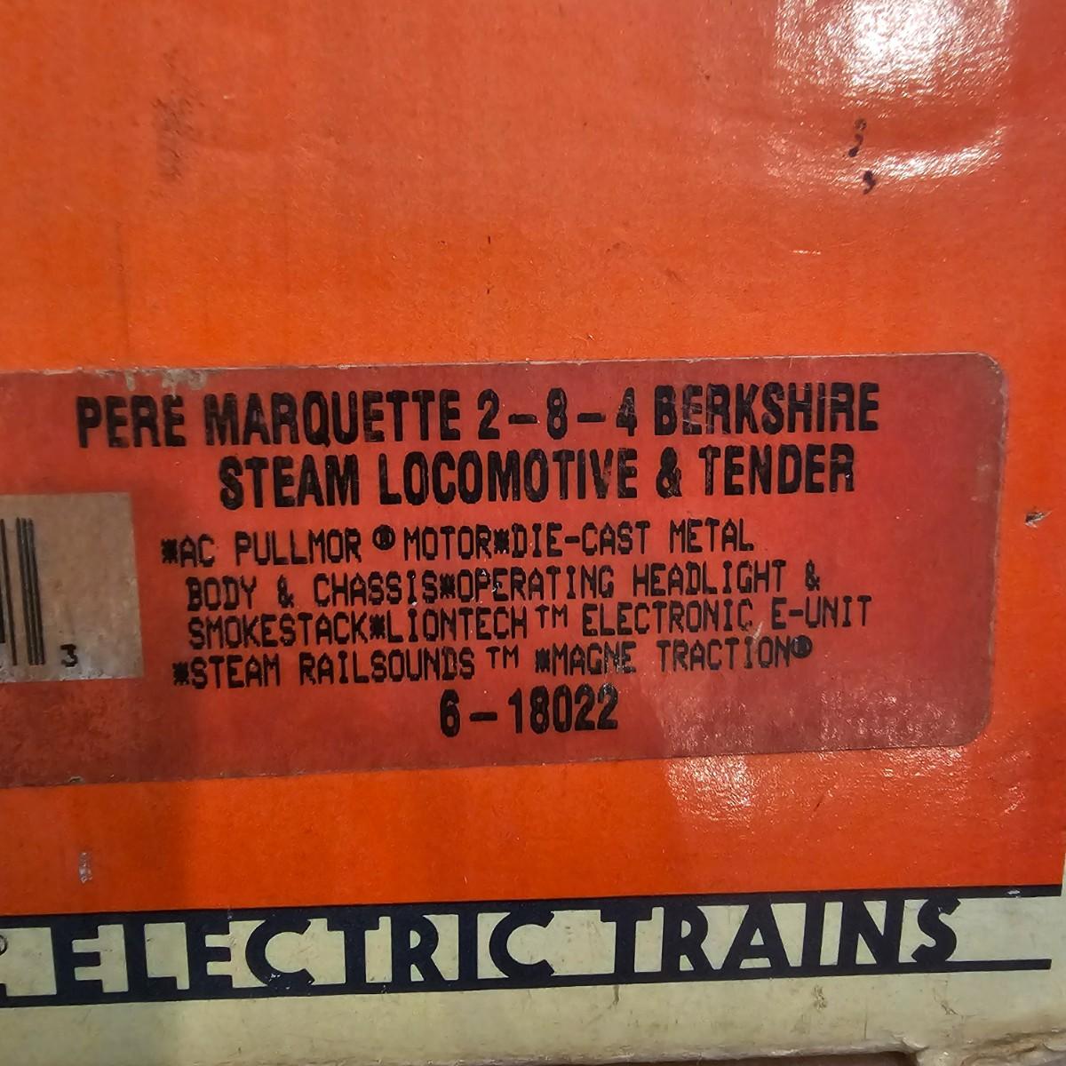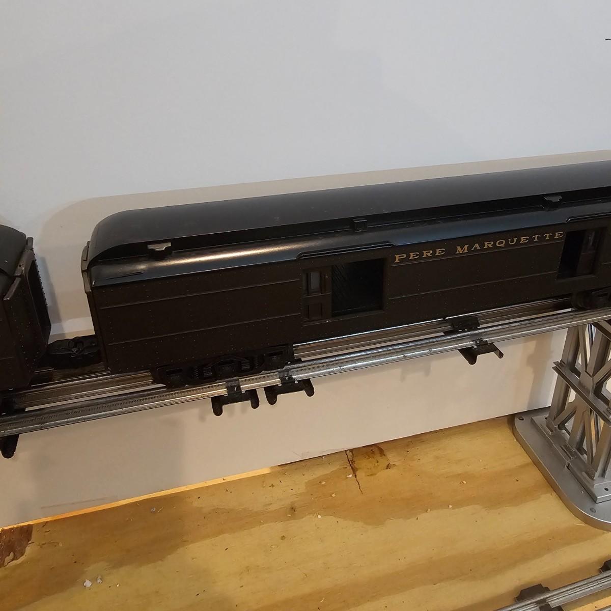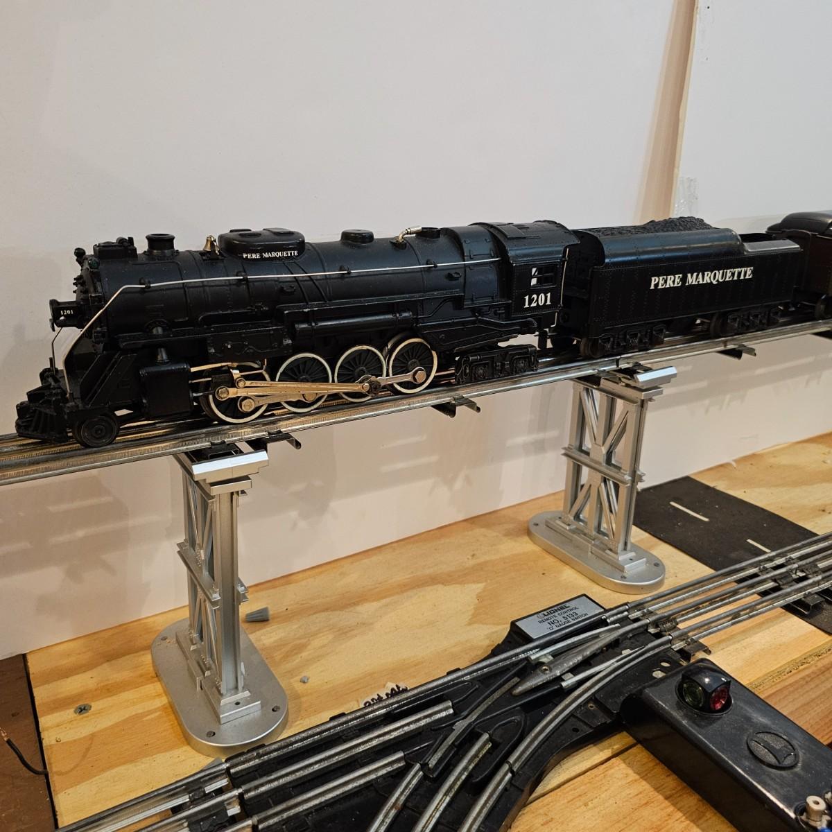 Beautiful Pere Marquette steam loco with lots of features. Lights, bell, whistle, chuff and more. Started and ran on layout. Also includes six coaches: two baggage cars, an observation car and three passenger cars. All cars illuminated but the baggage pair. Full length of train approximately 110". Also two double door boxcars. All items in original boxes, all Lionel. See photos for details. Shipping available. Please note that any price tag seen on an item was not put there by Sterling Transitions and does not reflect the current value of the item.