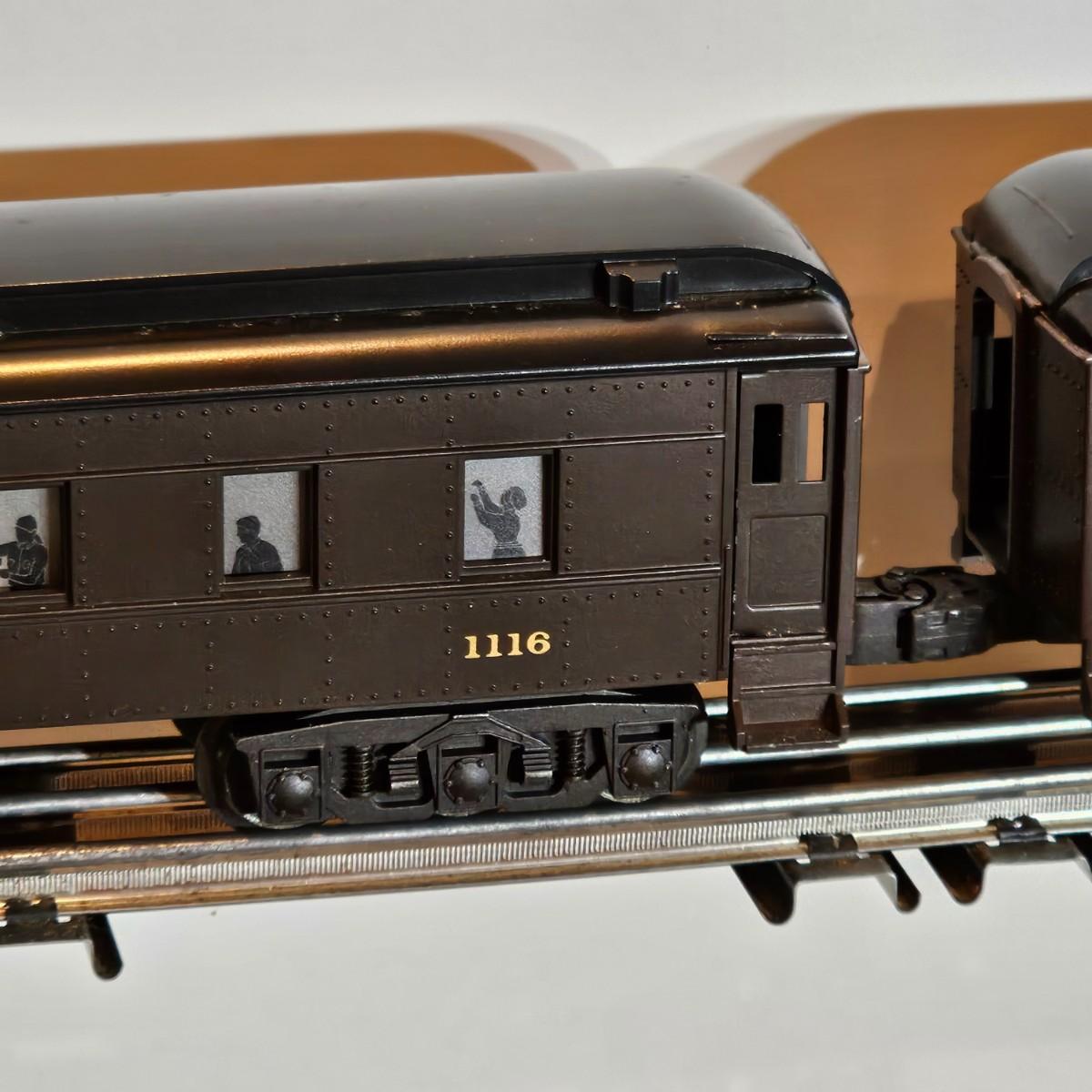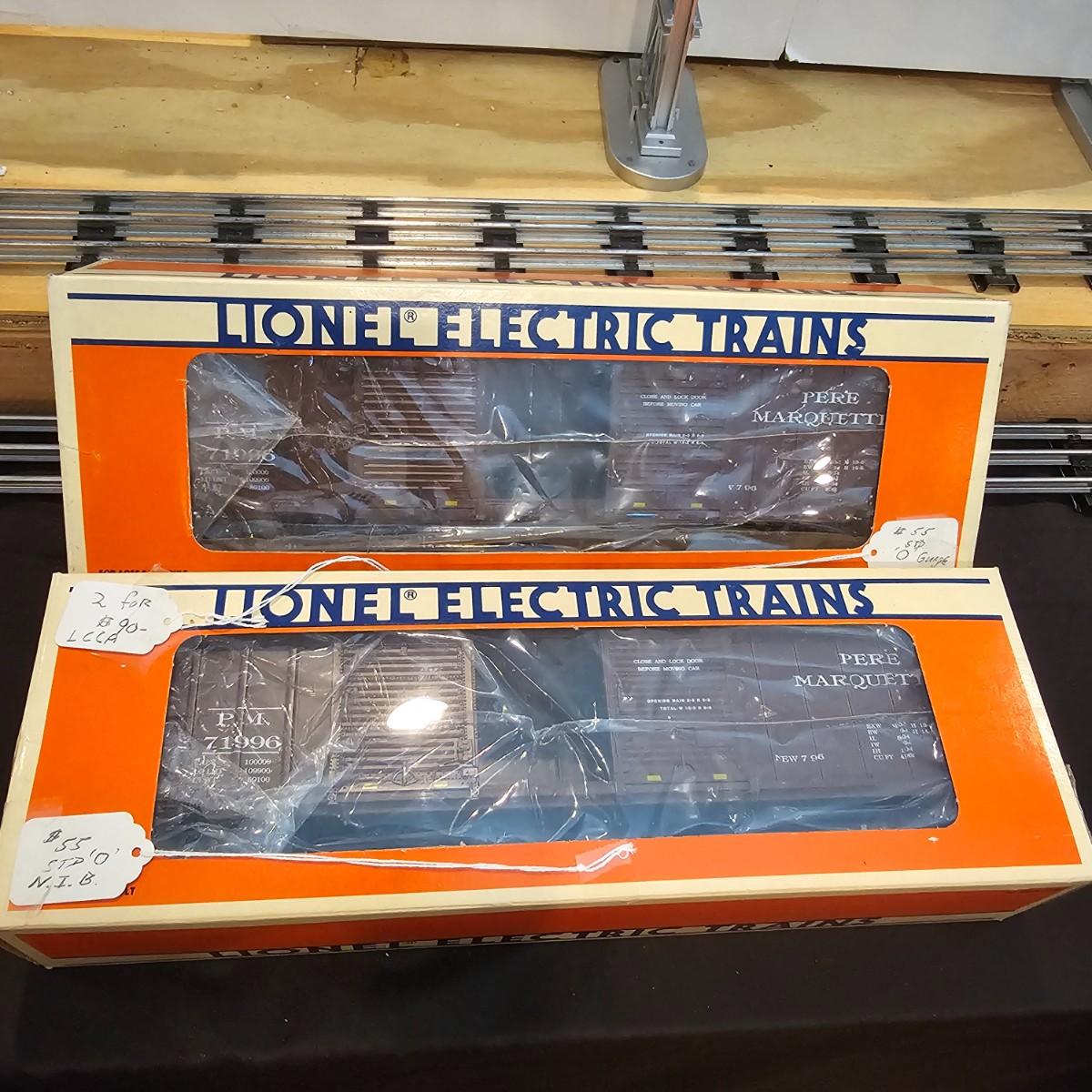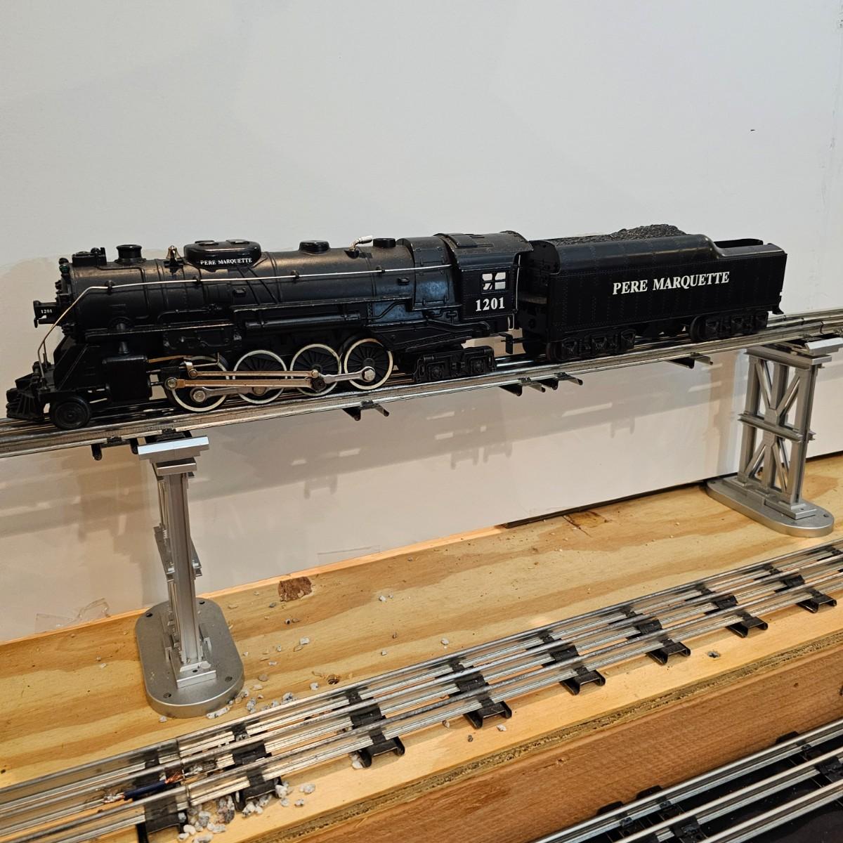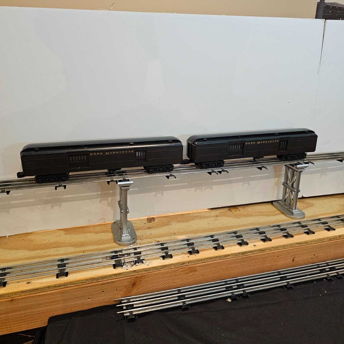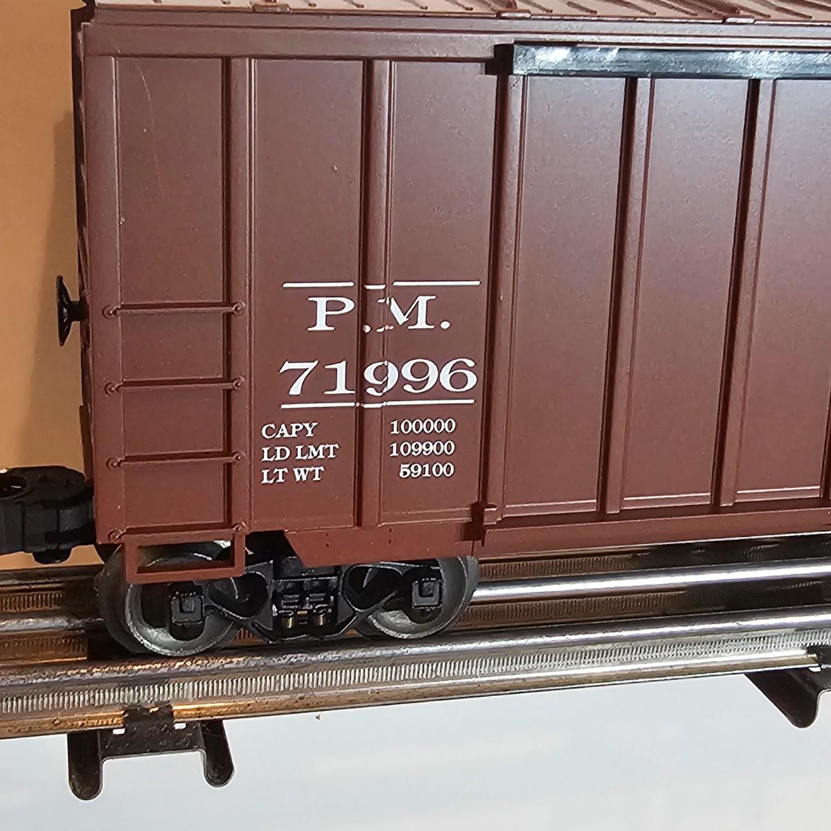 Beautiful Pere Marquette steam loco with lots of features. Lights, bell, whistle, chuff and more. Started and ran on layout. Also includes six coaches: two baggage cars, an observation car and three passenger cars. All cars illuminated but the baggage pair. Full length of train approximately 110". Also two double door boxcars. All items in original boxes, all Lionel. See photos for details. Shipping available. Please note that any price tag seen on an item was not put there by Sterling Transitions and does not reflect the current value of the item.