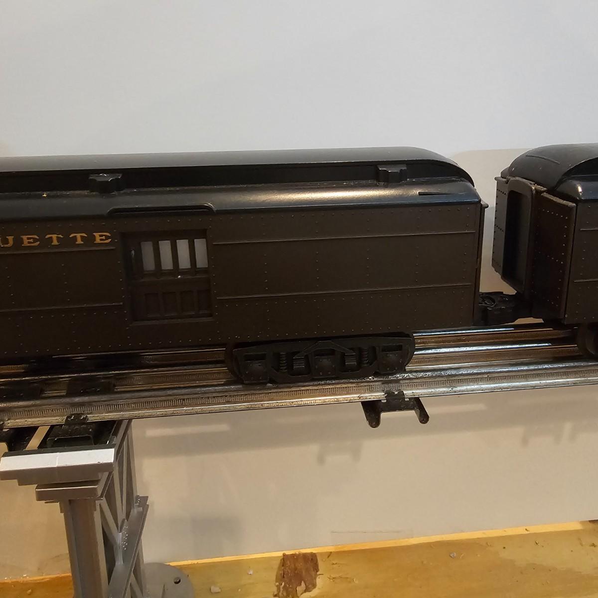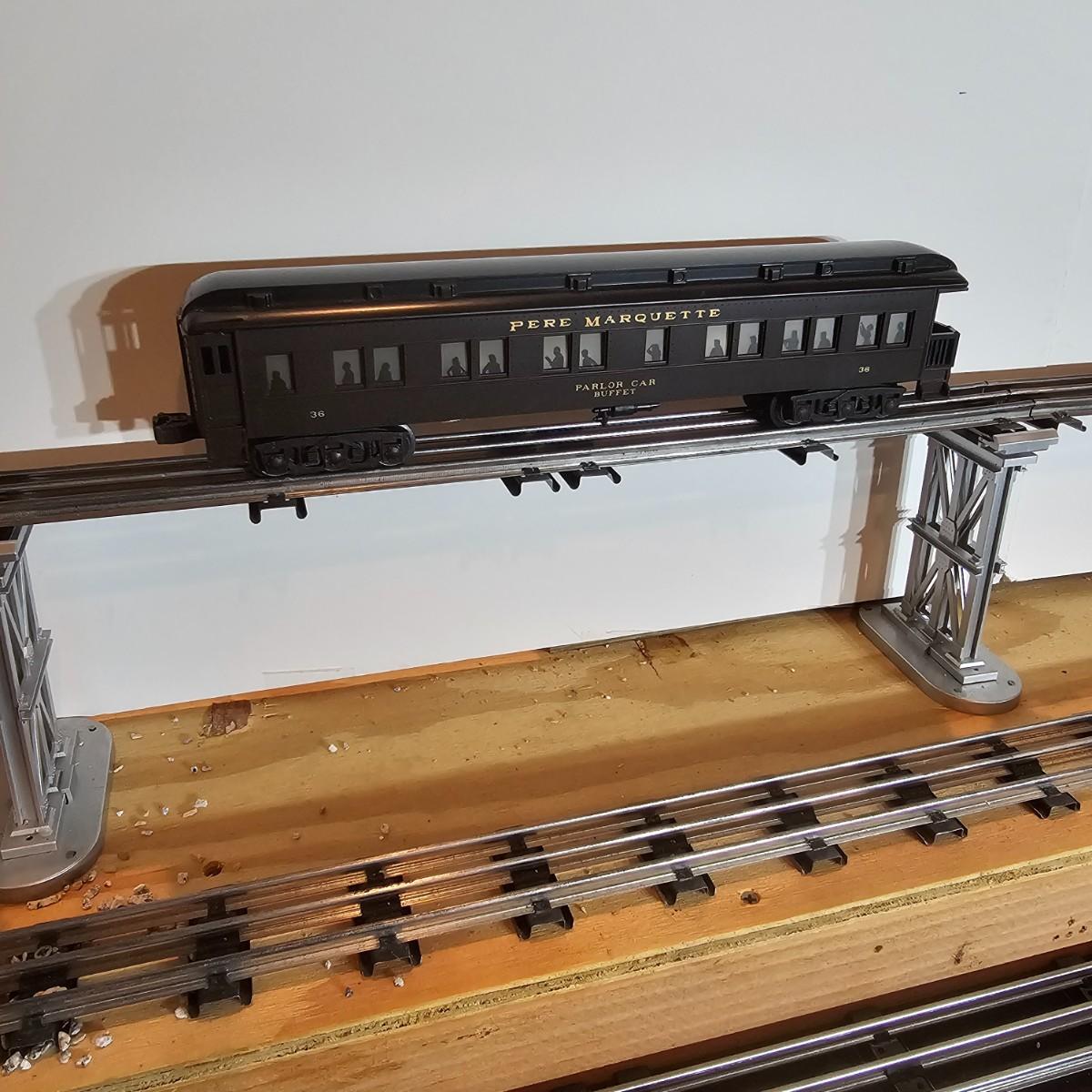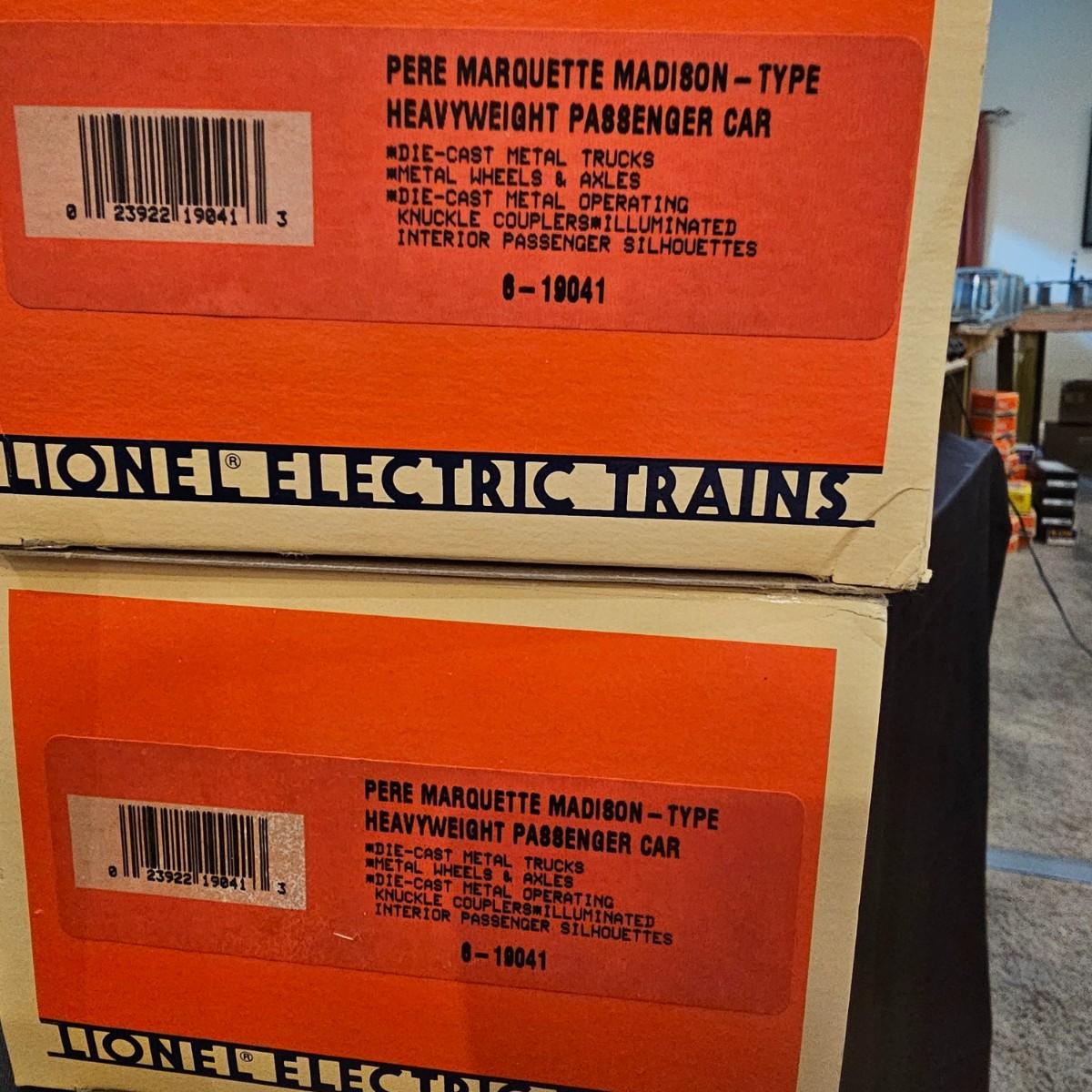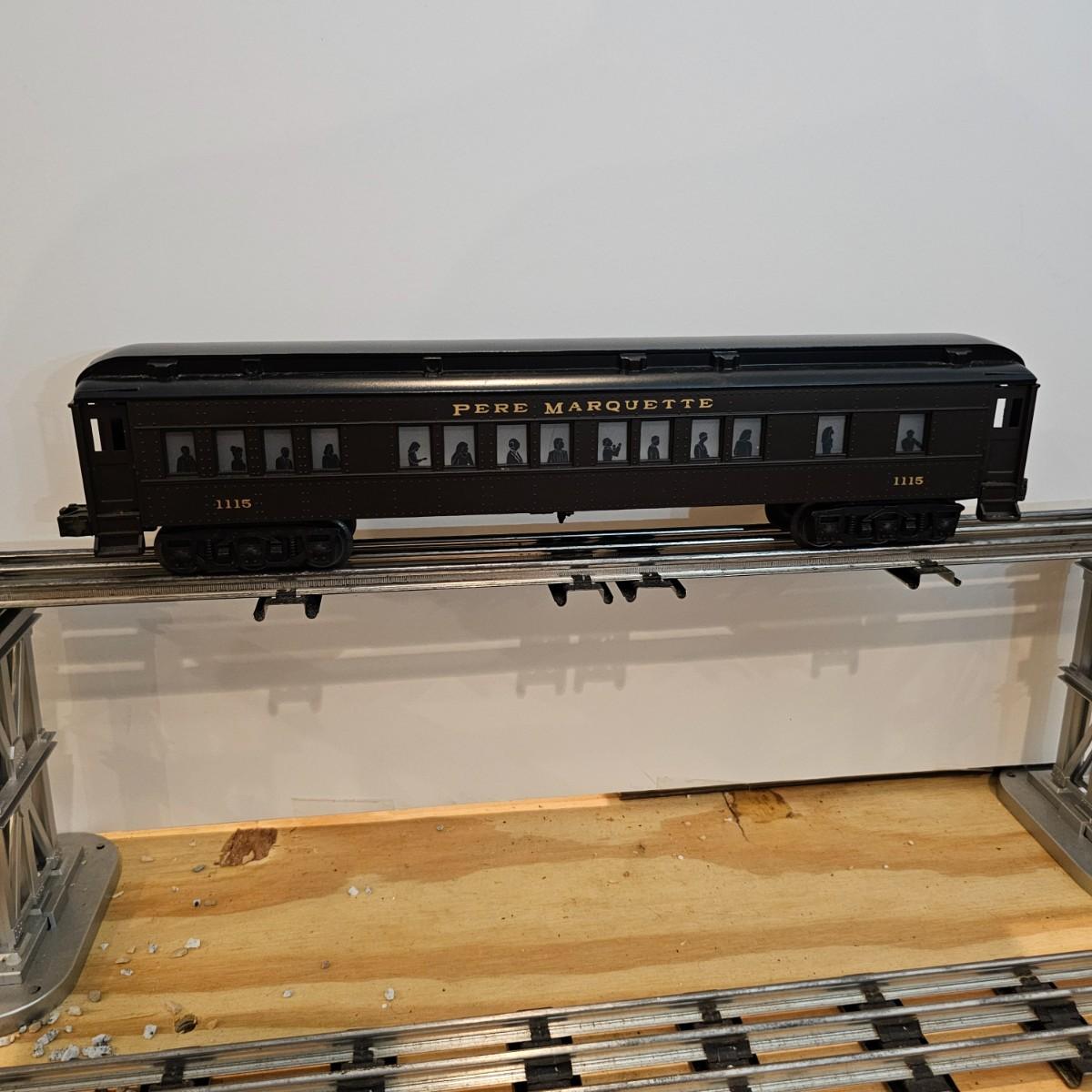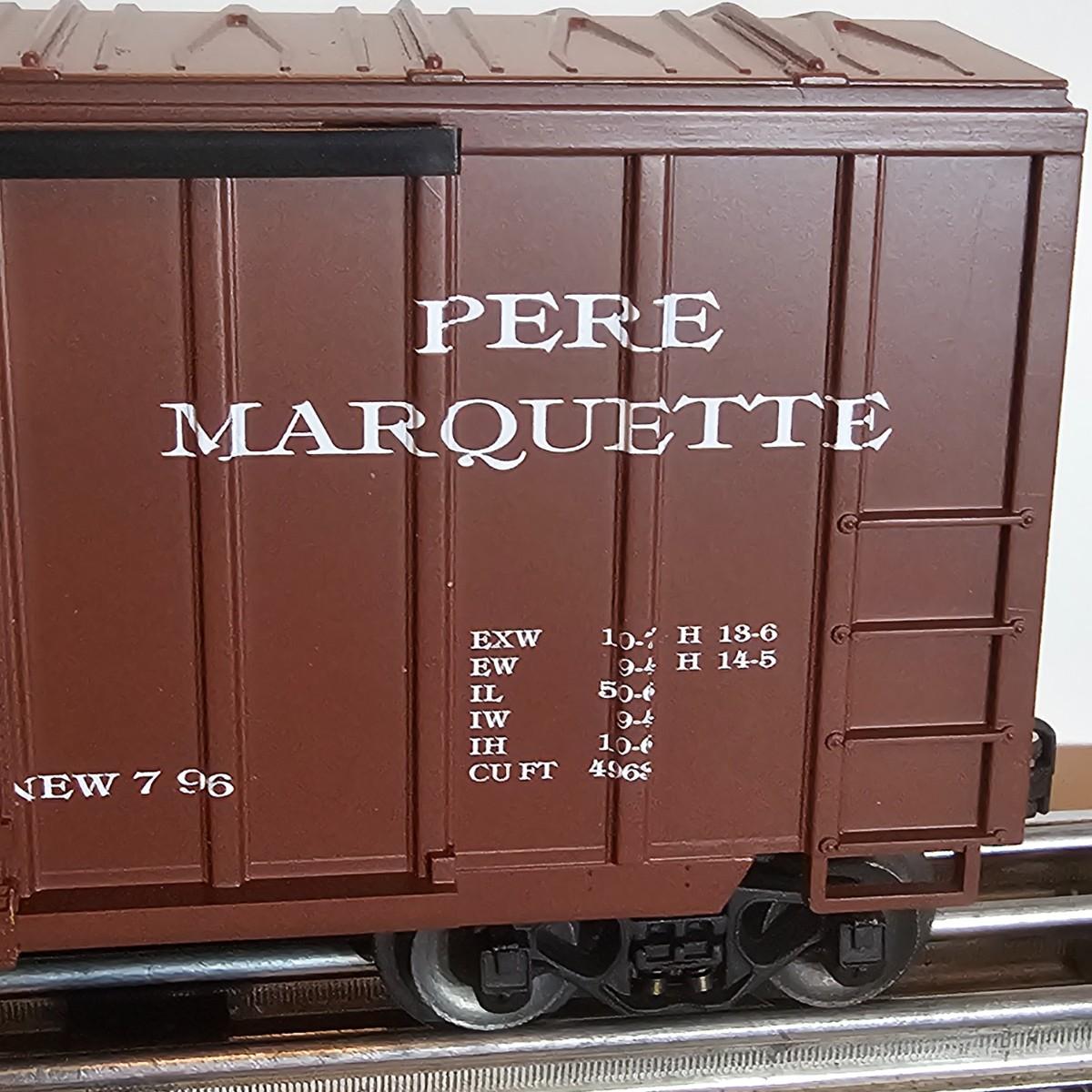 Beautiful Pere Marquette steam loco with lots of features. Lights, bell, whistle, chuff and more. Started and ran on layout. Also includes six coaches: two baggage cars, an observation car and three passenger cars. All cars illuminated but the baggage pair. Full length of train approximately 110". Also two double door boxcars. All items in original boxes, all Lionel. See photos for details. Shipping available. Please note that any price tag seen on an item was not put there by Sterling Transitions and does not reflect the current value of the item.