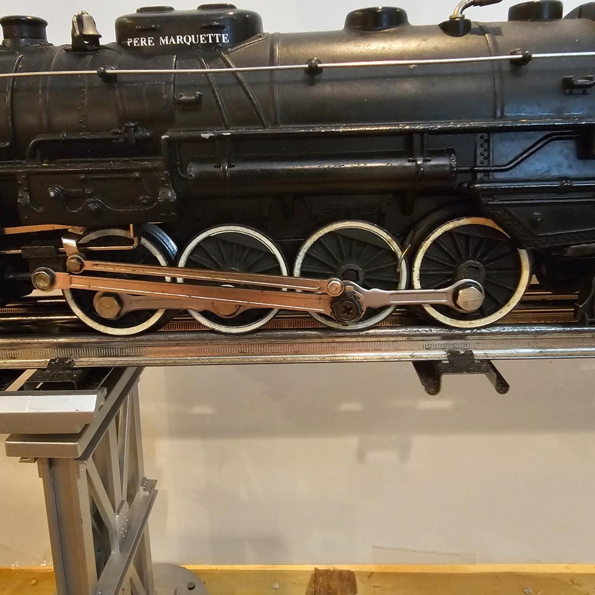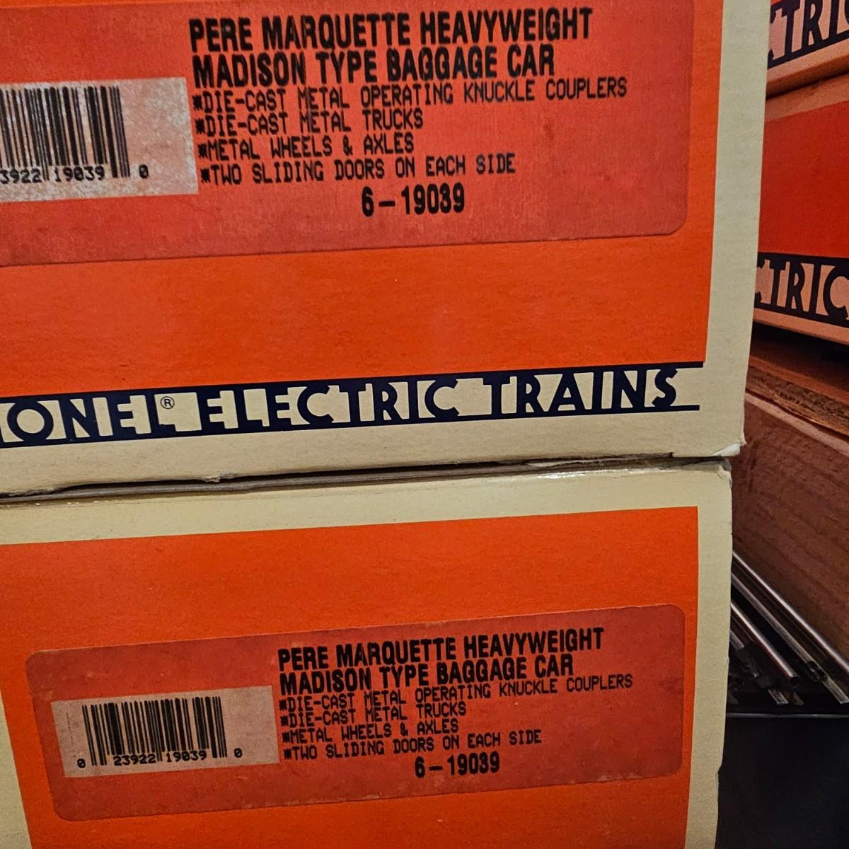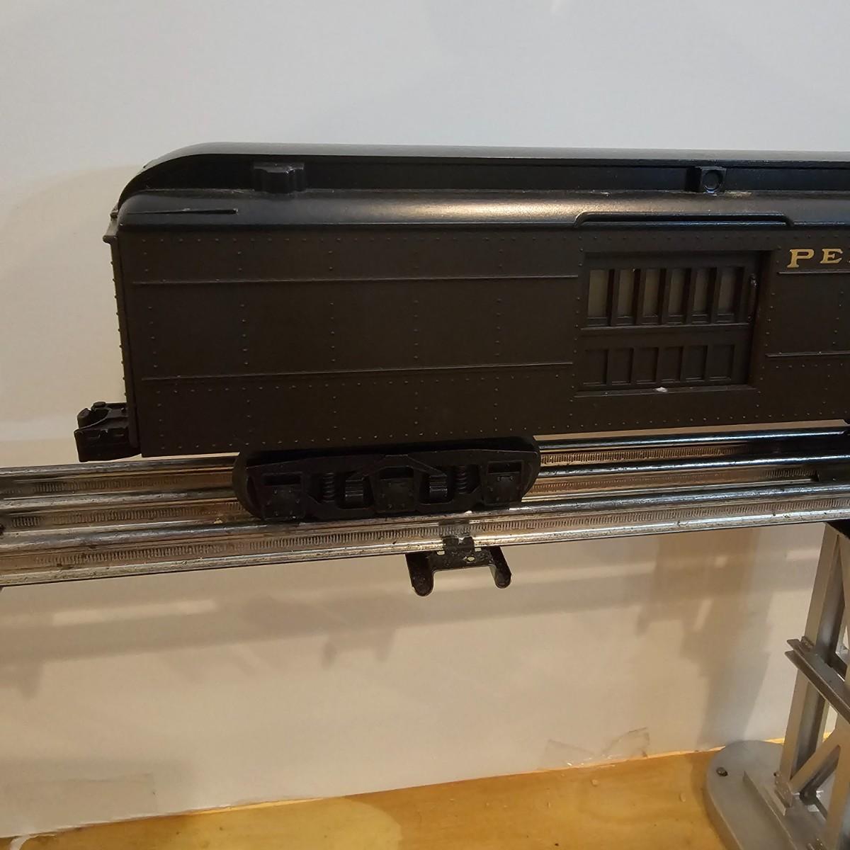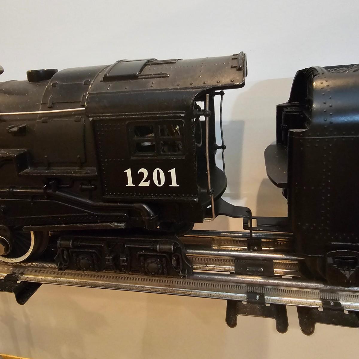 Beautiful Pere Marquette steam loco with lots of features. Lights, bell, whistle, chuff and more. Started and ran on layout. Also includes six coaches: two baggage cars, an observation car and three passenger cars. All cars illuminated but the baggage pair. Full length of train approximately 110". Also two double door boxcars. All items in original boxes, all Lionel. See photos for details. Shipping available. Please note that any price tag seen on an item was not put there by Sterling Transitions and does not reflect the current value of the item.