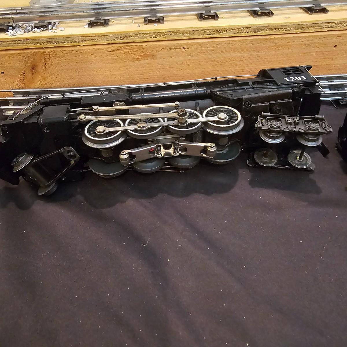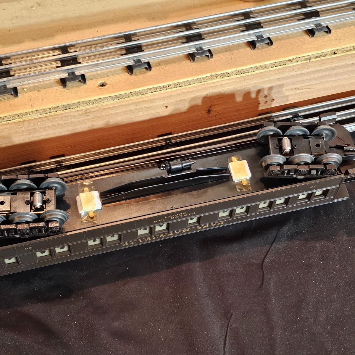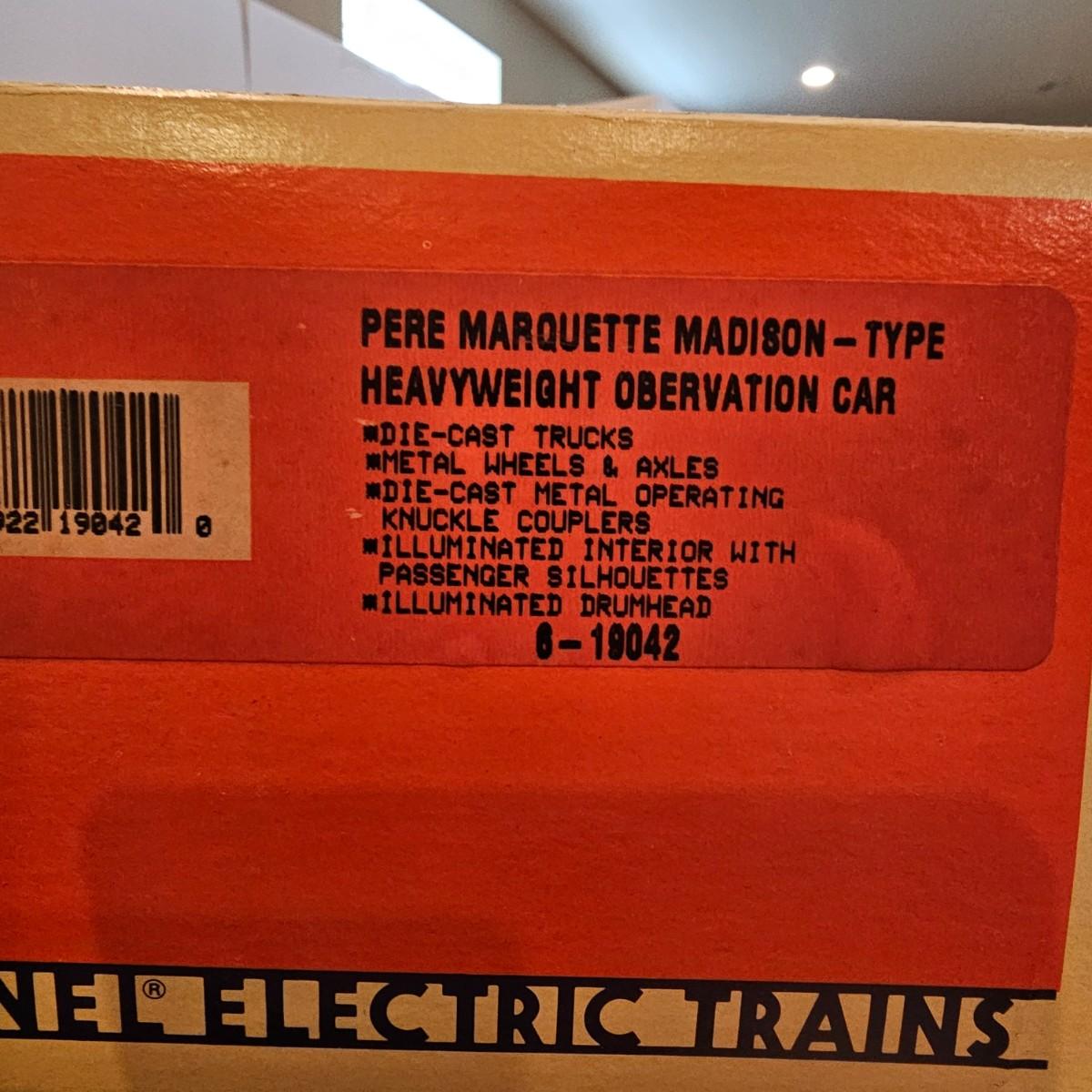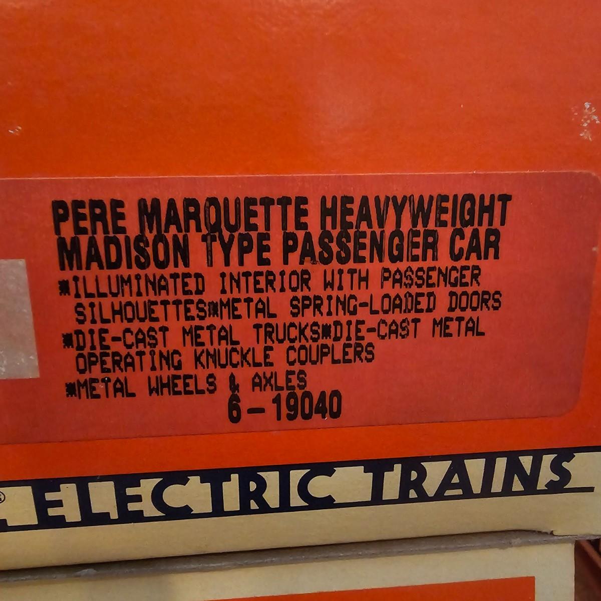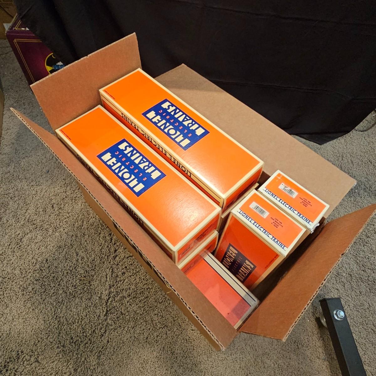 Beautiful Pere Marquette steam loco with lots of features. Lights, bell, whistle, chuff and more. Started and ran on layout. Also includes six coaches: two baggage cars, an observation car and three passenger cars. All cars illuminated but the baggage pair. Full length of train approximately 110". Also two double door boxcars. All items in original boxes, all Lionel. See photos for details. Shipping available. Please note that any price tag seen on an item was not put there by Sterling Transitions and does not reflect the current value of the item.