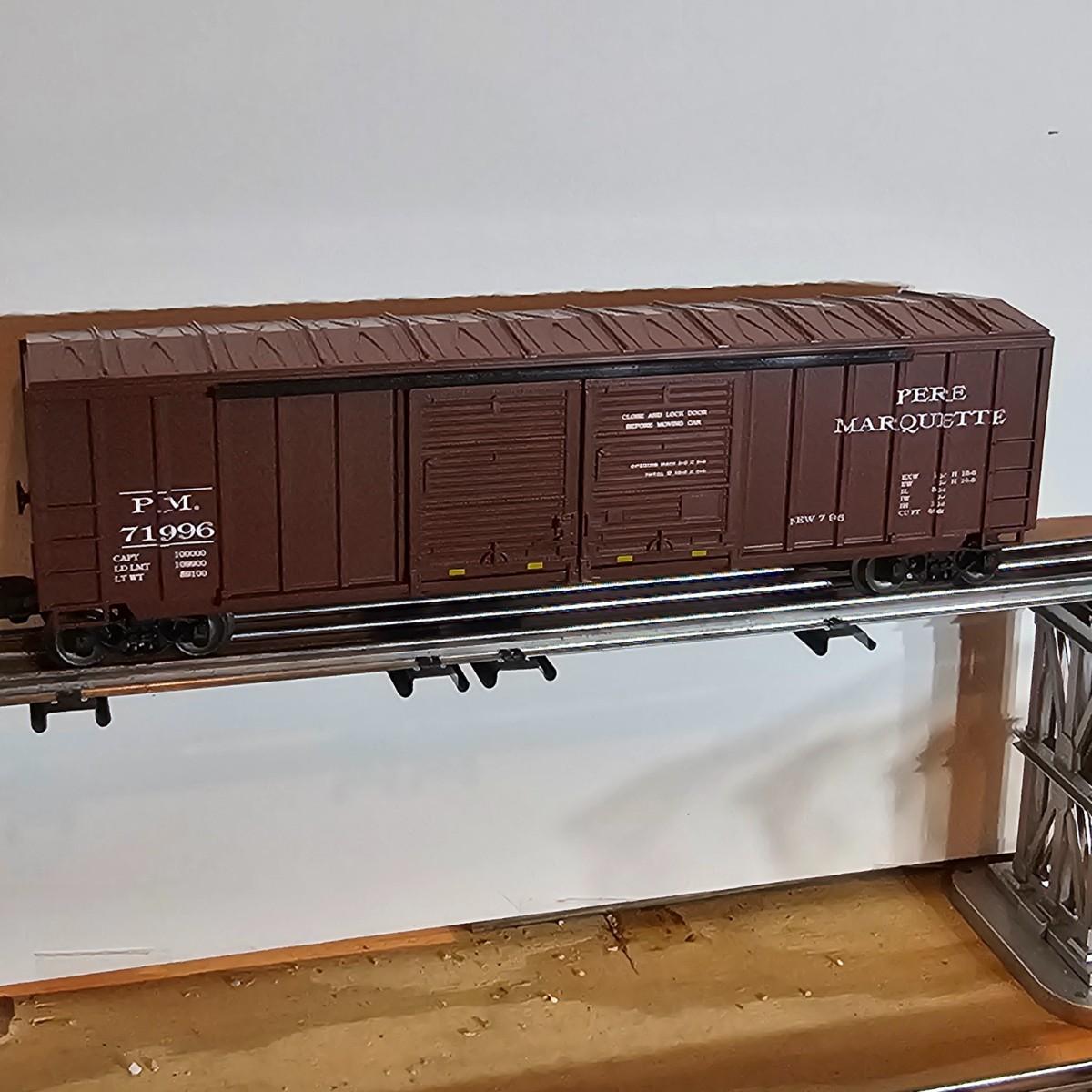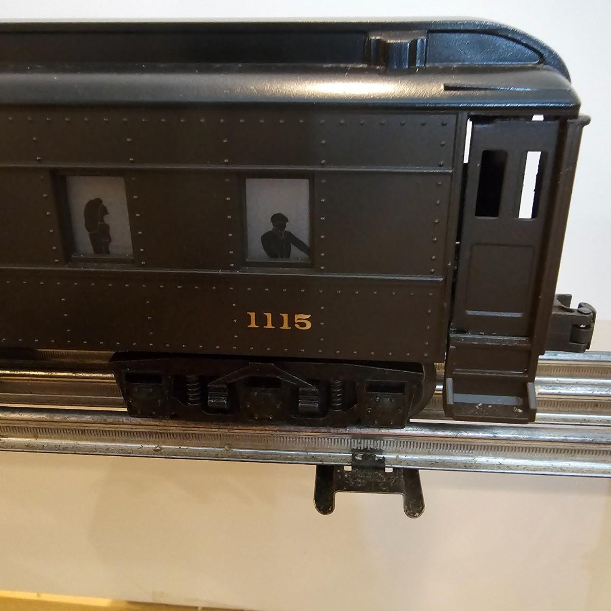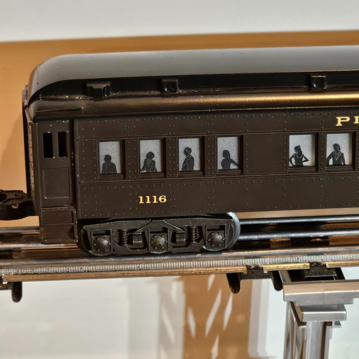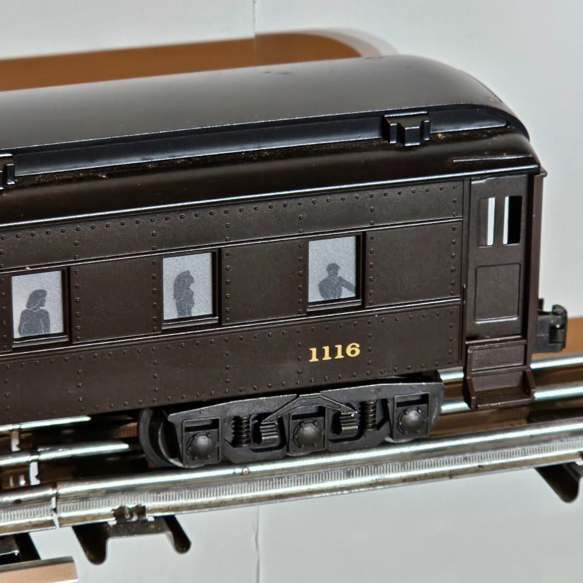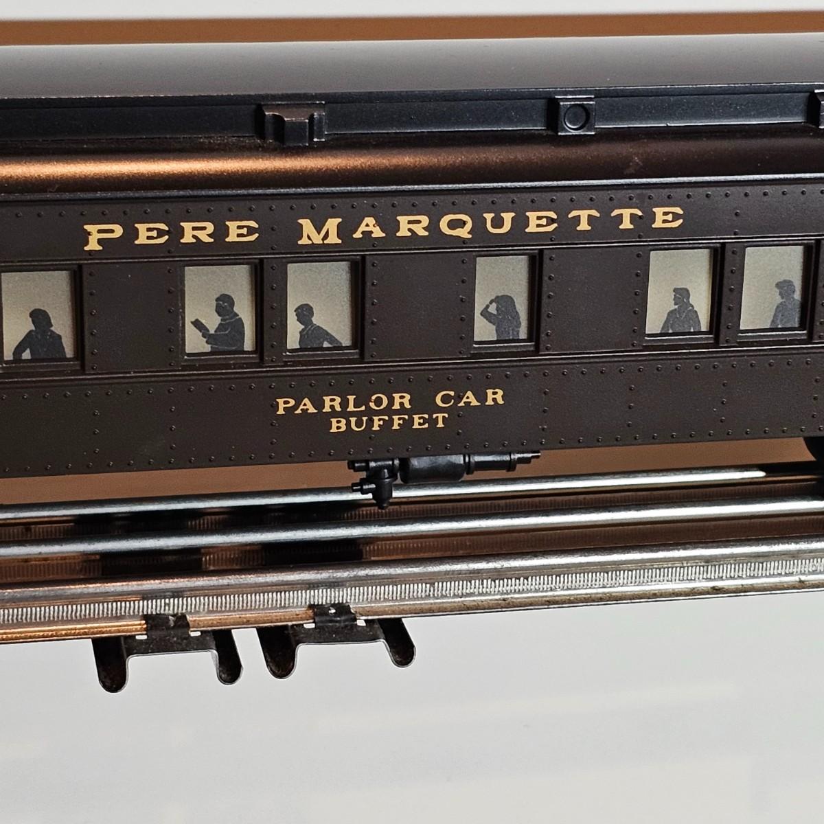 Beautiful Pere Marquette steam loco with lots of features. Lights, bell, whistle, chuff and more. Started and ran on layout. Also includes six coaches: two baggage cars, an observation car and three passenger cars. All cars illuminated but the baggage pair. Full length of train approximately 110". Also two double door boxcars. All items in original boxes, all Lionel. See photos for details. Shipping available. Please note that any price tag seen on an item was not put there by Sterling Transitions and does not reflect the current value of the item.