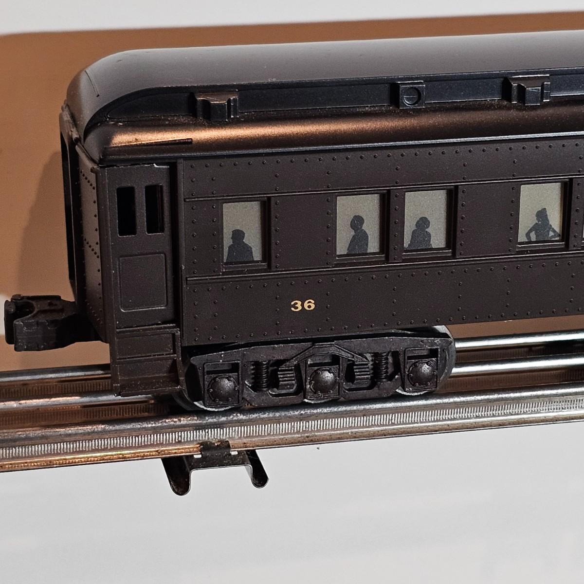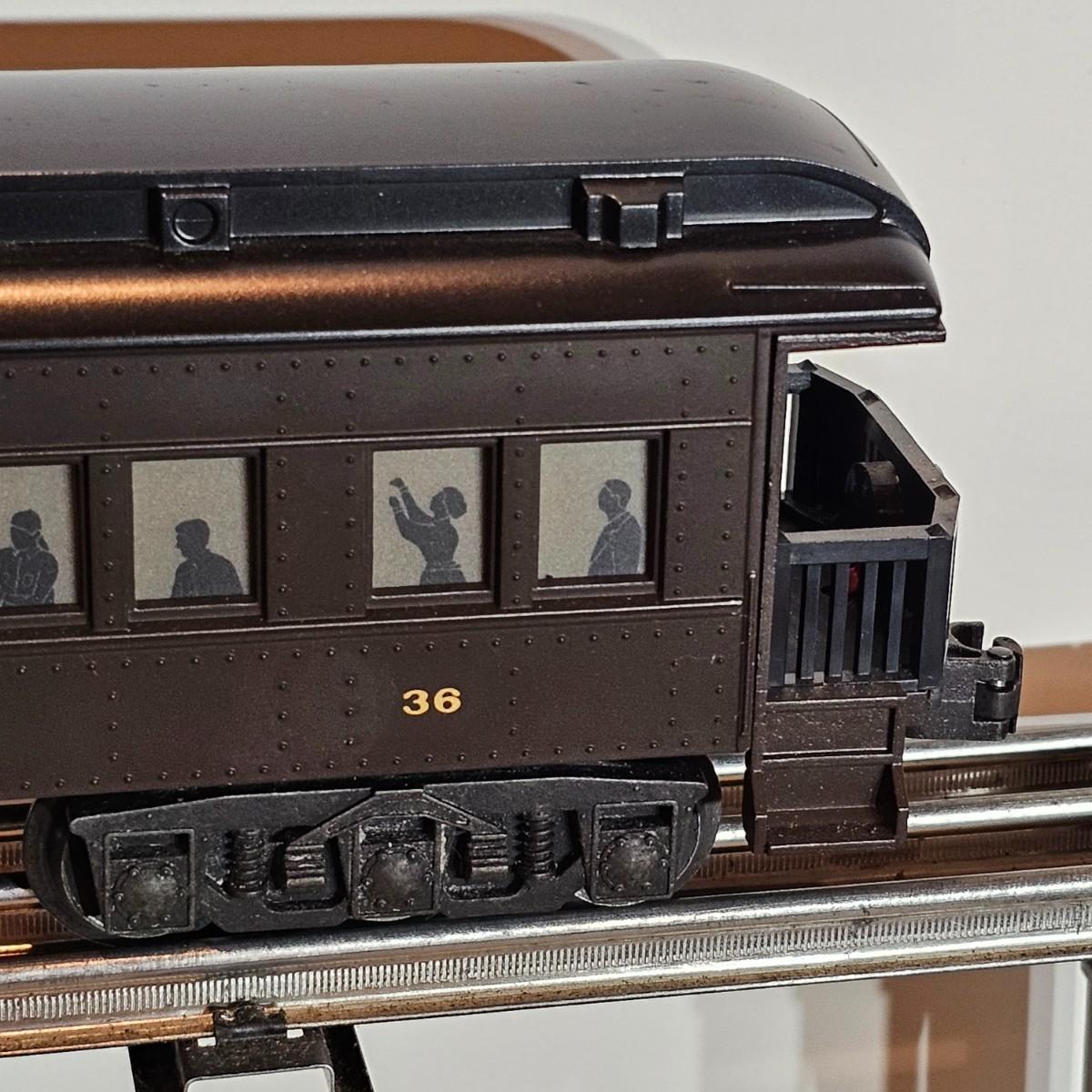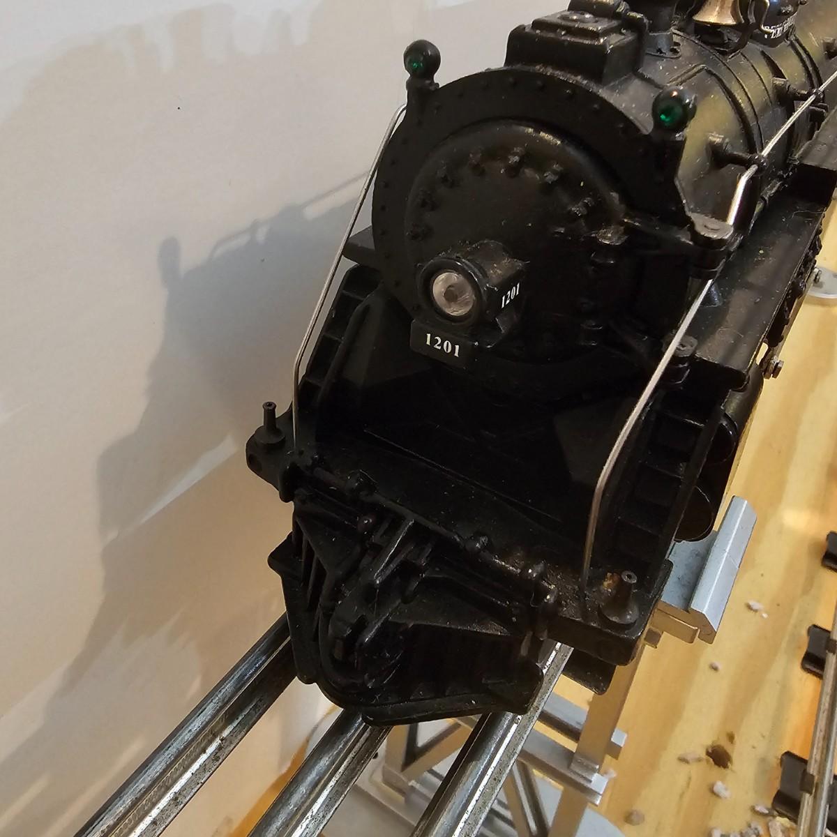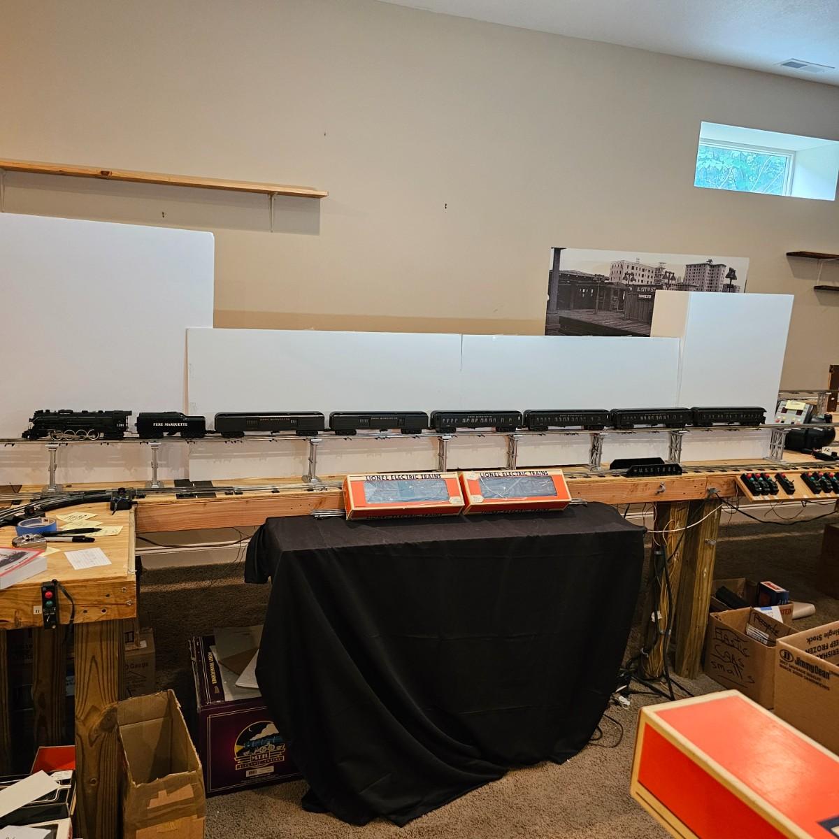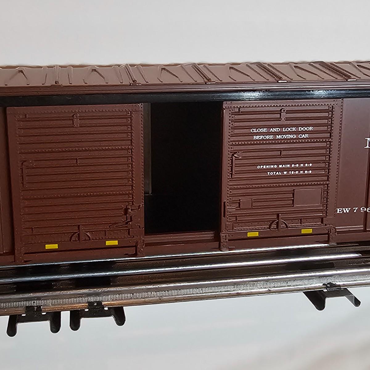 Beautiful Pere Marquette steam loco with lots of features. Lights, bell, whistle, chuff and more. Started and ran on layout. Also includes six coaches: two baggage cars, an observation car and three passenger cars. All cars illuminated but the baggage pair. Full length of train approximately 110". Also two double door boxcars. All items in original boxes, all Lionel. See photos for details. Shipping available. Please note that any price tag seen on an item was not put there by Sterling Transitions and does not reflect the current value of the item.
