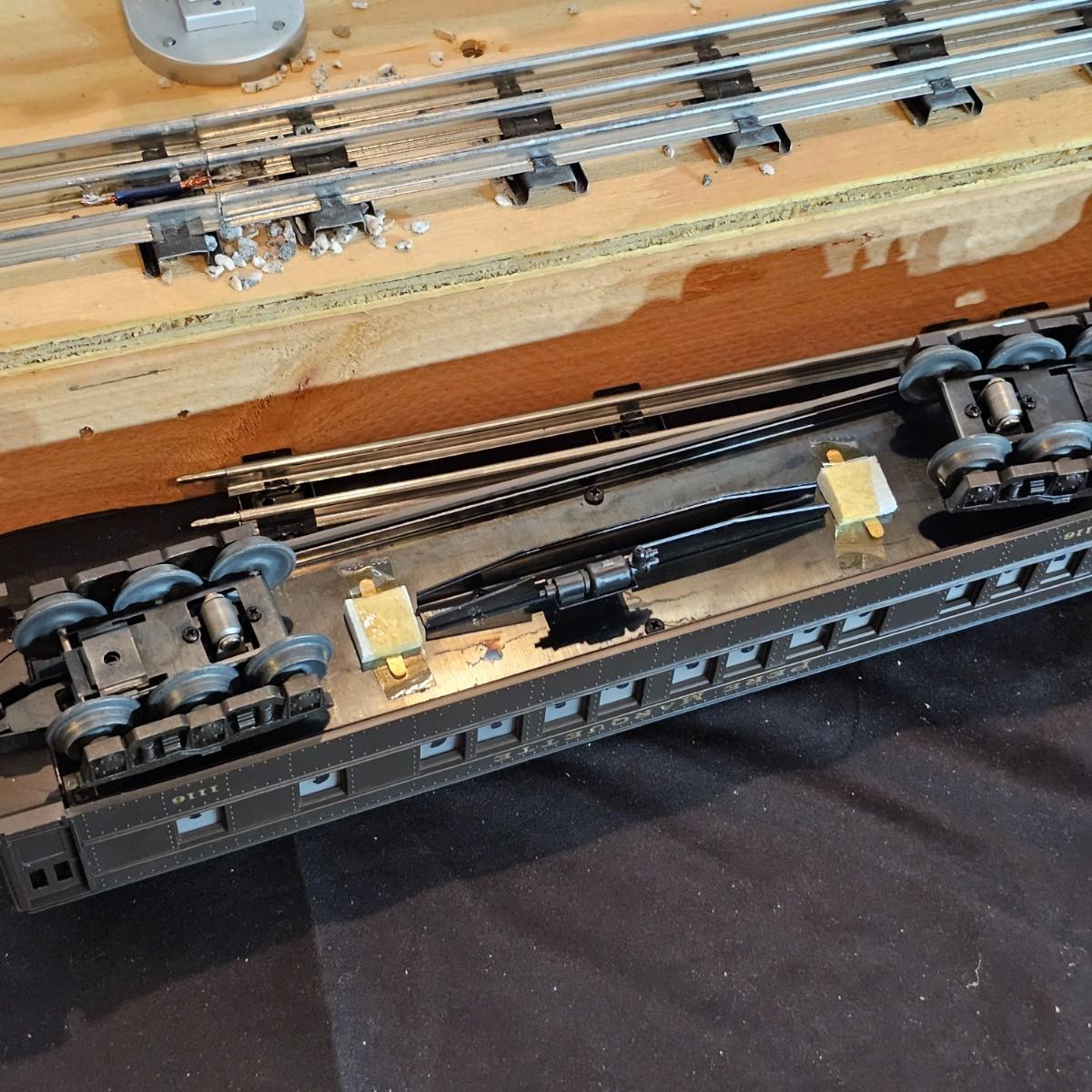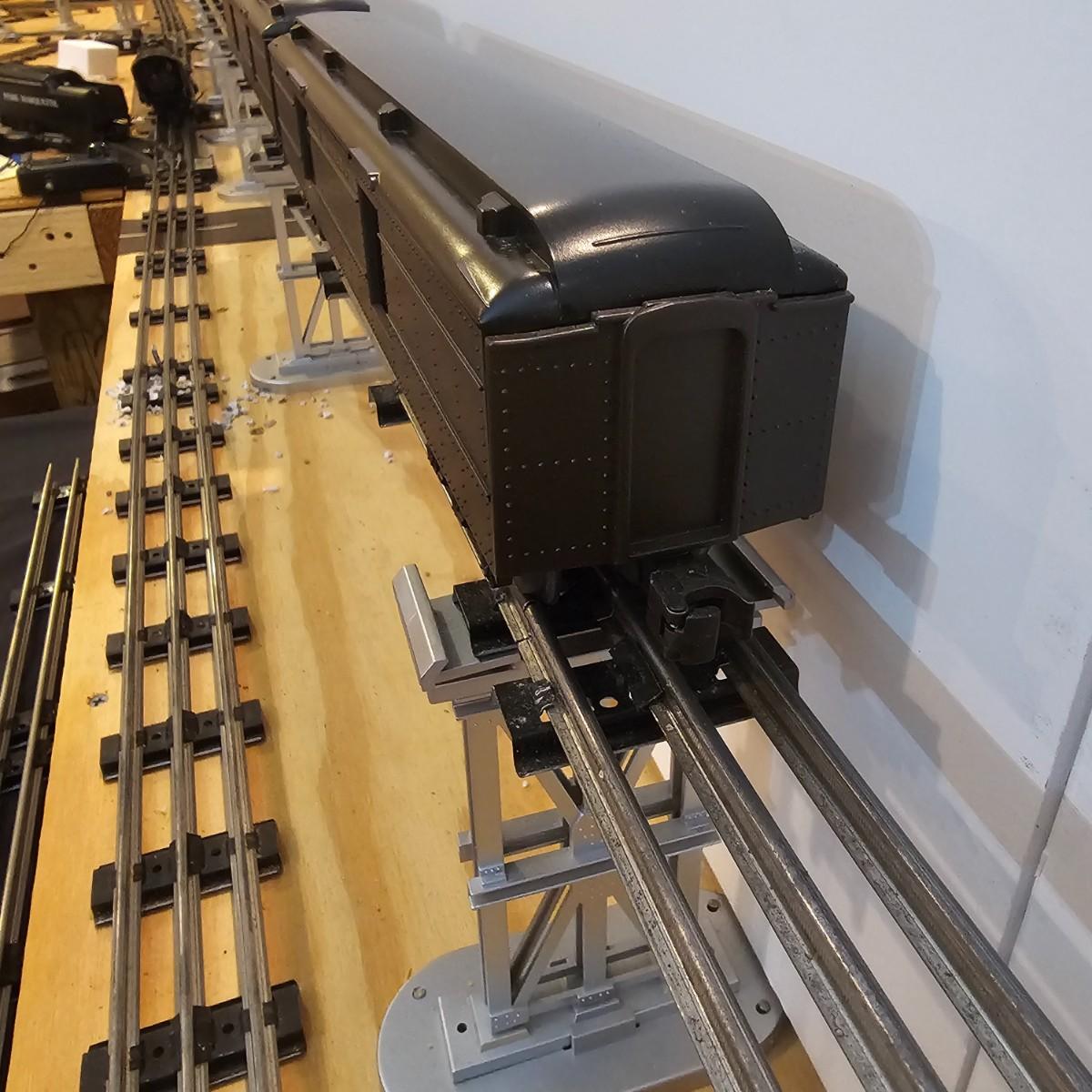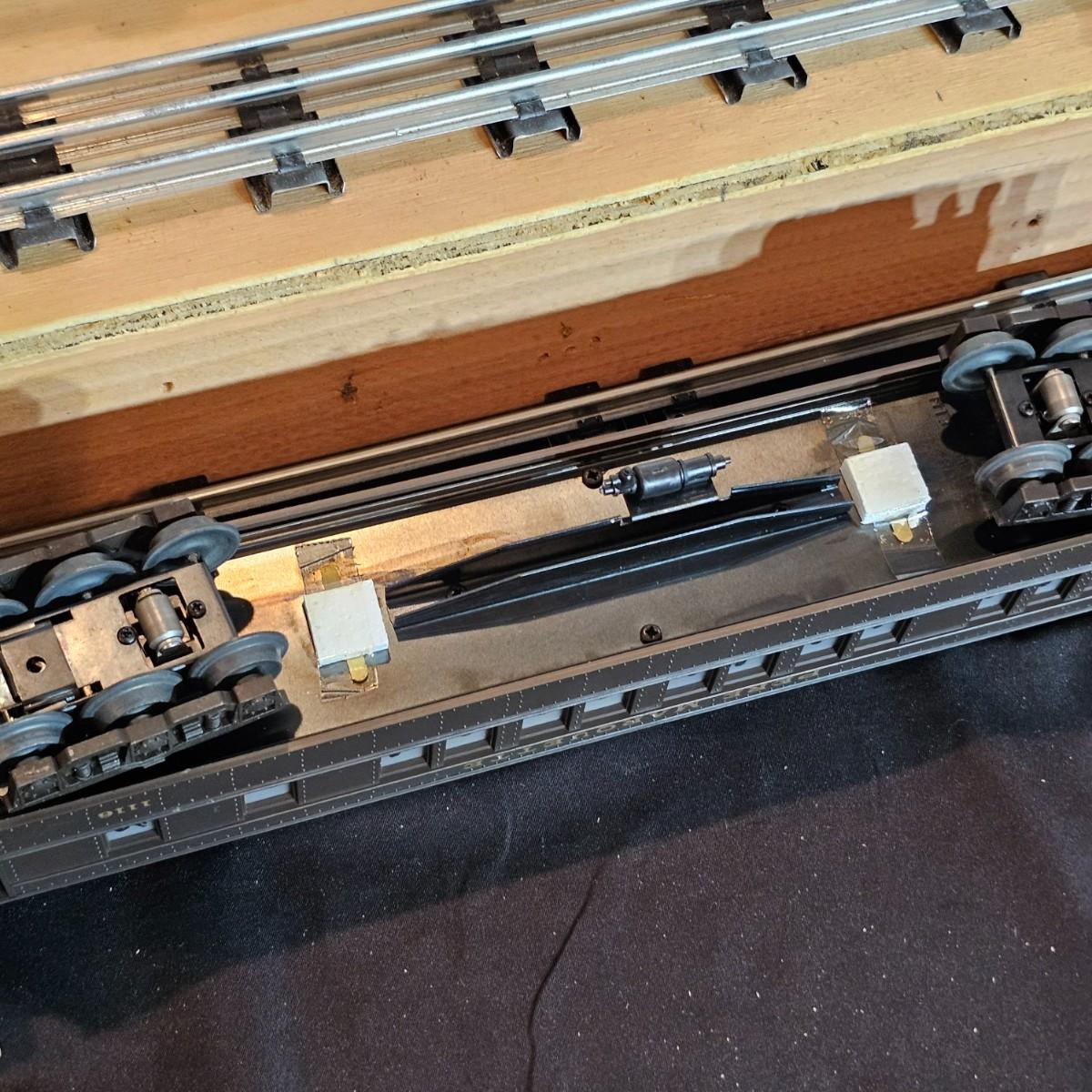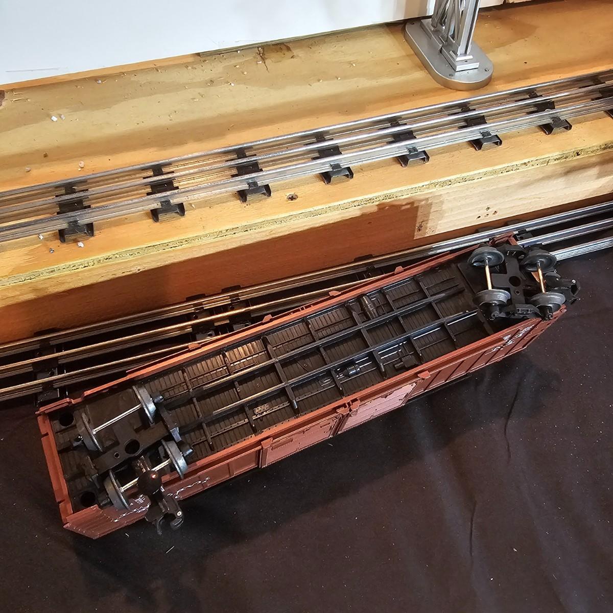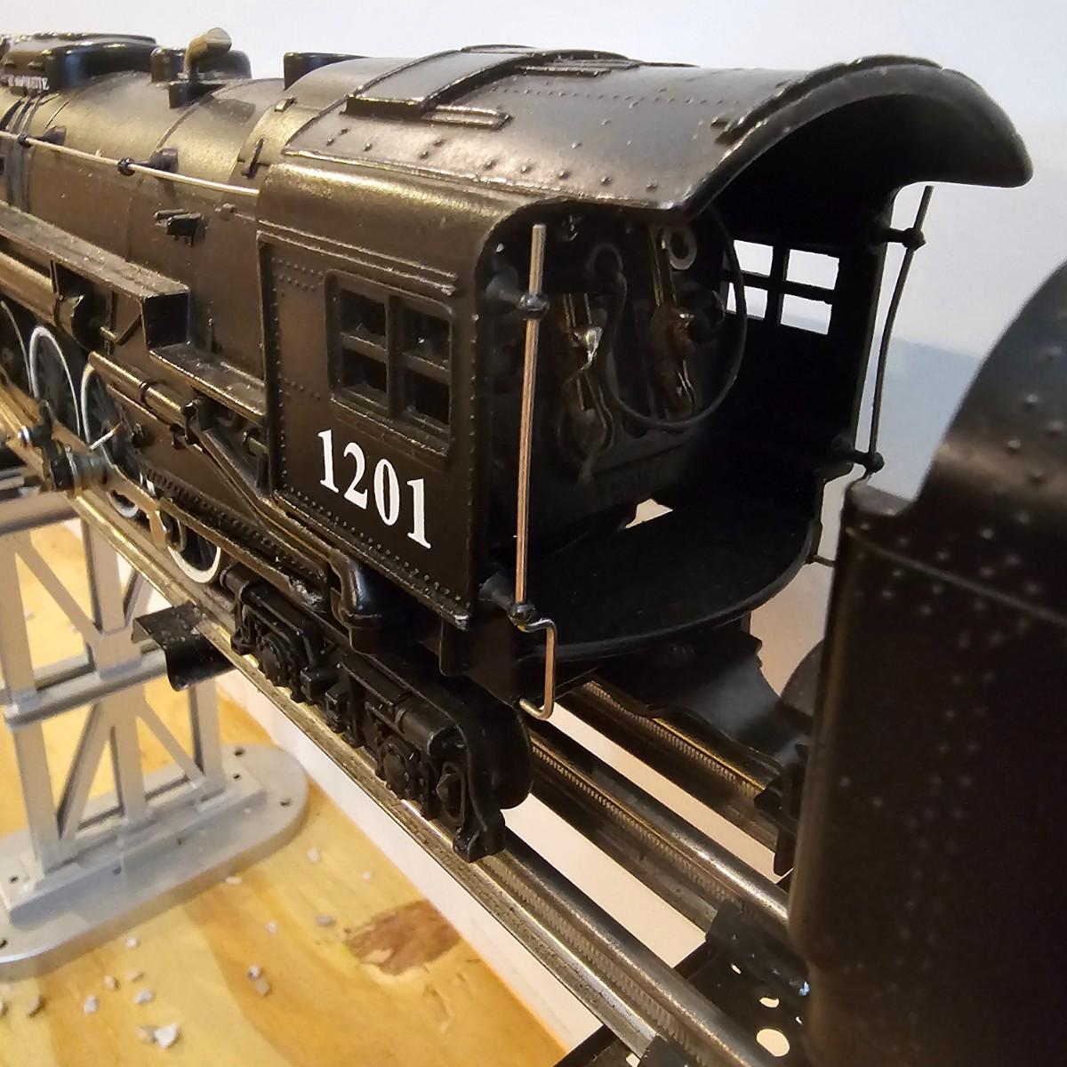 Beautiful Pere Marquette steam loco with lots of features. Lights, bell, whistle, chuff and more. Started and ran on layout. Also includes six coaches: two baggage cars, an observation car and three passenger cars. All cars illuminated but the baggage pair. Full length of train approximately 110". Also two double door boxcars. All items in original boxes, all Lionel. See photos for details. Shipping available. Please note that any price tag seen on an item was not put there by Sterling Transitions and does not reflect the current value of the item.
