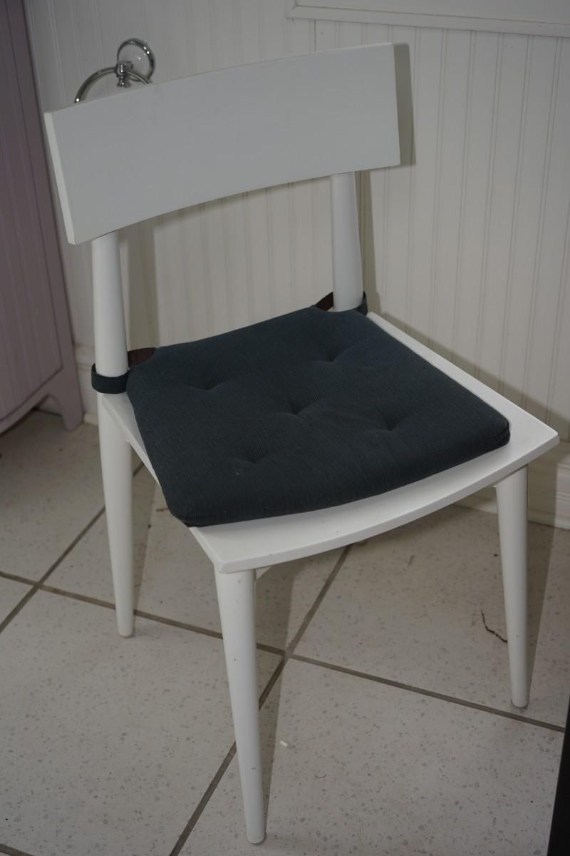 nice black finish on this square top kitchen table with two wooden painted white chairs. Black cushions to accent.