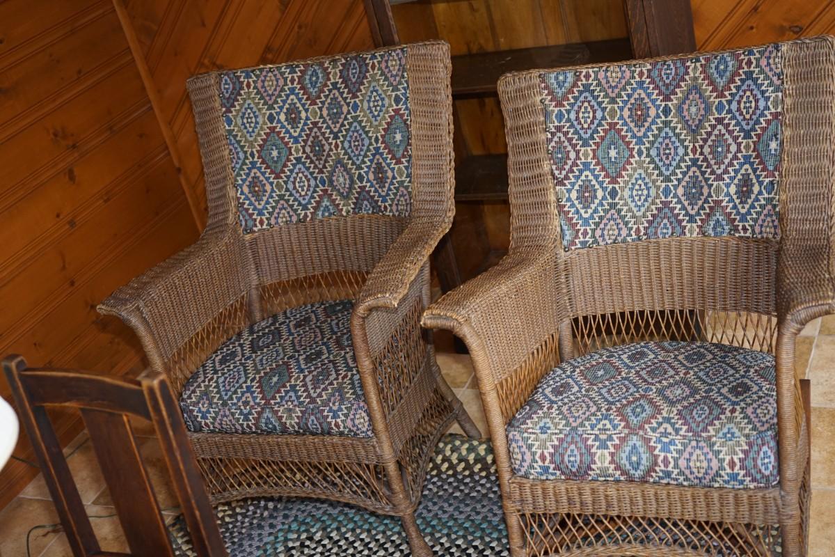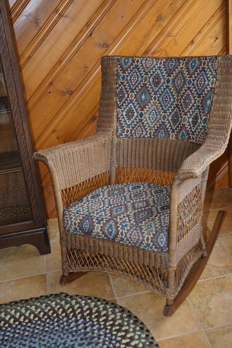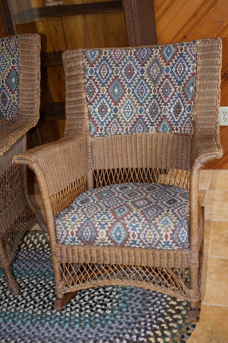 PERFECT VINTAGE DUO FOR THE PORCH OR HOME. VINTAGE WICKER ROCKERS OF NATURAL TONE & SOUTHWEST FABRIC SEATS &BACK