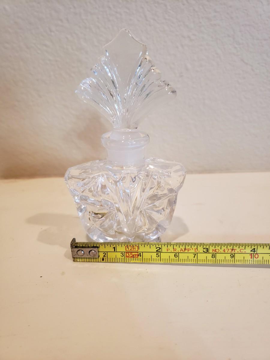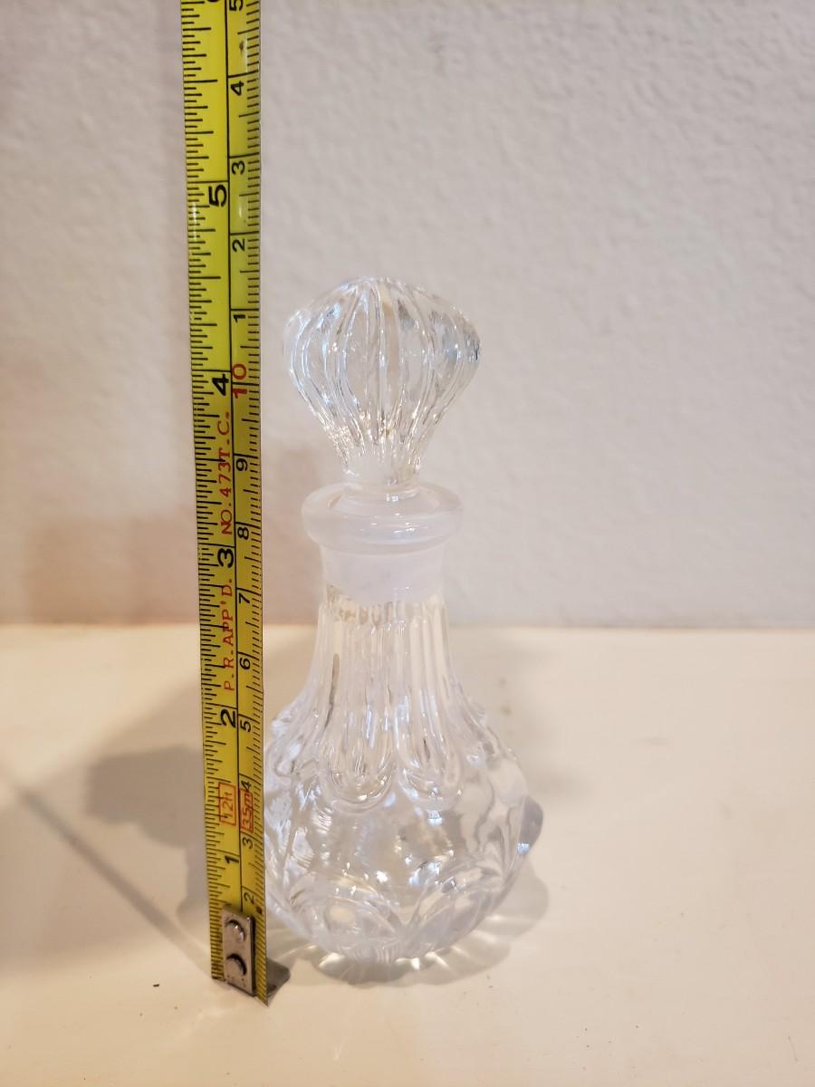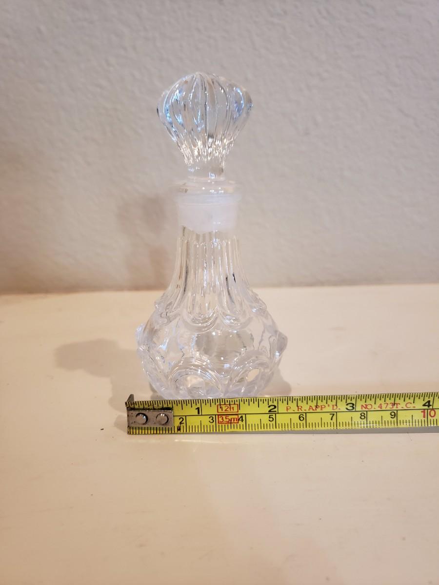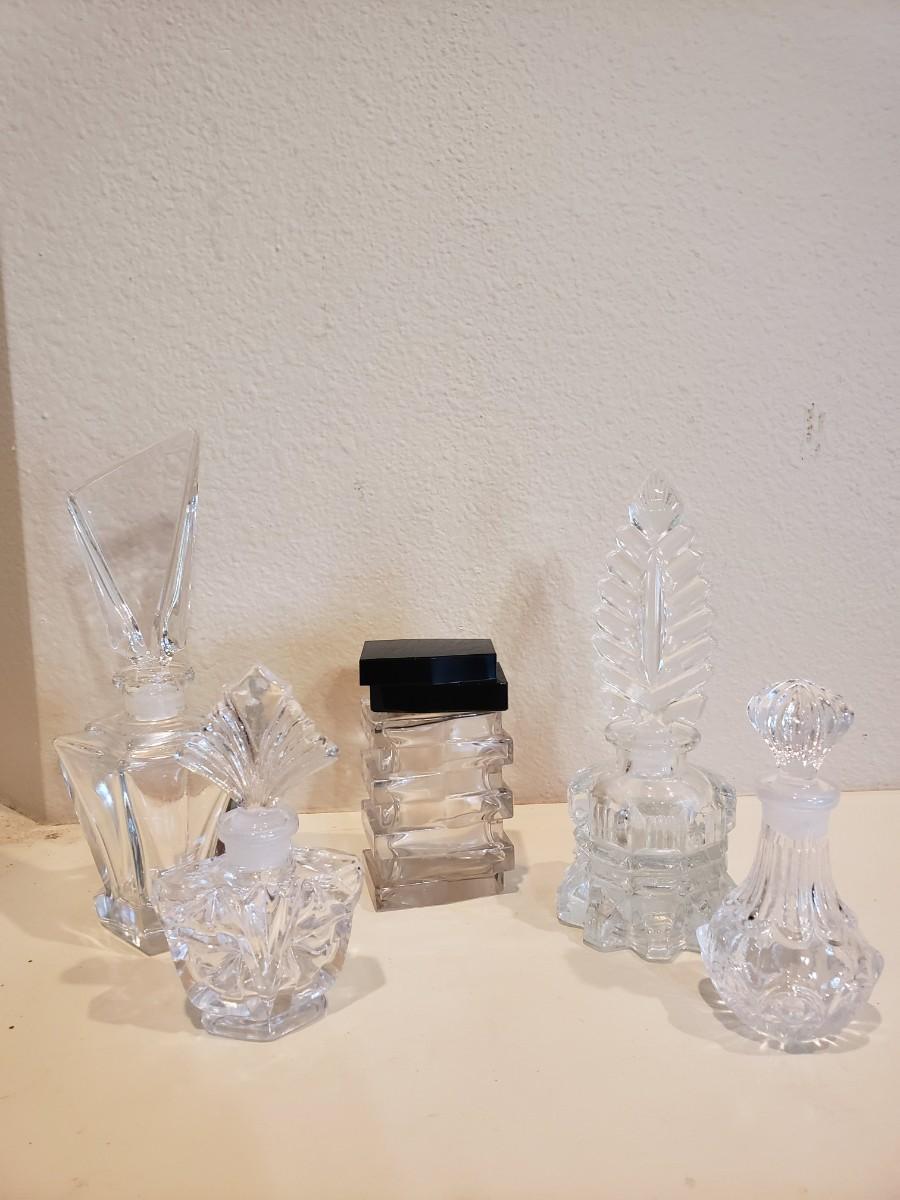 Lot #3 of clear glass perfume bottles. 4 bottles with stoppers & one screw cap.
