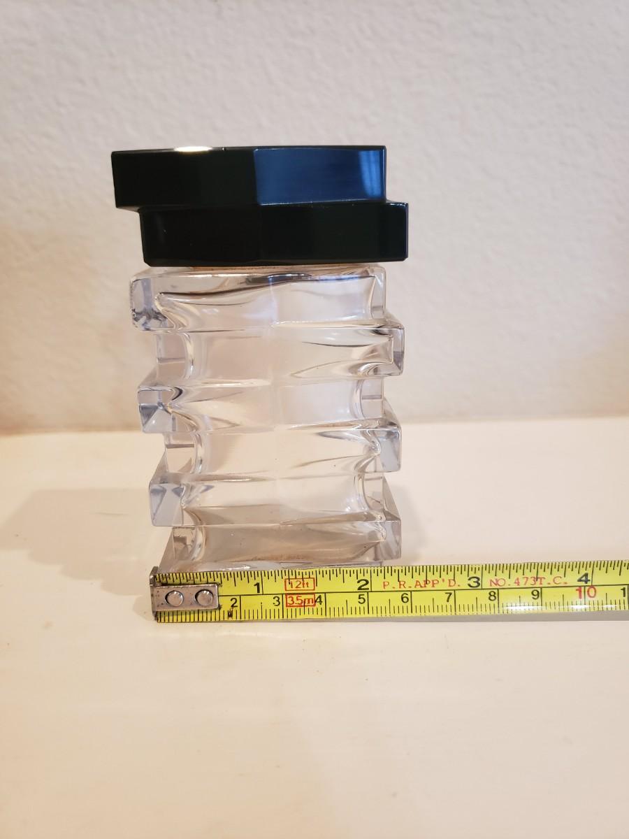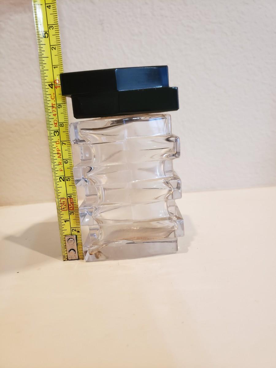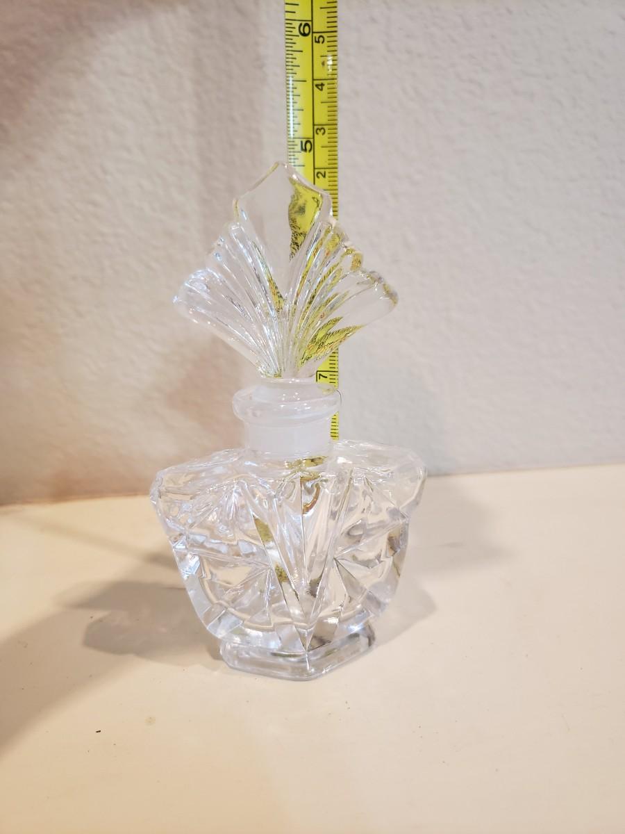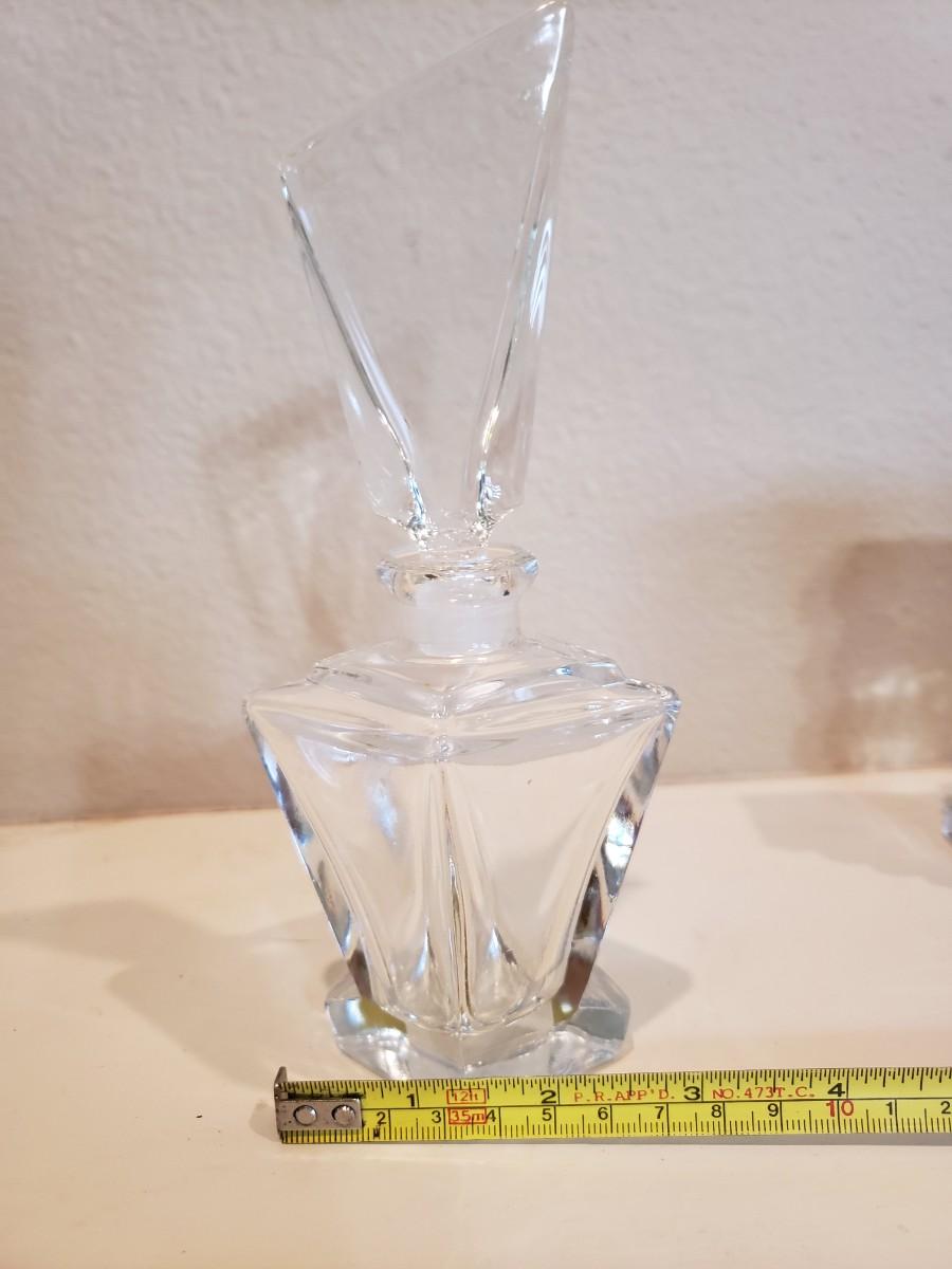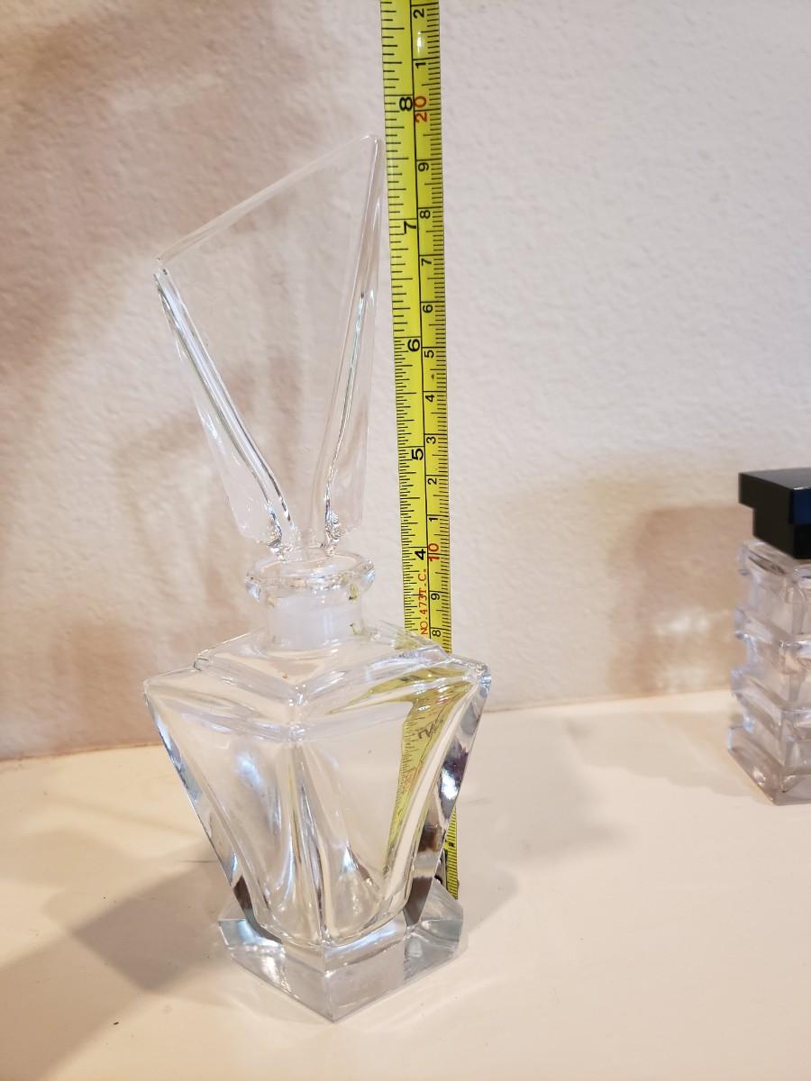 Lot #3 of clear glass perfume bottles. 4 bottles with stoppers & one screw cap.