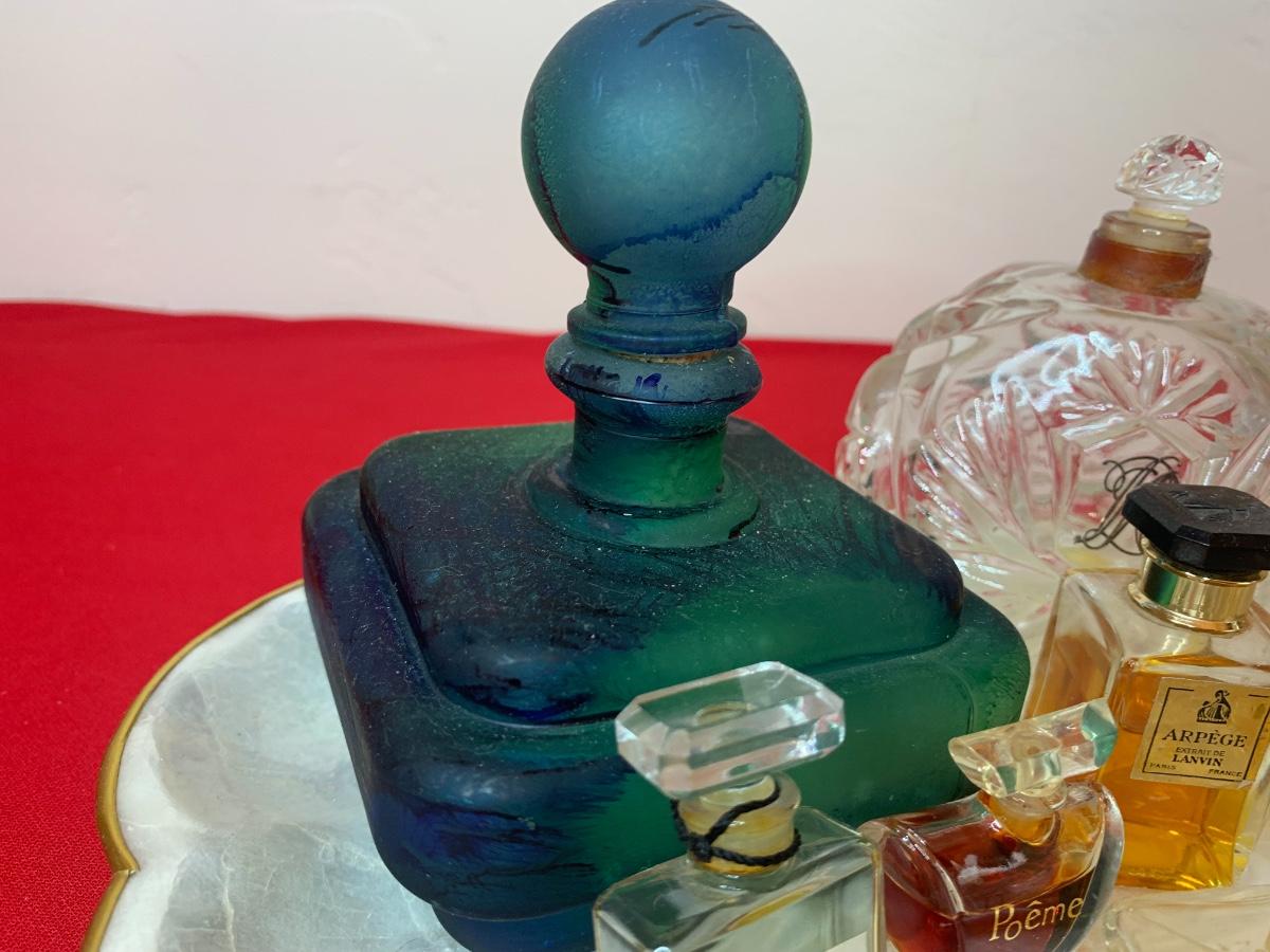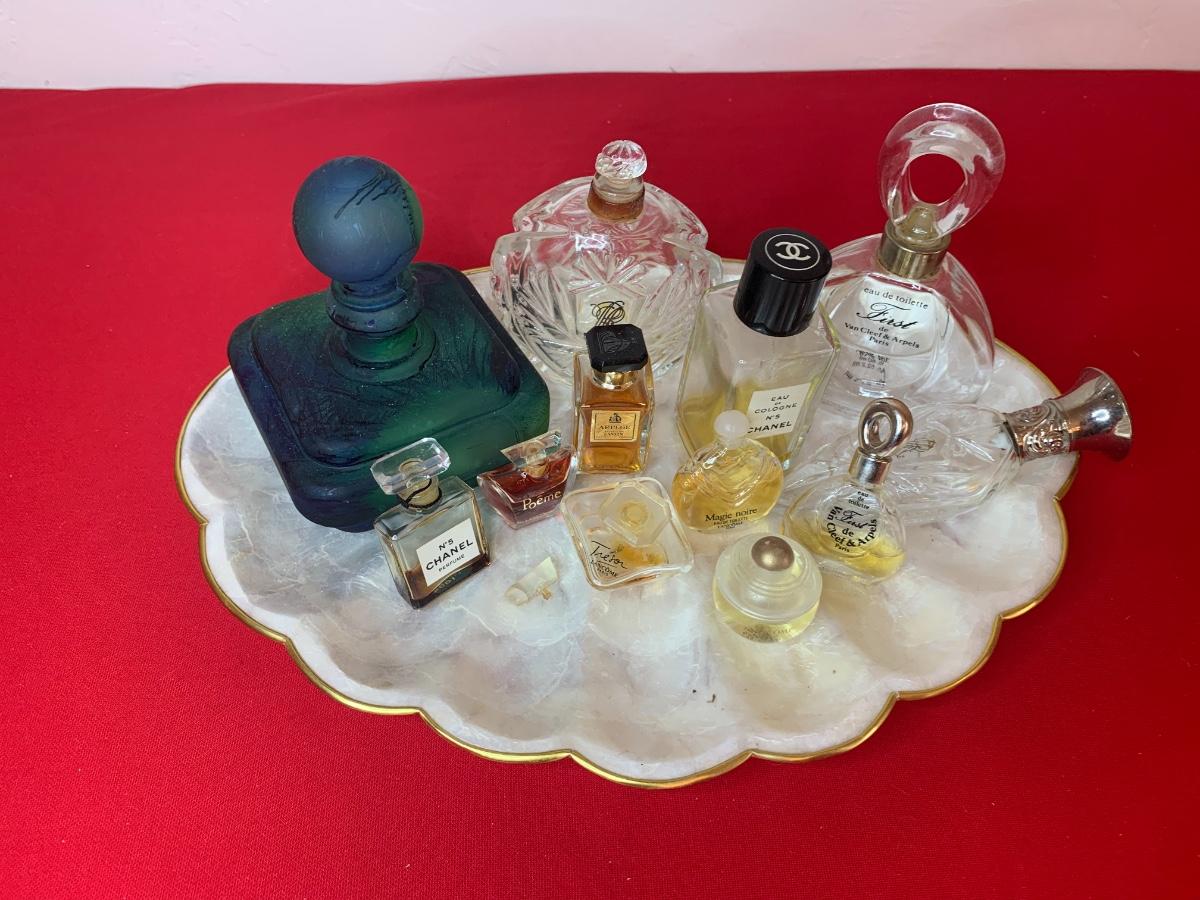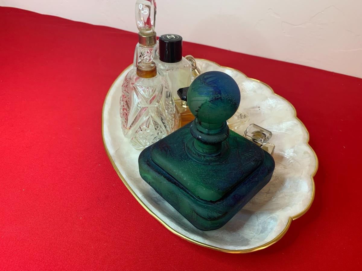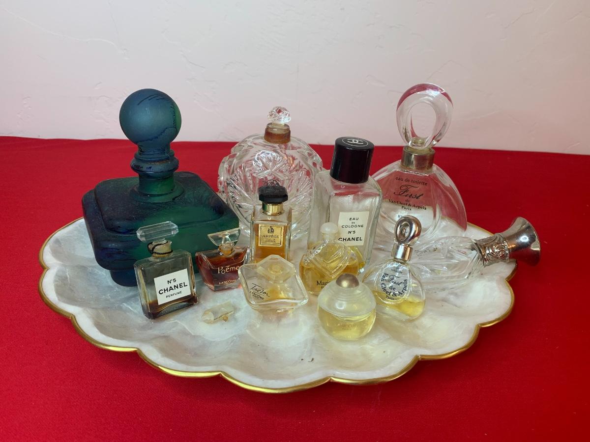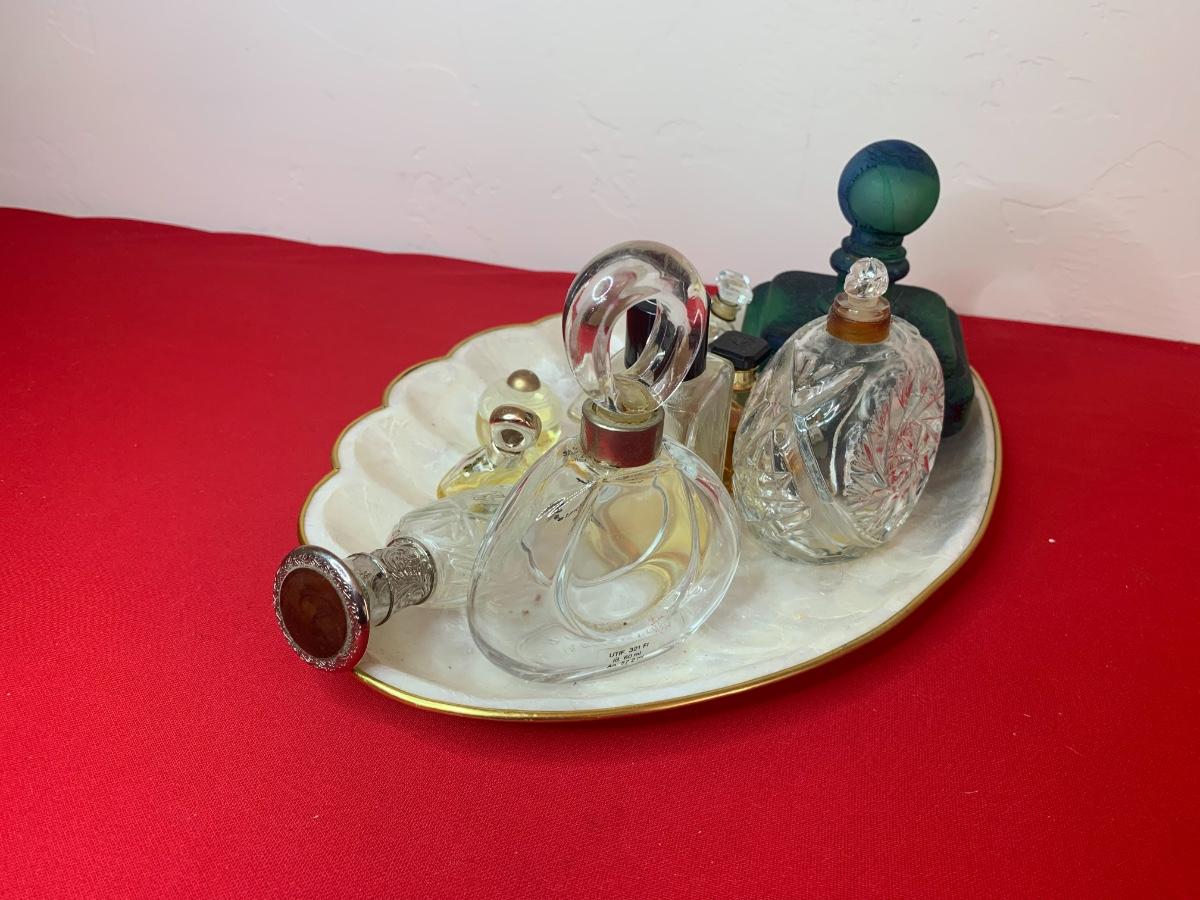 Collection of vintage perfume bottles on a Capiz shell tray