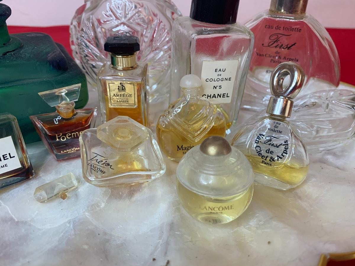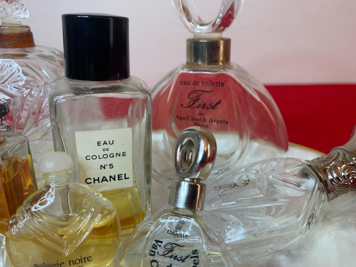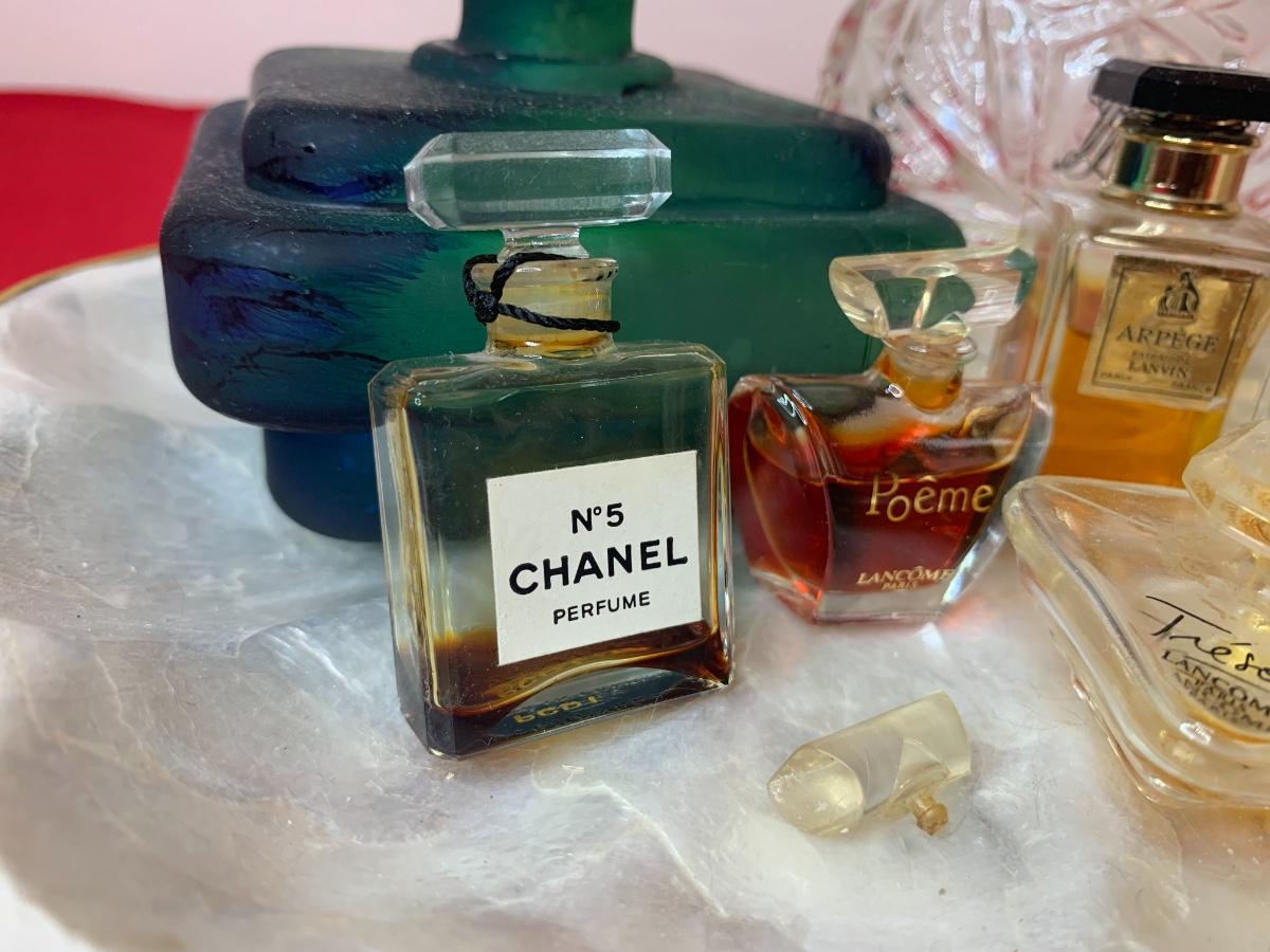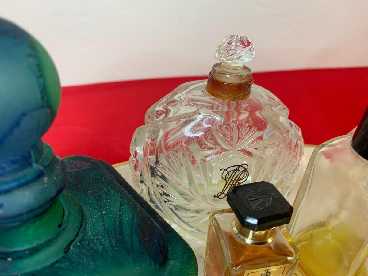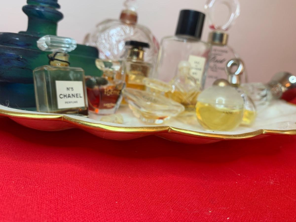 Collection of vintage perfume bottles on a Capiz shell tray