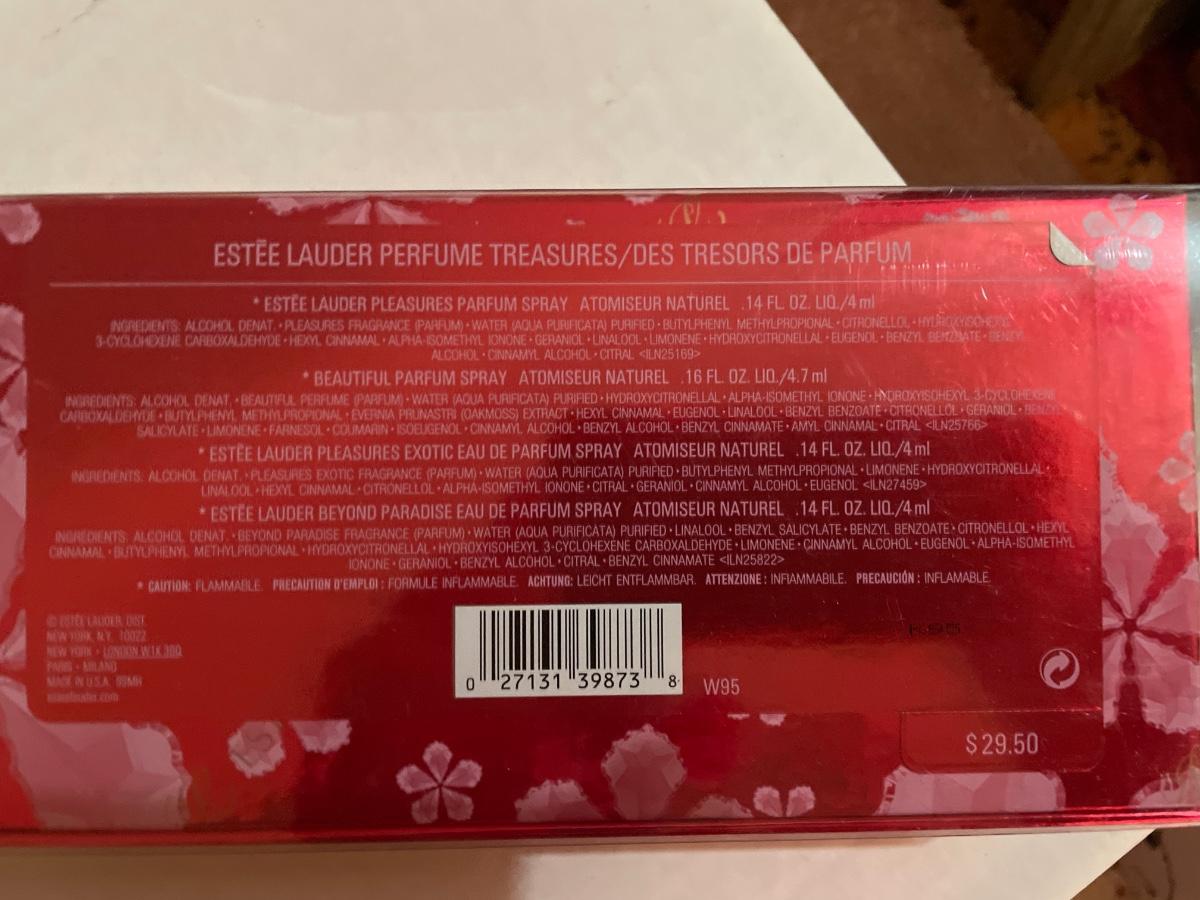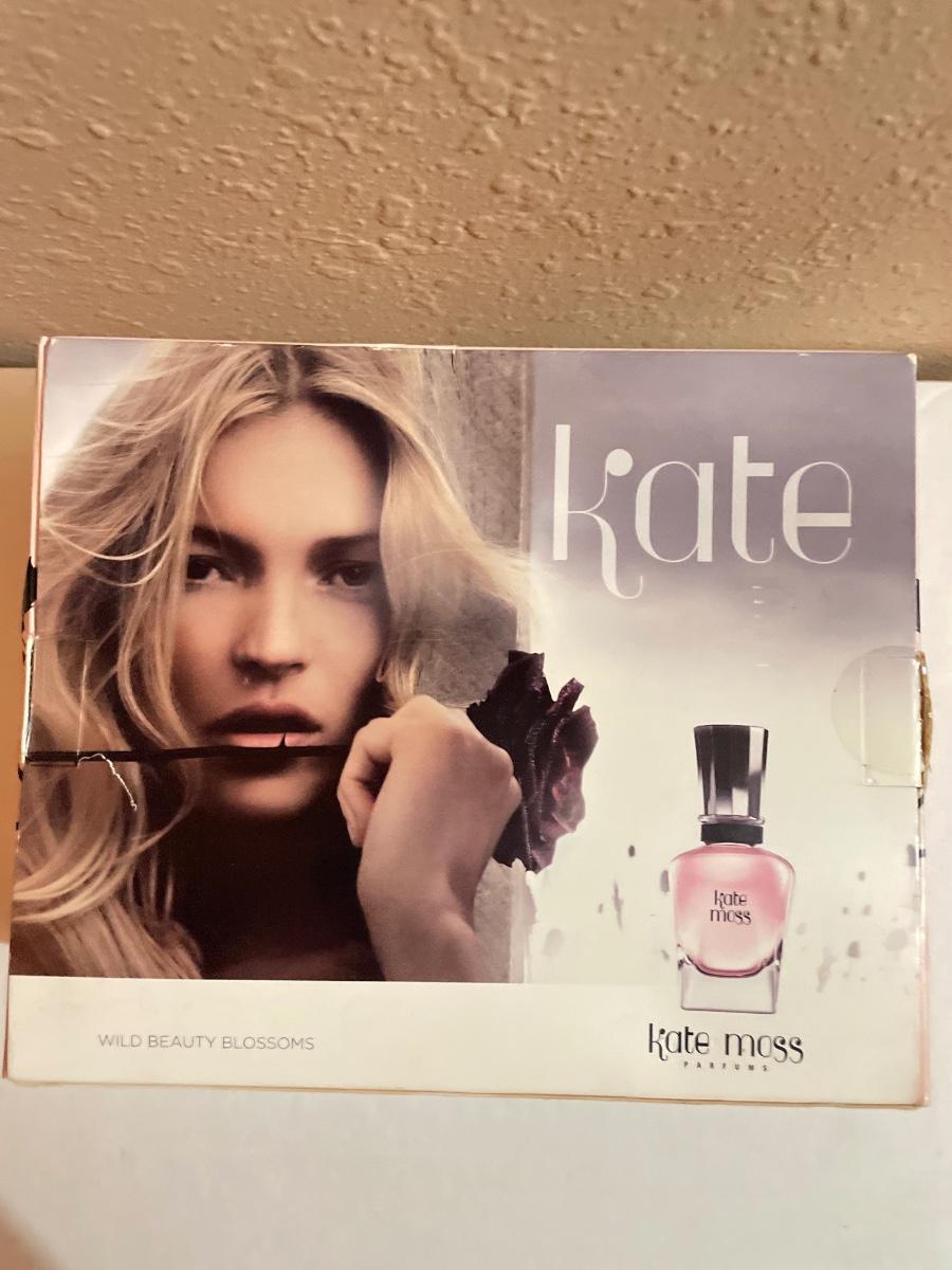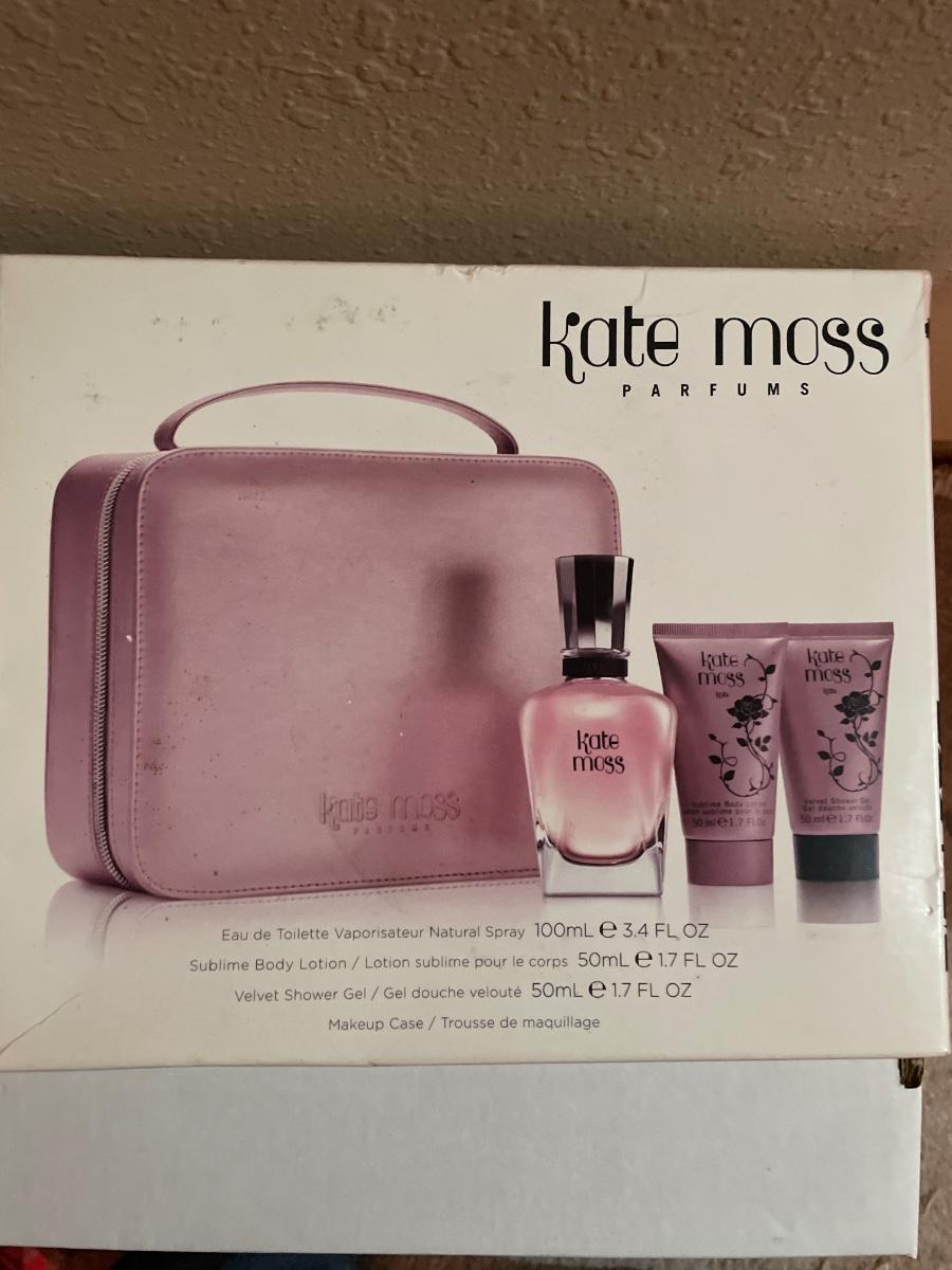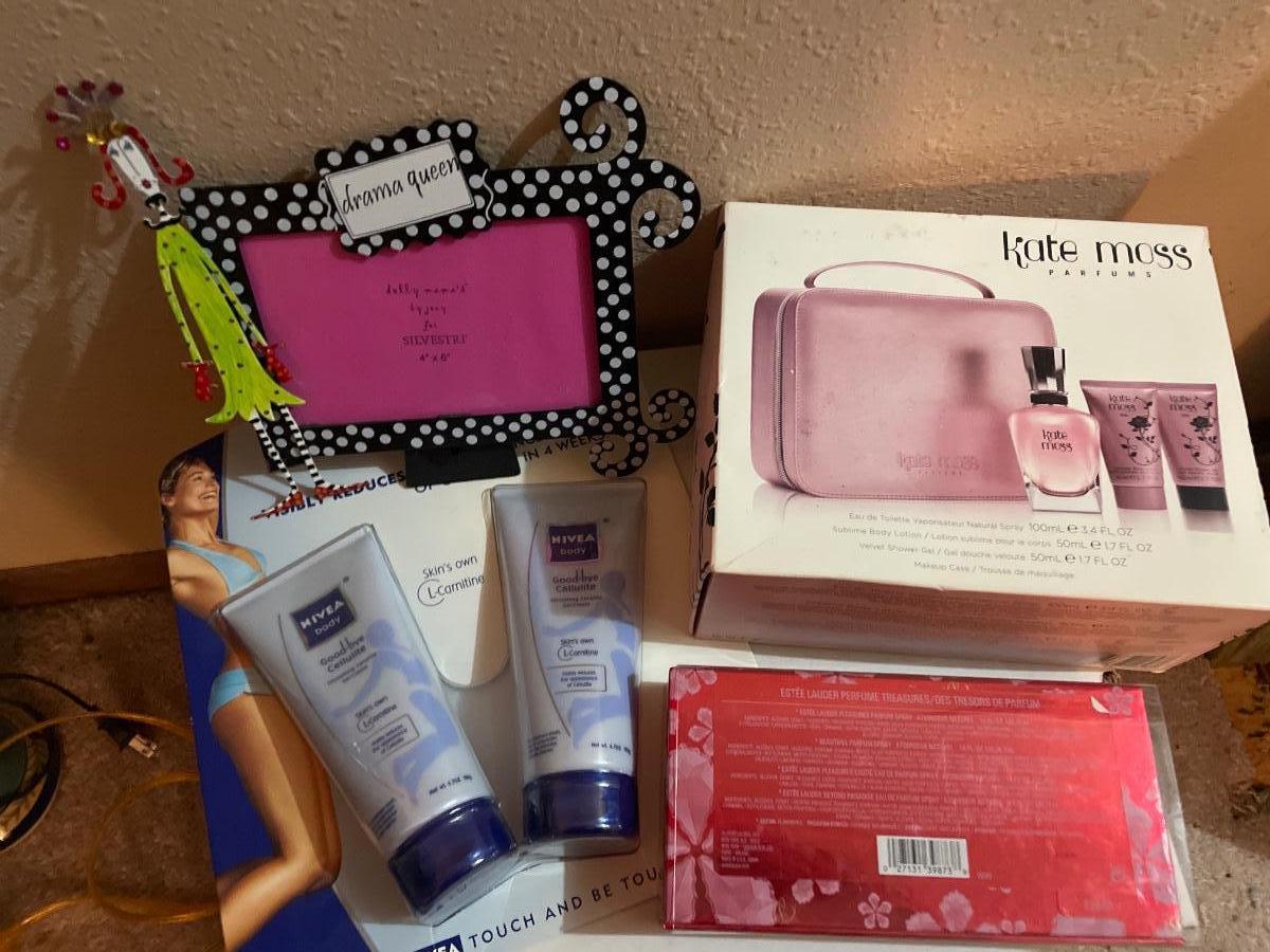 Kate Moss perfume kit, Estée Lauder perfume, Nivea lotion and drama queen picture frame. All items look or are new in box