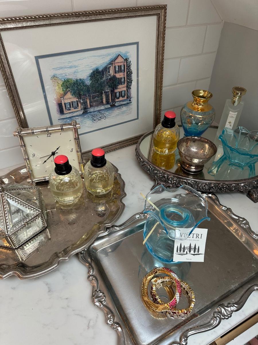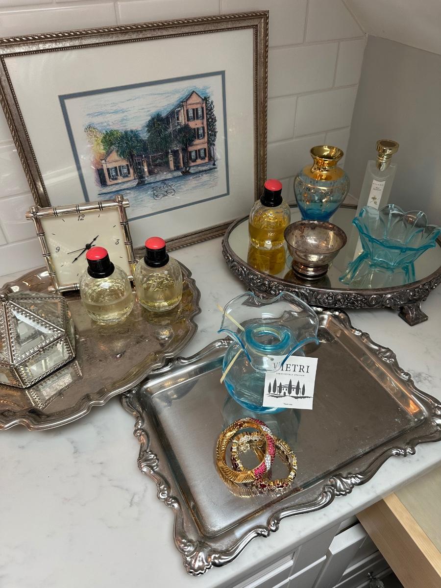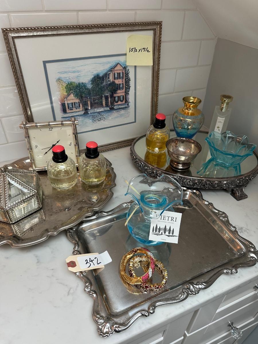 VIETRI VASE, DRESSER TRAYS, YVES ST LAURENT PERFUME, CLOCK FRAMED ART