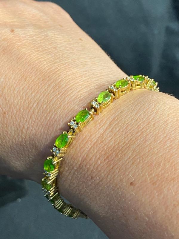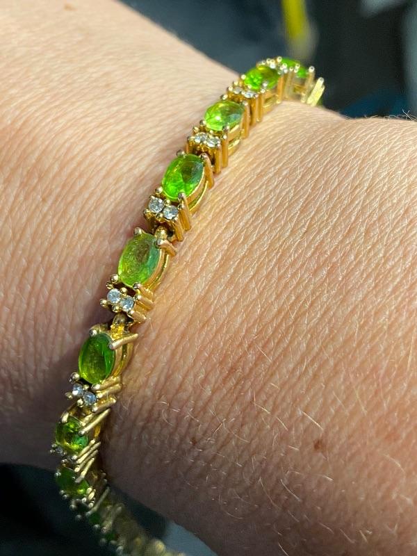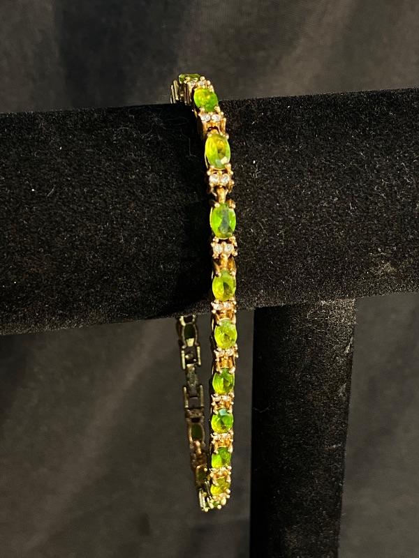 Peridot & Cubic Zirconia Tennis Bracelet. Goldtone setting. Has an extra link piece to extend the size. No missing stones.