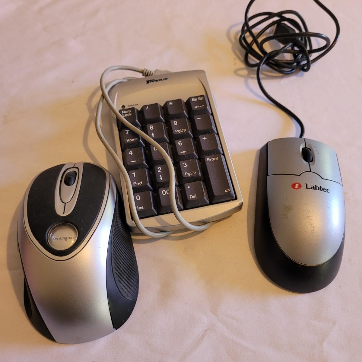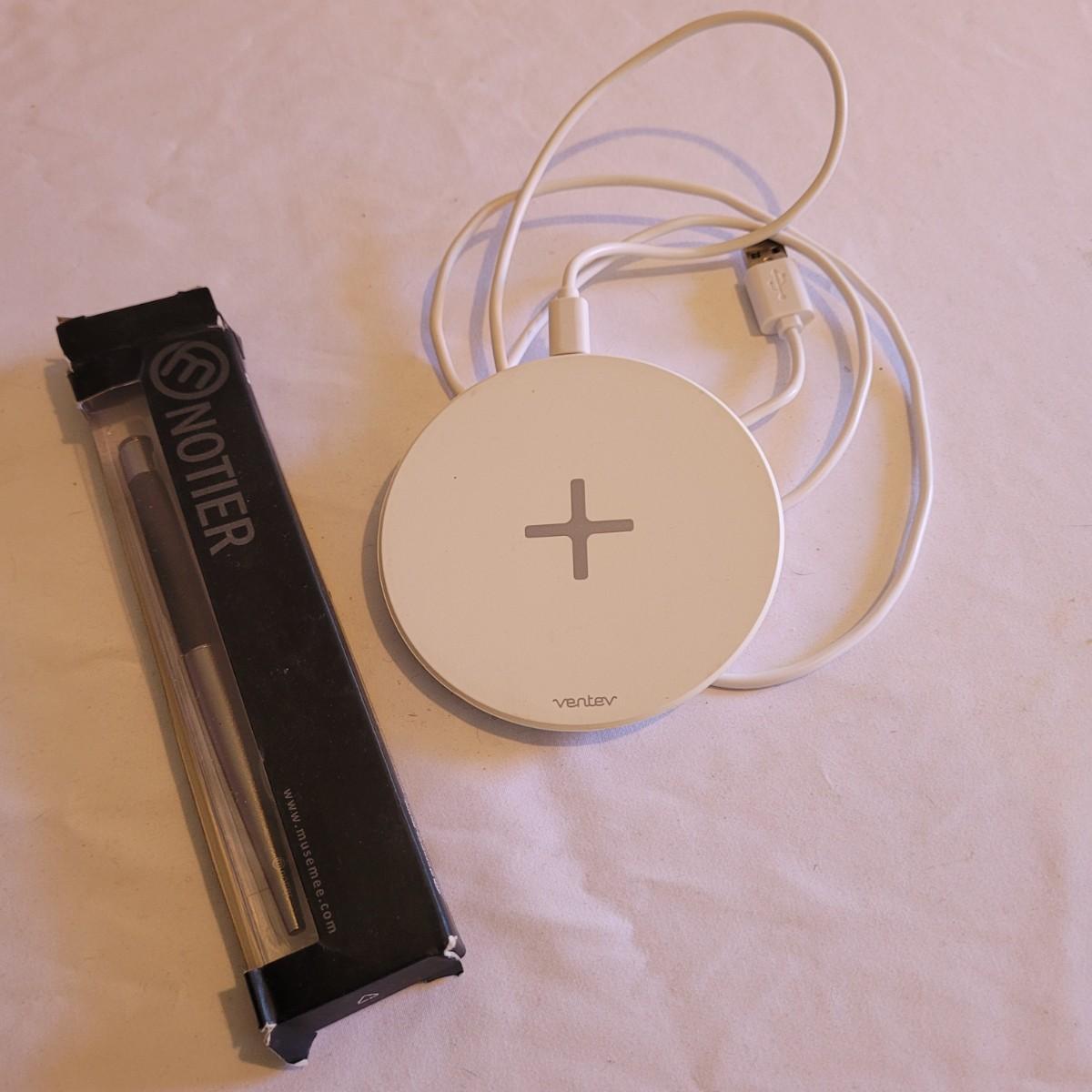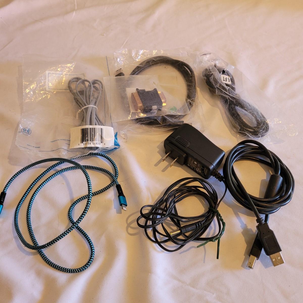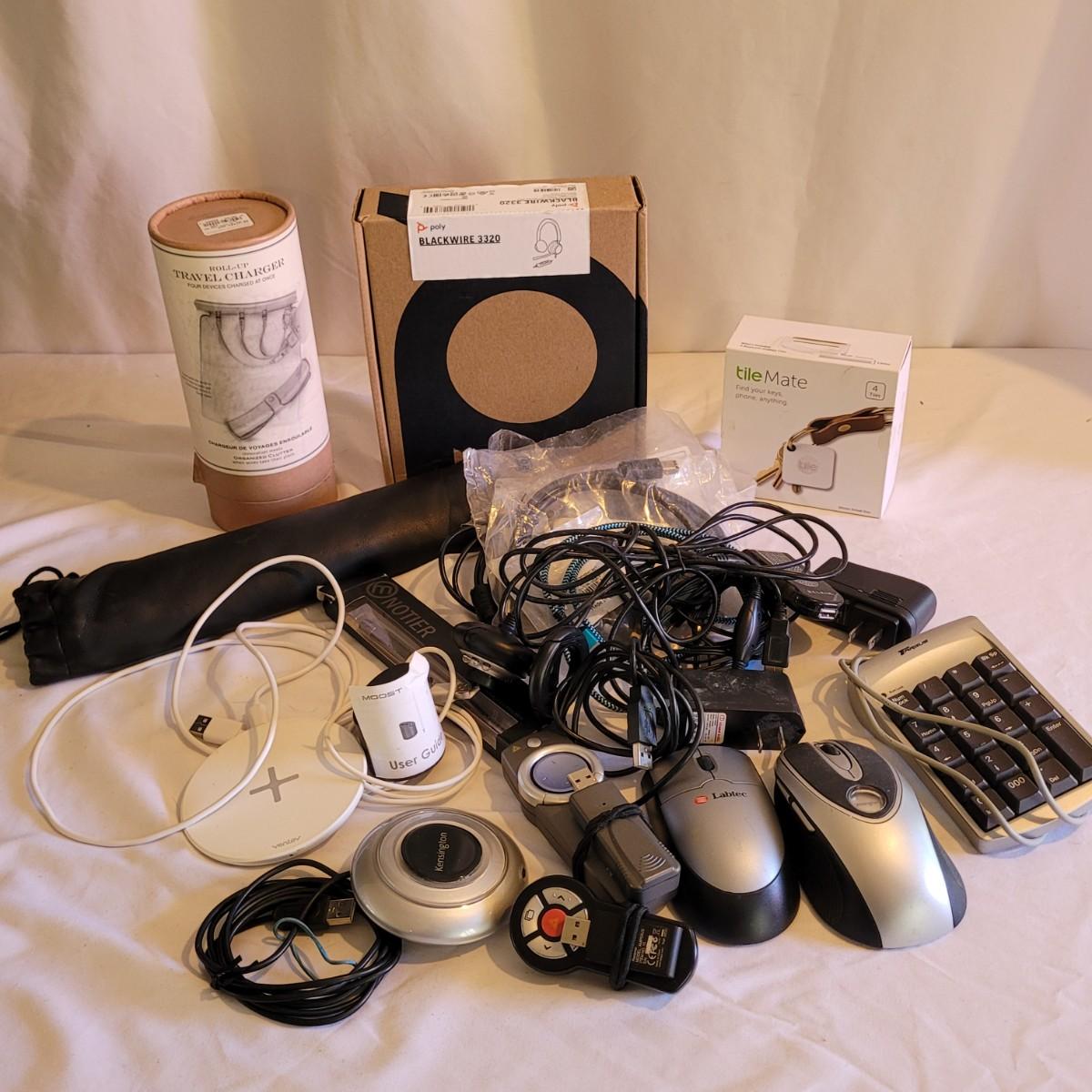 This auction is for a variety of peripherals and cords. Items include headset, tile, mice, wireless charger, webcam, wireless label maker, remotes, stylus, and various charging cables for different devices. Brands include Kensington, Labtec, Poly, Notier, Tile, and Belkin.