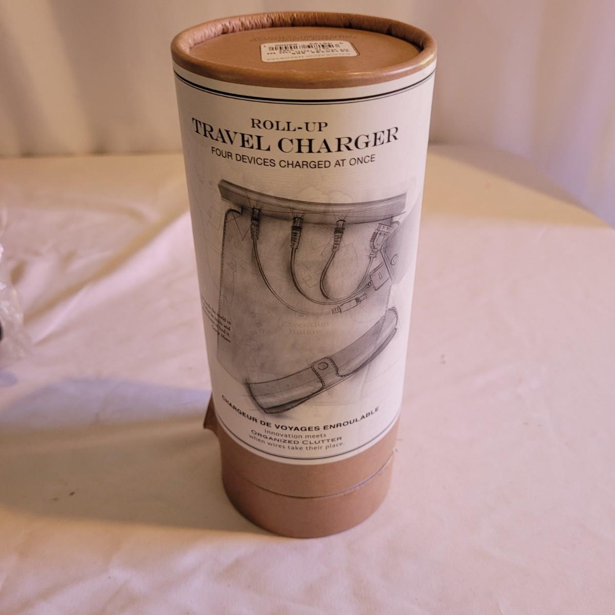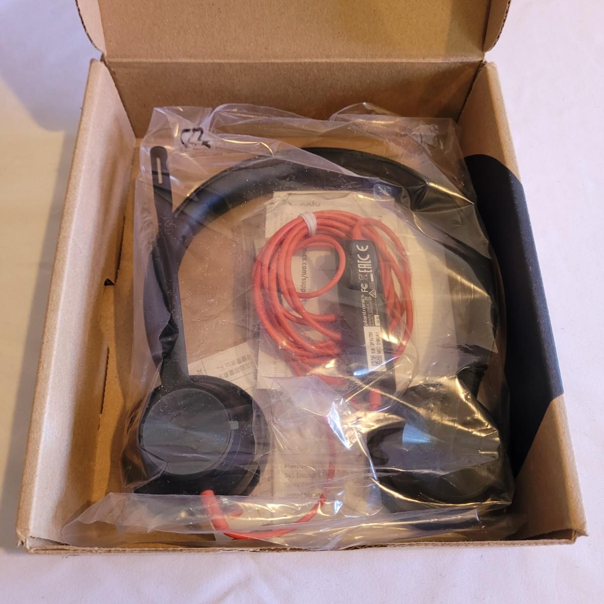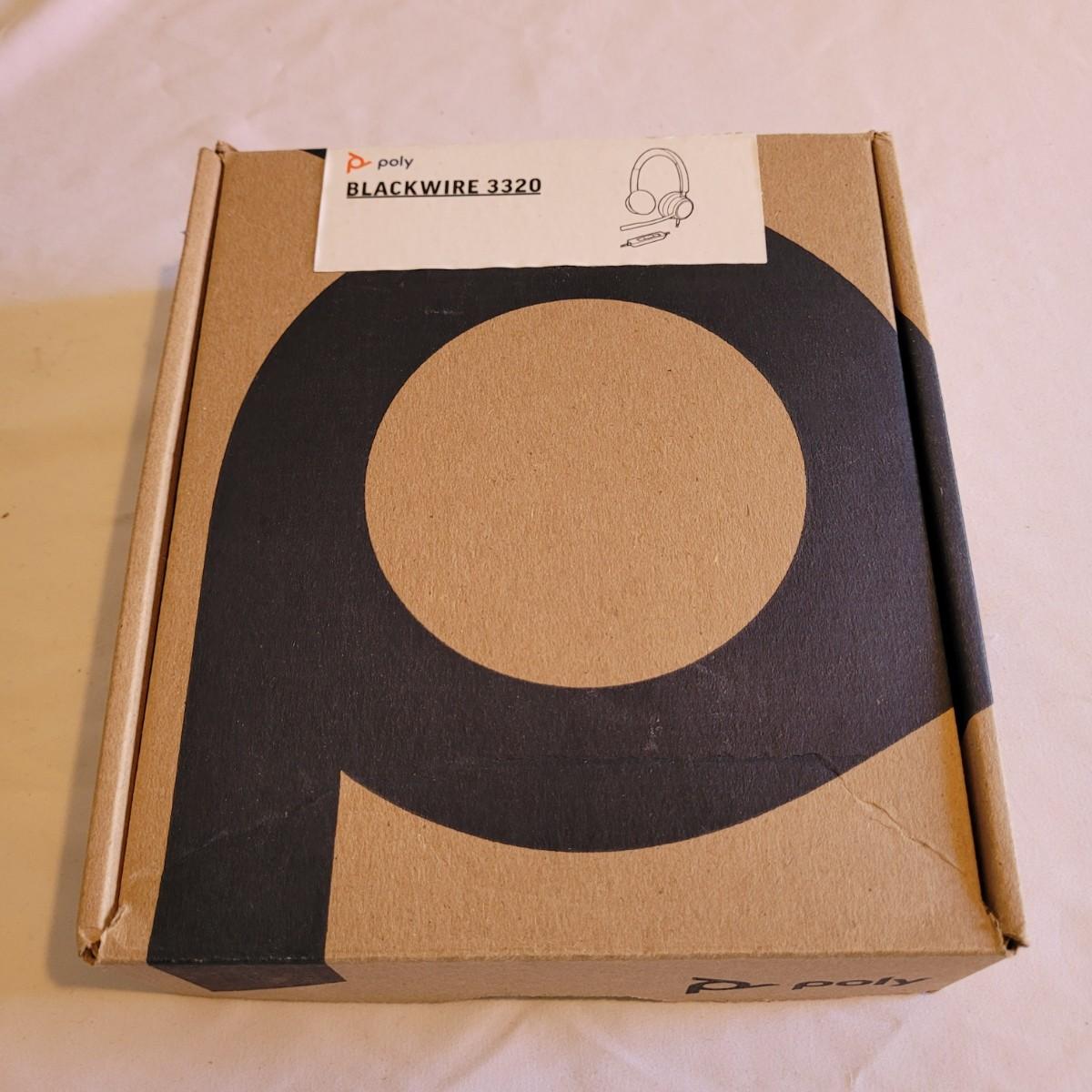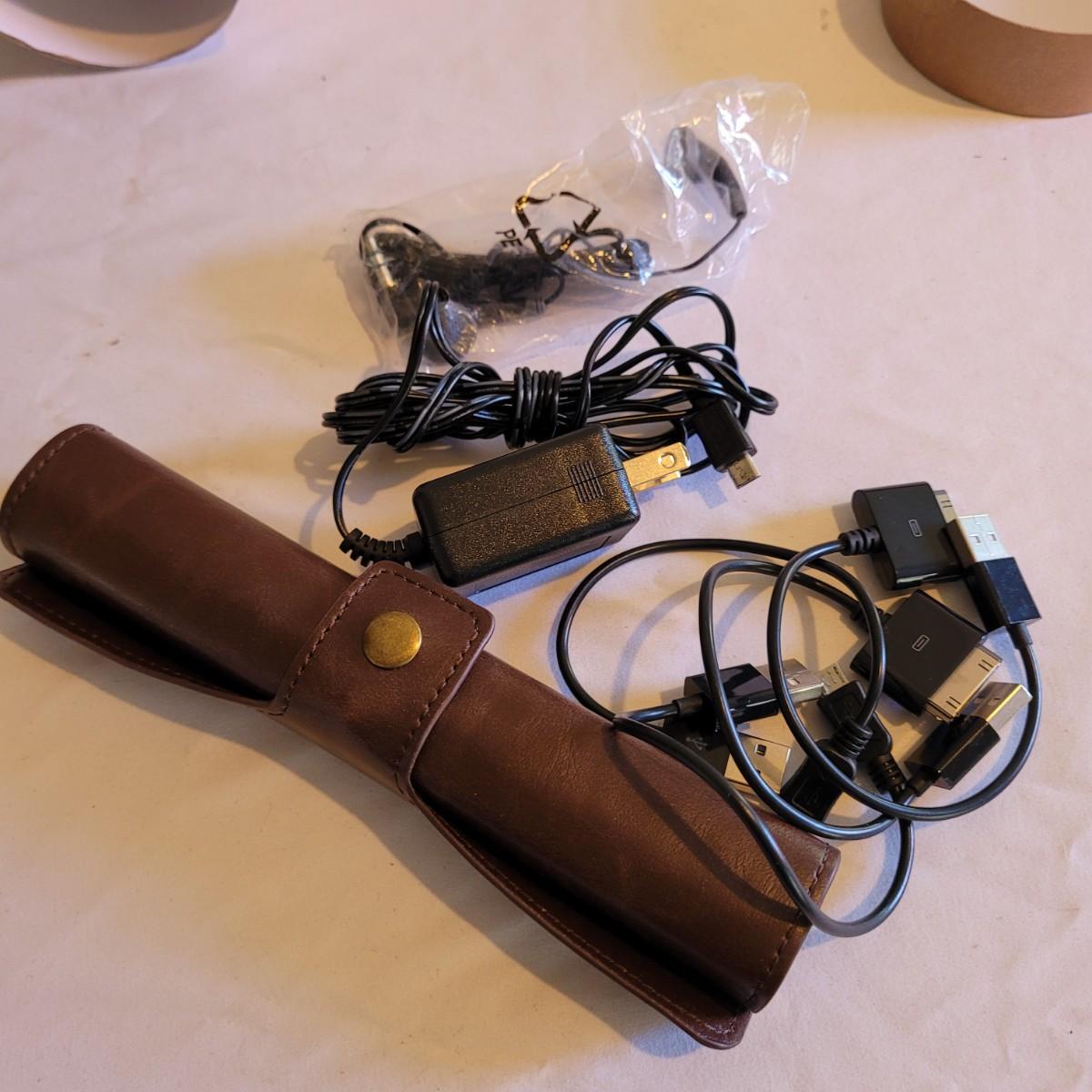 This auction is for a variety of peripherals and cords. Items include headset, tile, mice, wireless charger, webcam, wireless label maker, remotes, stylus, and various charging cables for different devices. Brands include Kensington, Labtec, Poly, Notier, Tile, and Belkin.