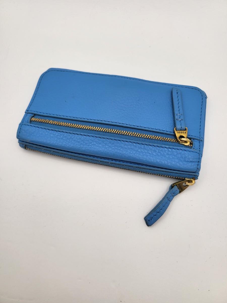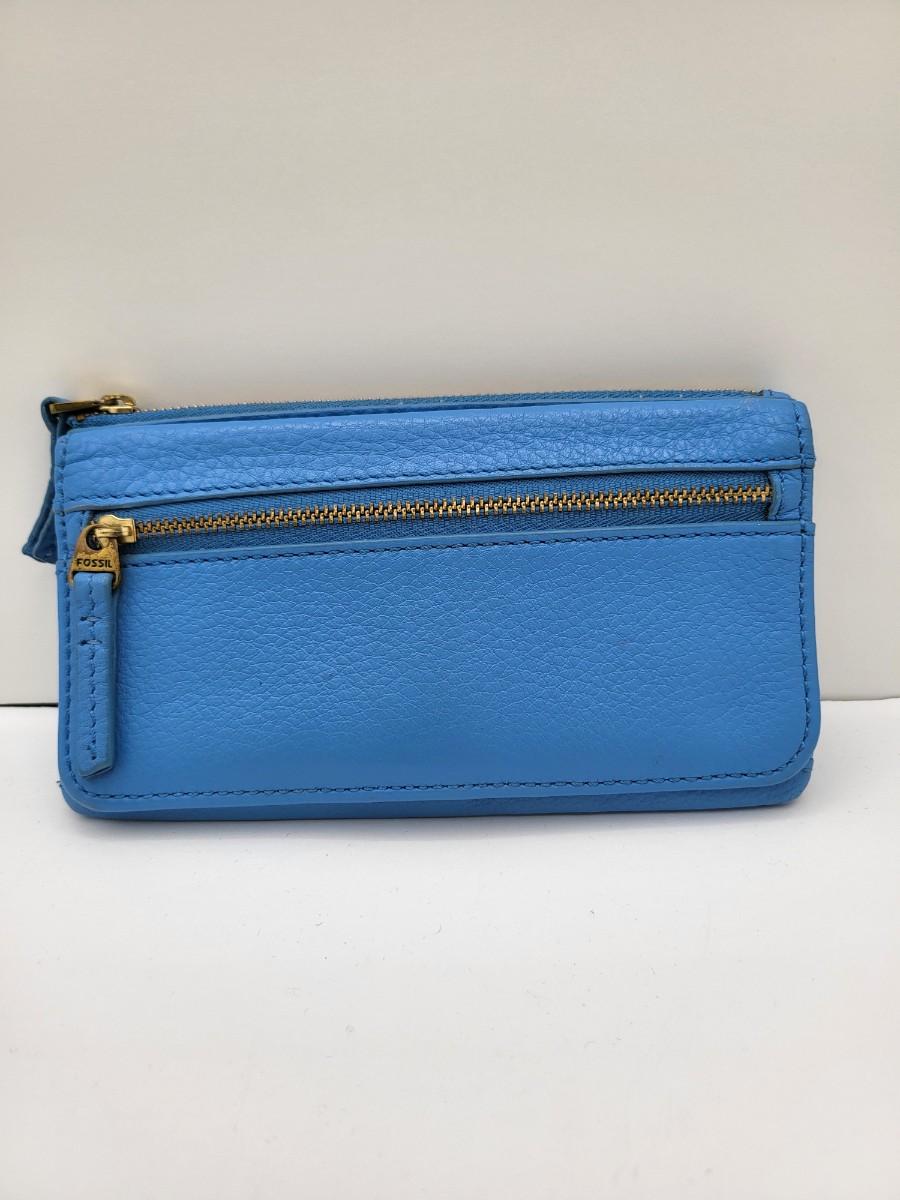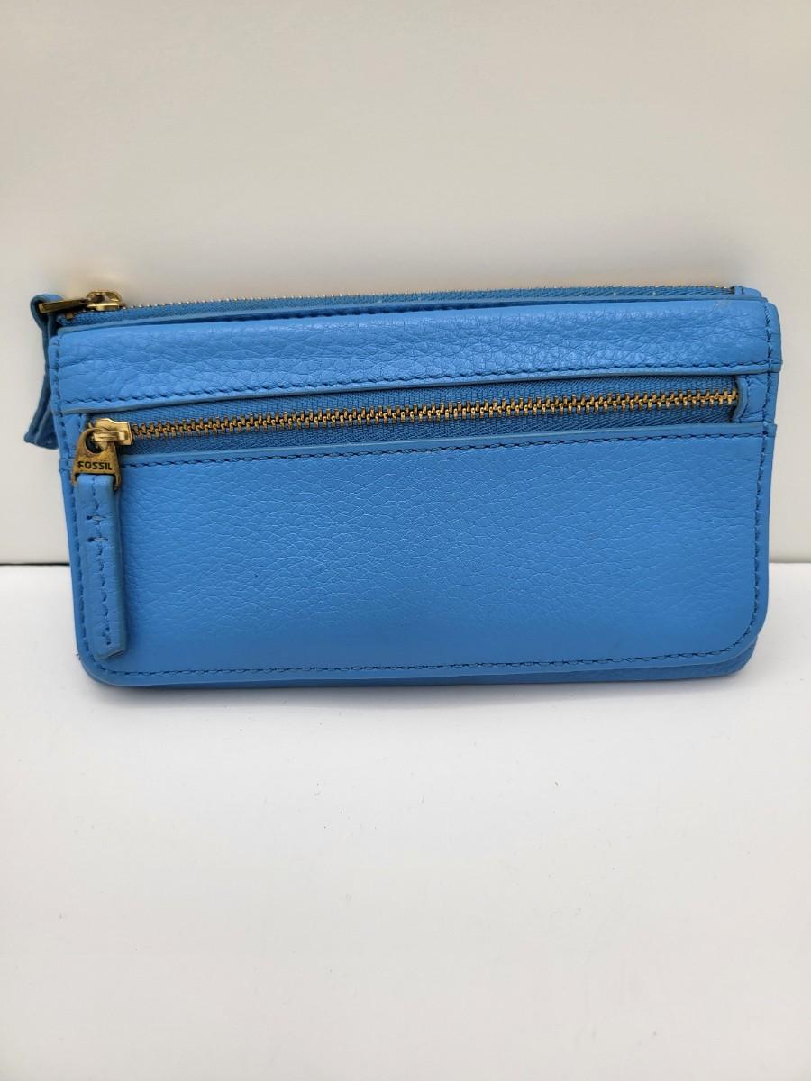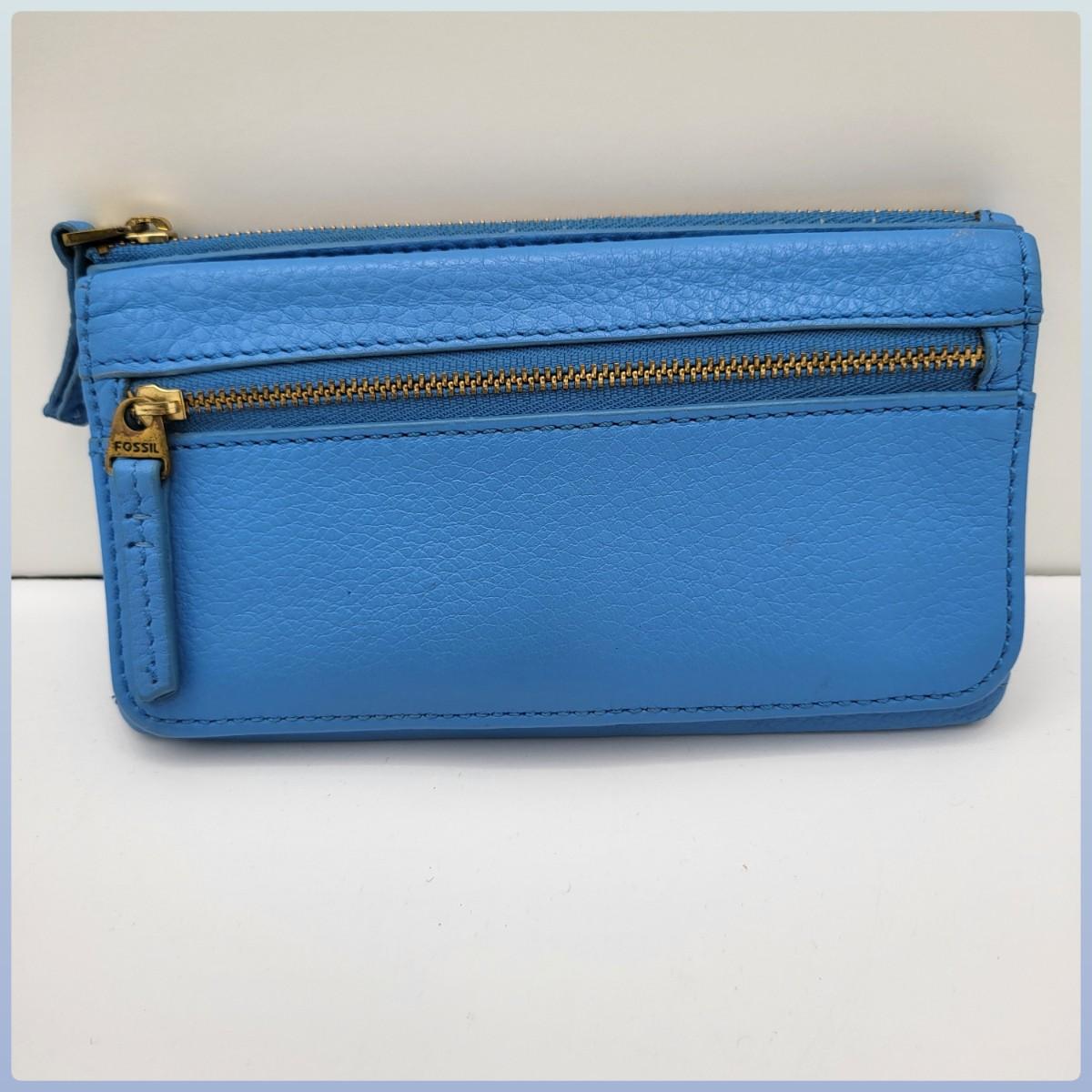 Fossil brand, compact wallet with lots of card slots and two zipper pockets. Measures 7" long x 4" tall.