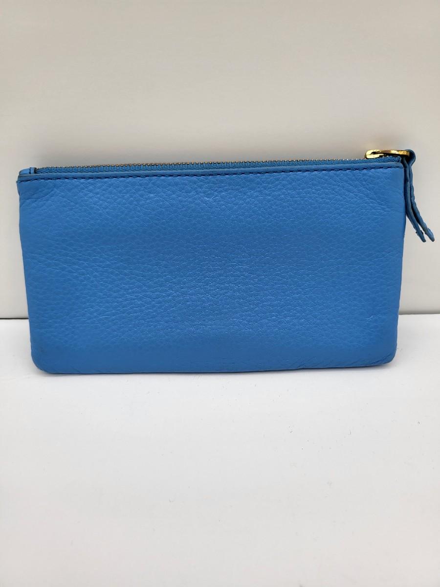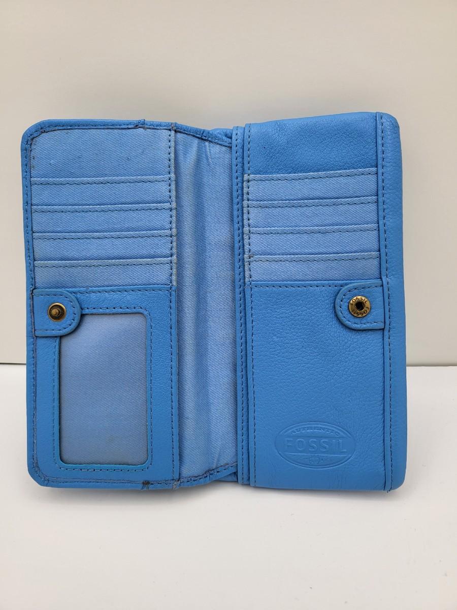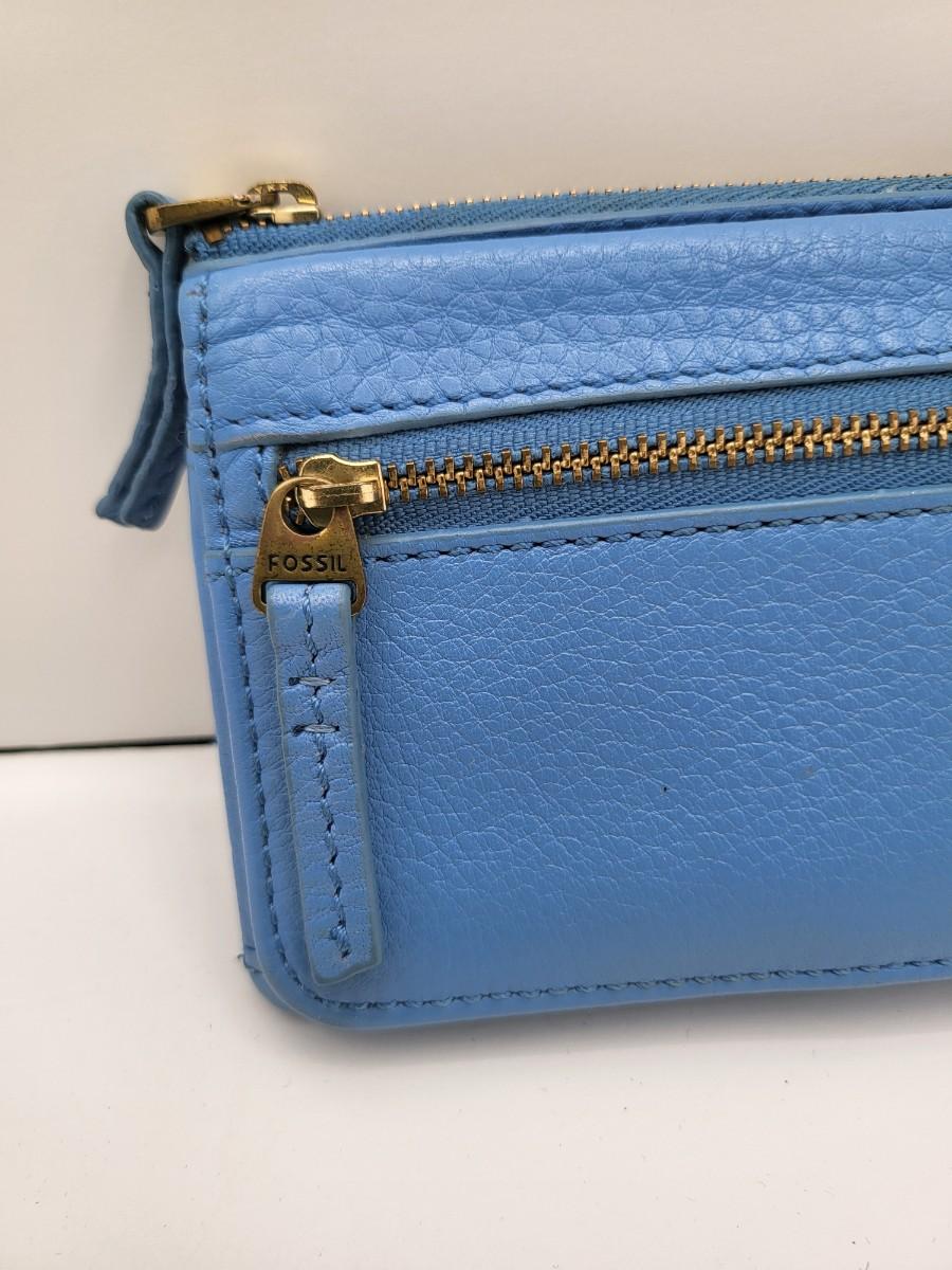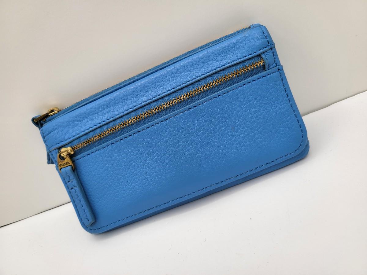 Fossil brand, compact wallet with lots of card slots and two zipper pockets. Measures 7" long x 4" tall.