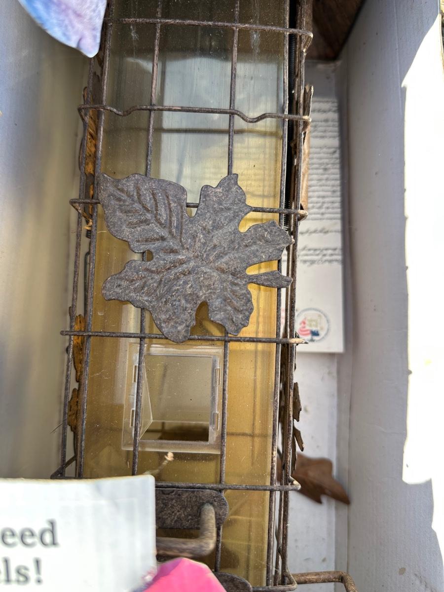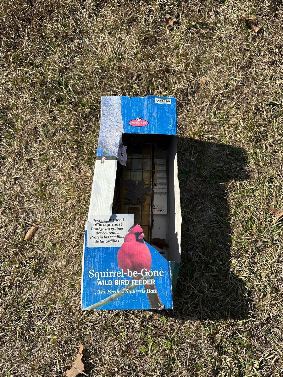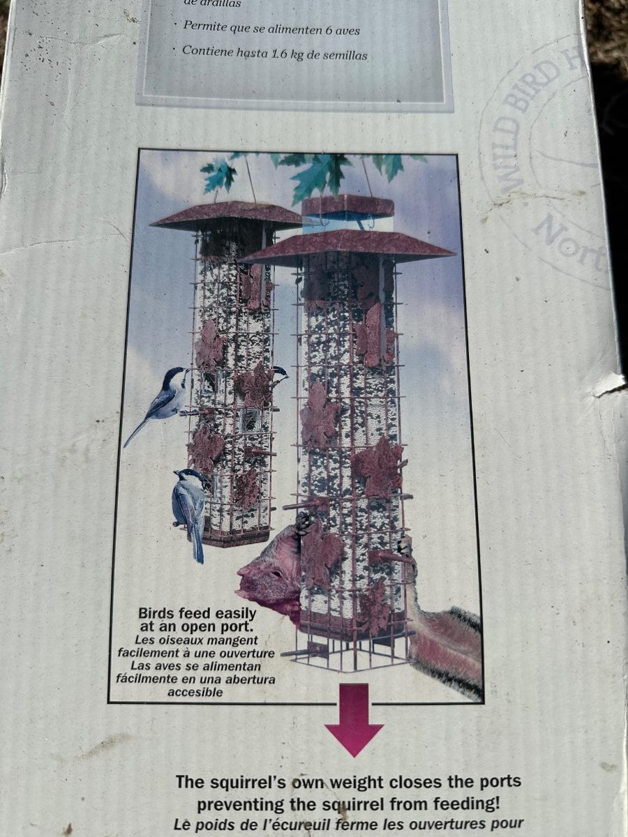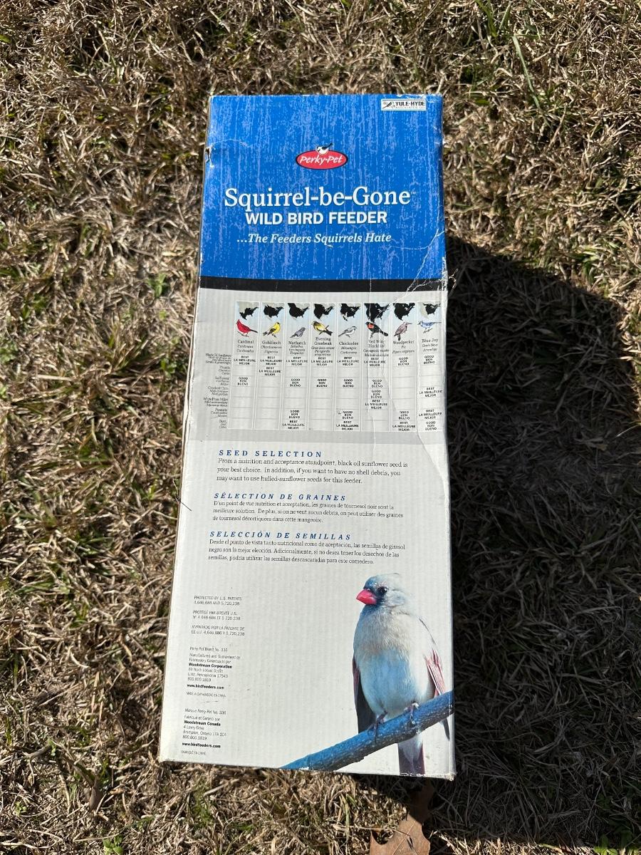 Perky-Pet Squirrel-Be-Gone wild bird feeder designed to keep squirrels out while allowing birds to feed comfortably. Features a patented weight-activated feeding system that closes the ports when squirrels attempt to access seed. Heavy-duty metal cage with decorative leaf accents surrounds a clear seed tube.