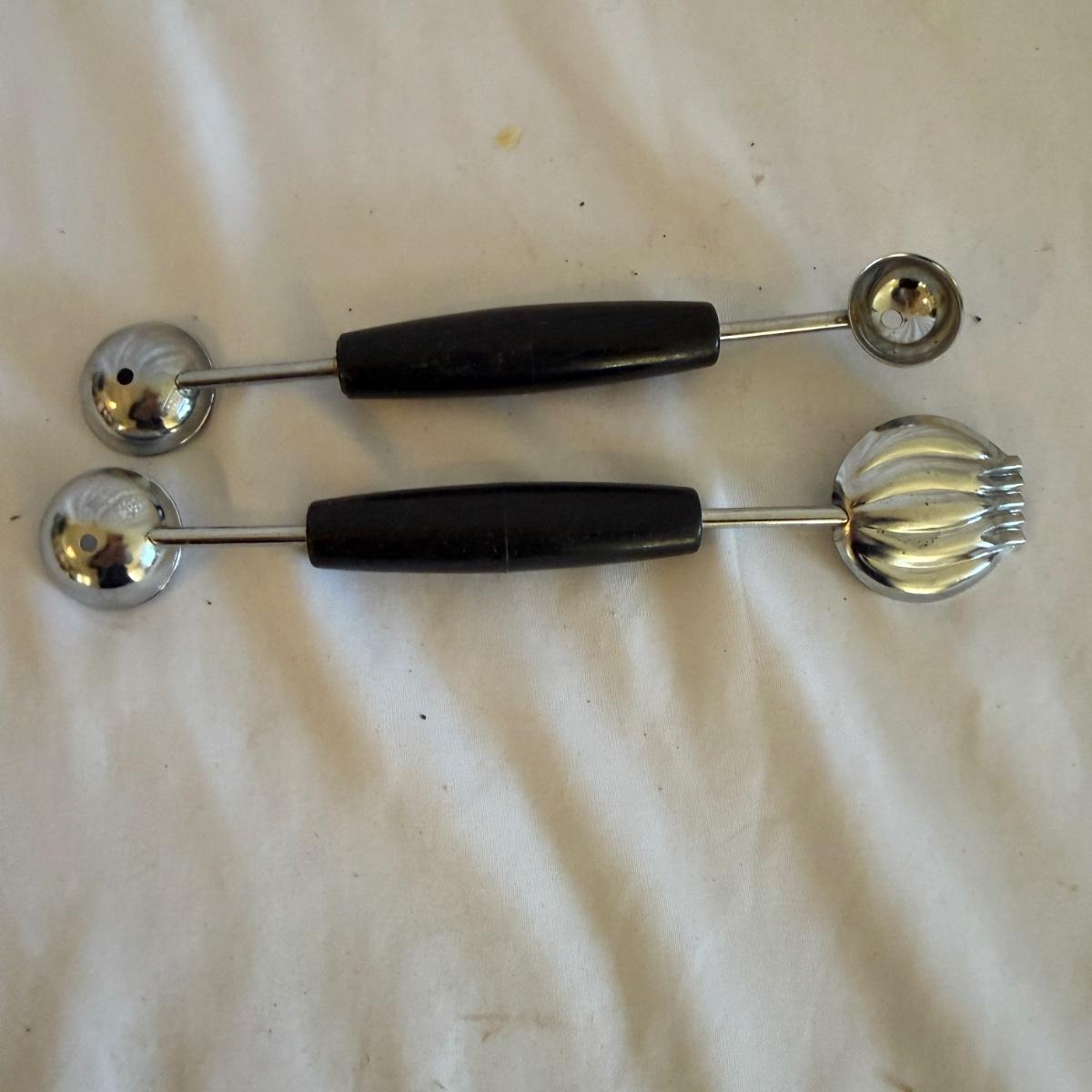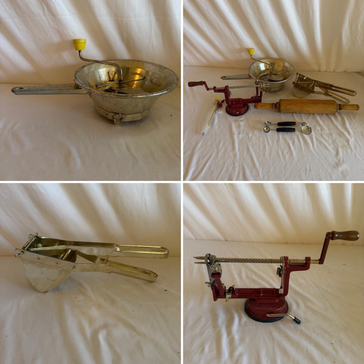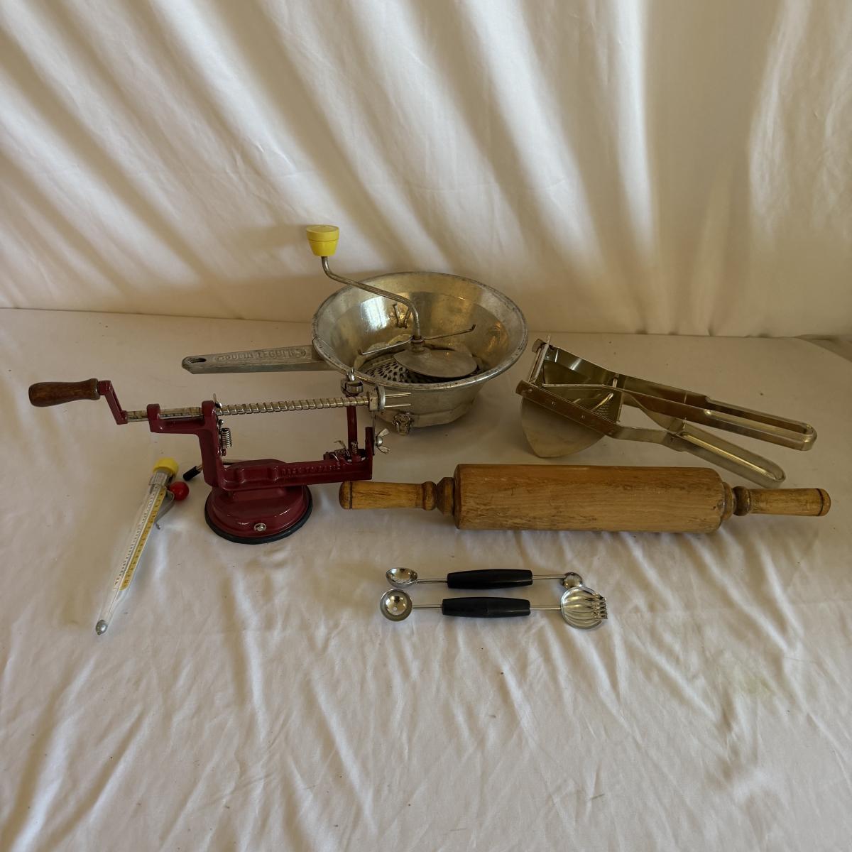 Lot includes a Peel Away Apple peeler, potato ricer, thermometer, wooden rolling pin, two fruit ballers and a Moulin-Legumes food mill. Apple peeler measures 12” x 4” x 5”H.