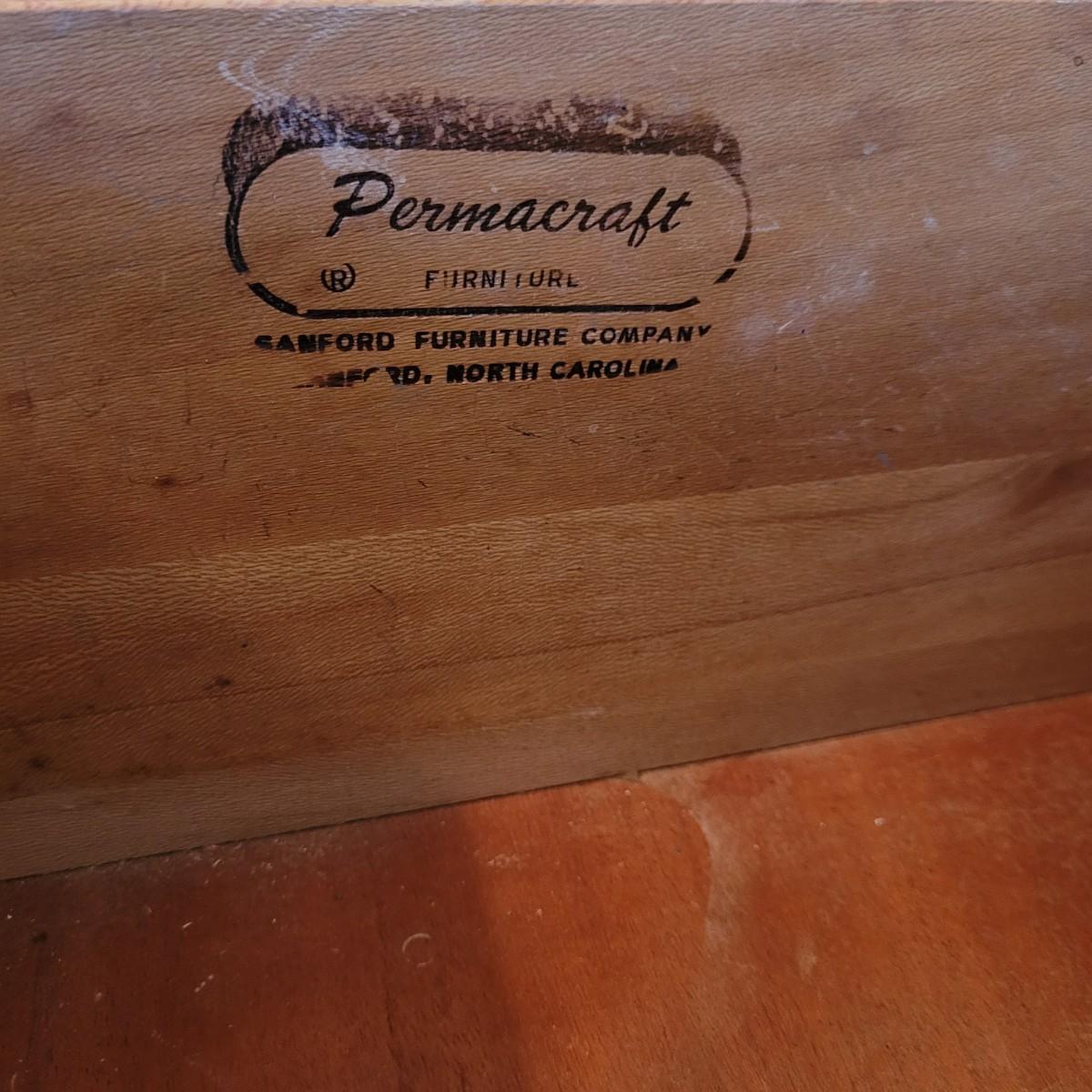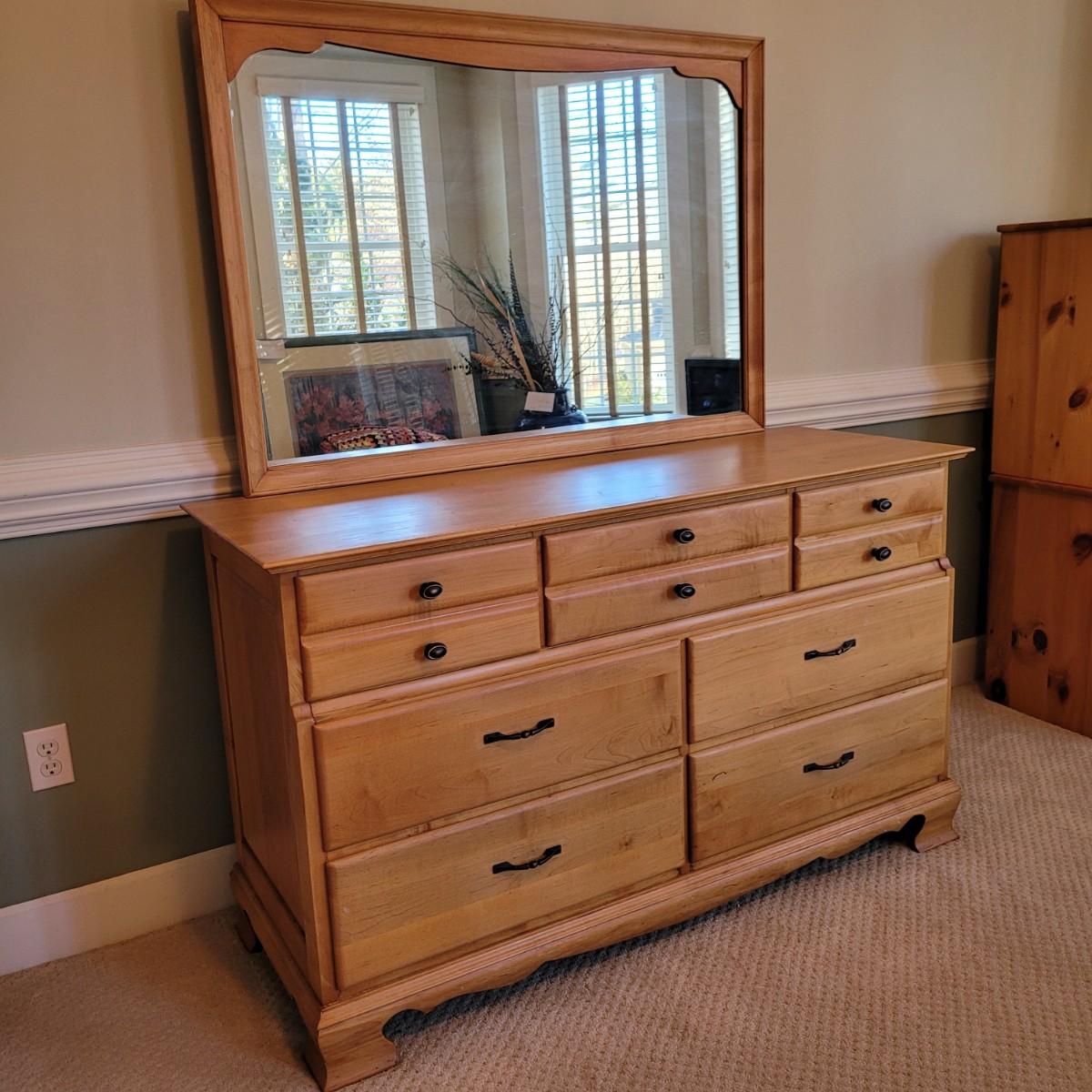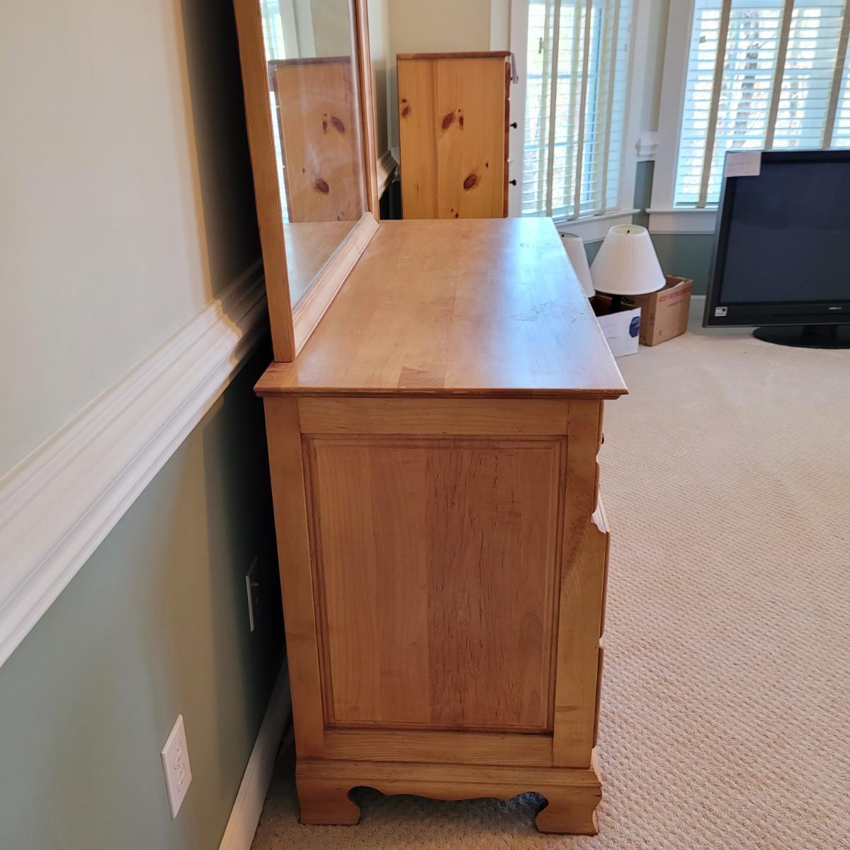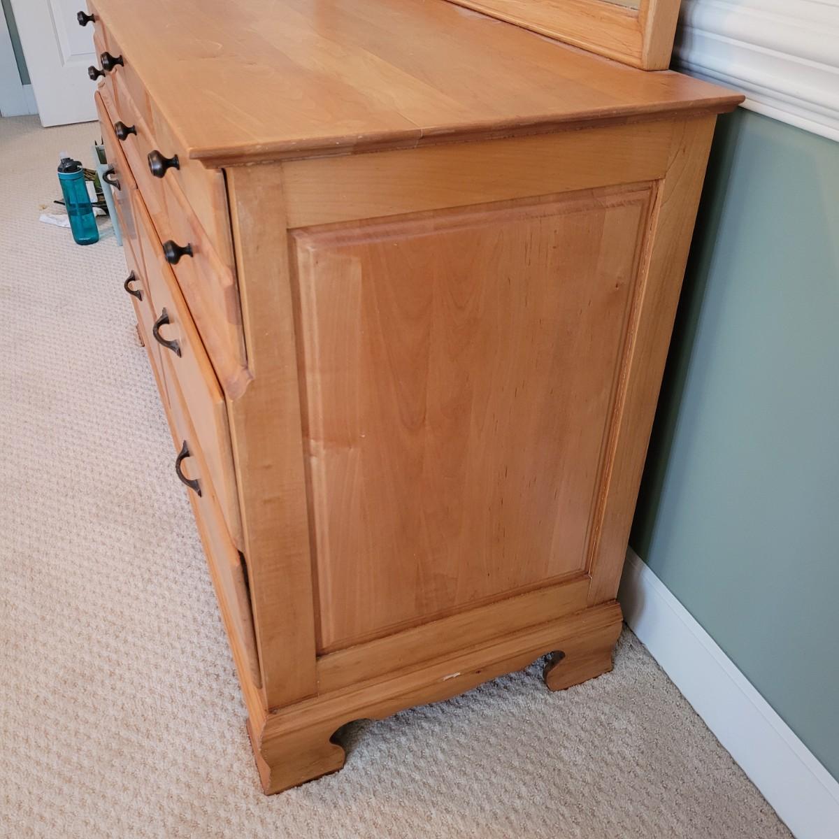 Permacraft Furniture by Sanford Furniture Company wooden seven drawer dresser with attached mirror and dovetailed drawers. Dresser is in good condition with some nicks and scratches (see photos). Dresser measures approximately 56"L x20.5"W x33"H, top drawers 7"H, middle 7.5"H, bottom 8"H. Mirror measures approximately 47"L x33"H. Local pickup only. Winning bidder must bring assistance to help move and load this item due to its weight and/or size. Winning bidder is responsible for dismantling the mirror from the dresser, no tools are necessary as the screws are hand tight. Item will also need to go up a flight of stairs.