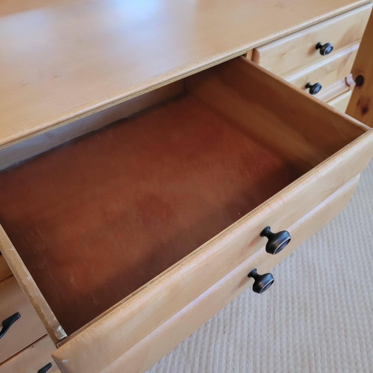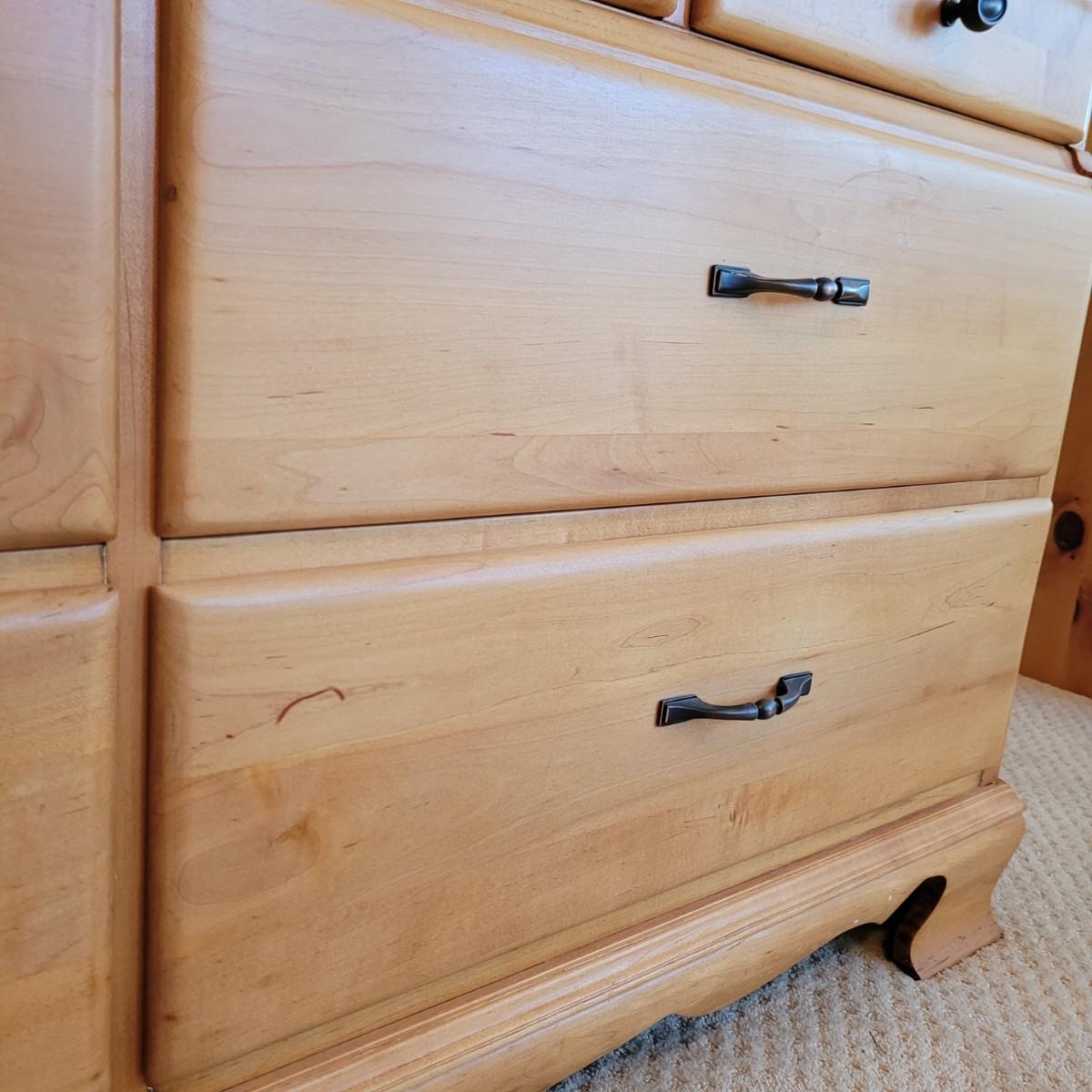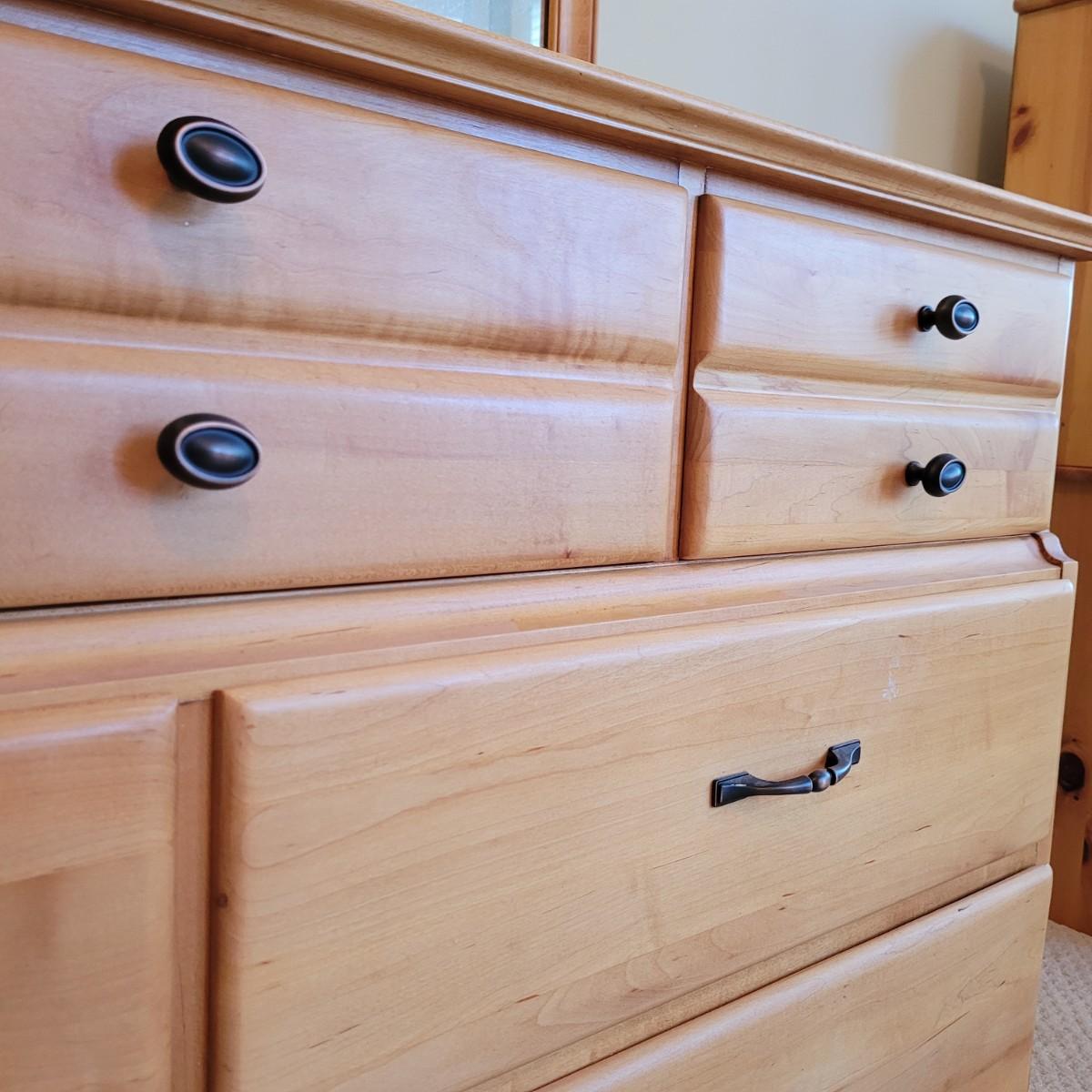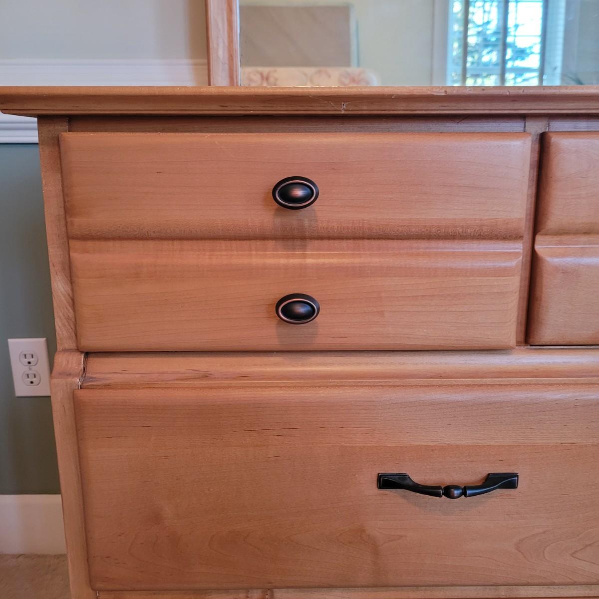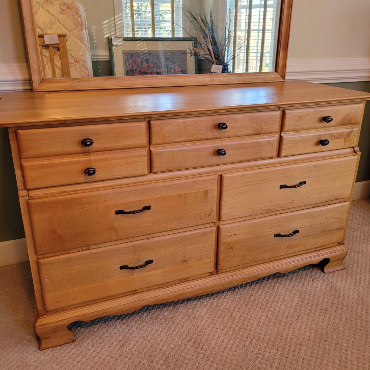 Permacraft Furniture by Sanford Furniture Company wooden seven drawer dresser with attached mirror and dovetailed drawers. Dresser is in good condition with some nicks and scratches (see photos). Dresser measures approximately 56"L x20.5"W x33"H, top drawers 7"H, middle 7.5"H, bottom 8"H. Mirror measures approximately 47"L x33"H. Local pickup only. Winning bidder must bring assistance to help move and load this item due to its weight and/or size. Winning bidder is responsible for dismantling the mirror from the dresser, no tools are necessary as the screws are hand tight. Item will also need to go up a flight of stairs.