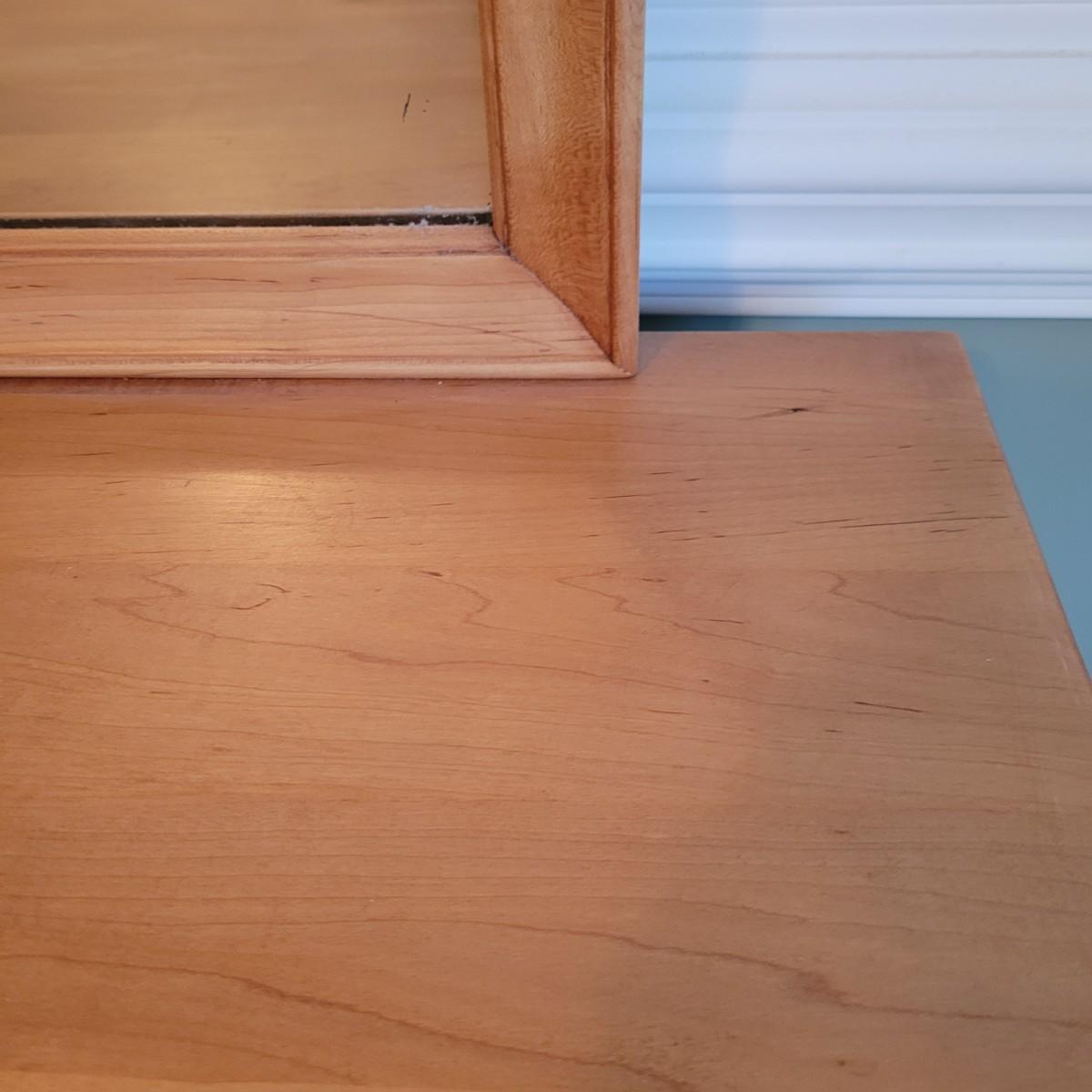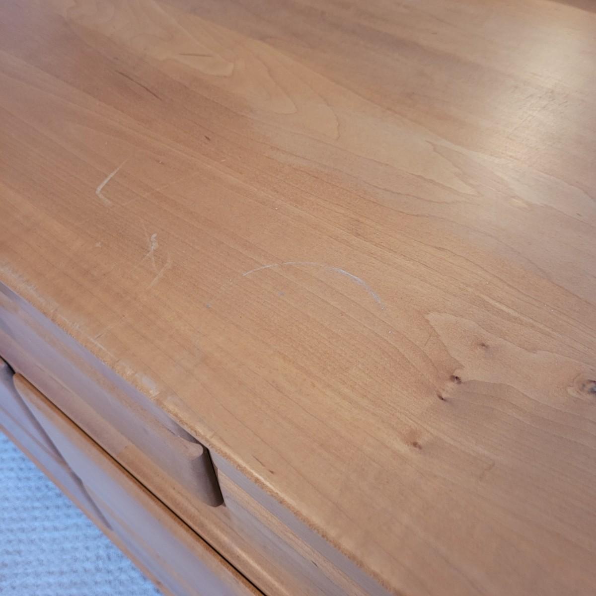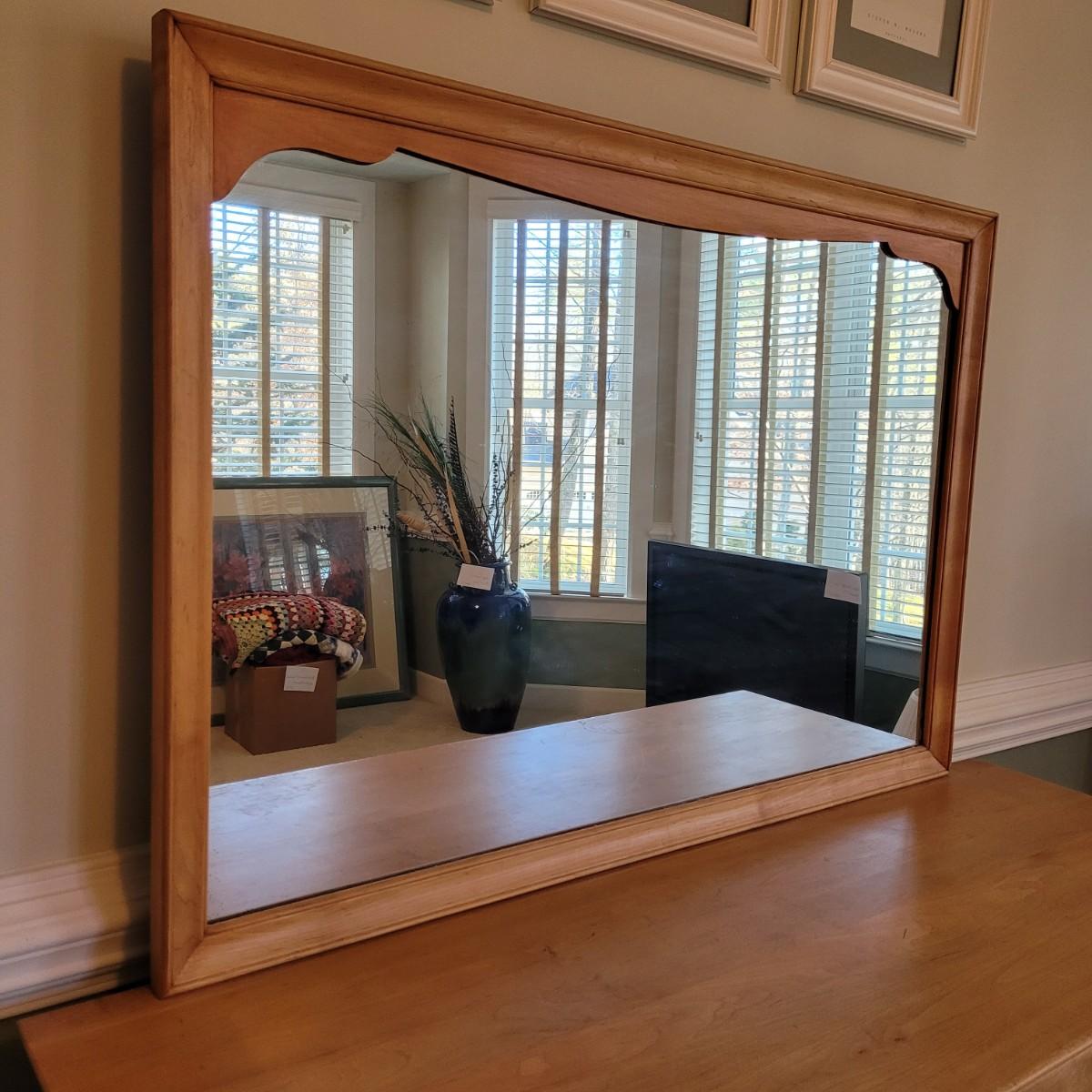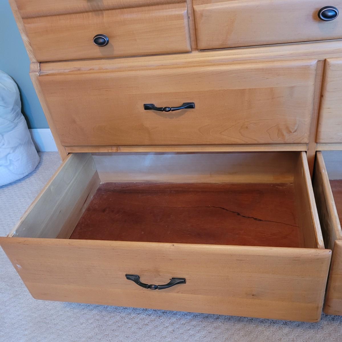 Permacraft Furniture by Sanford Furniture Company wooden seven drawer dresser with attached mirror and dovetailed drawers. Dresser is in good condition with some nicks and scratches (see photos). Dresser measures approximately 56"L x20.5"W x33"H, top drawers 7"H, middle 7.5"H, bottom 8"H. Mirror measures approximately 47"L x33"H. Local pickup only. Winning bidder must bring assistance to help move and load this item due to its weight and/or size. Winning bidder is responsible for dismantling the mirror from the dresser, no tools are necessary as the screws are hand tight. Item will also need to go up a flight of stairs.