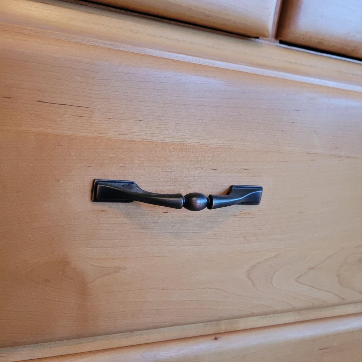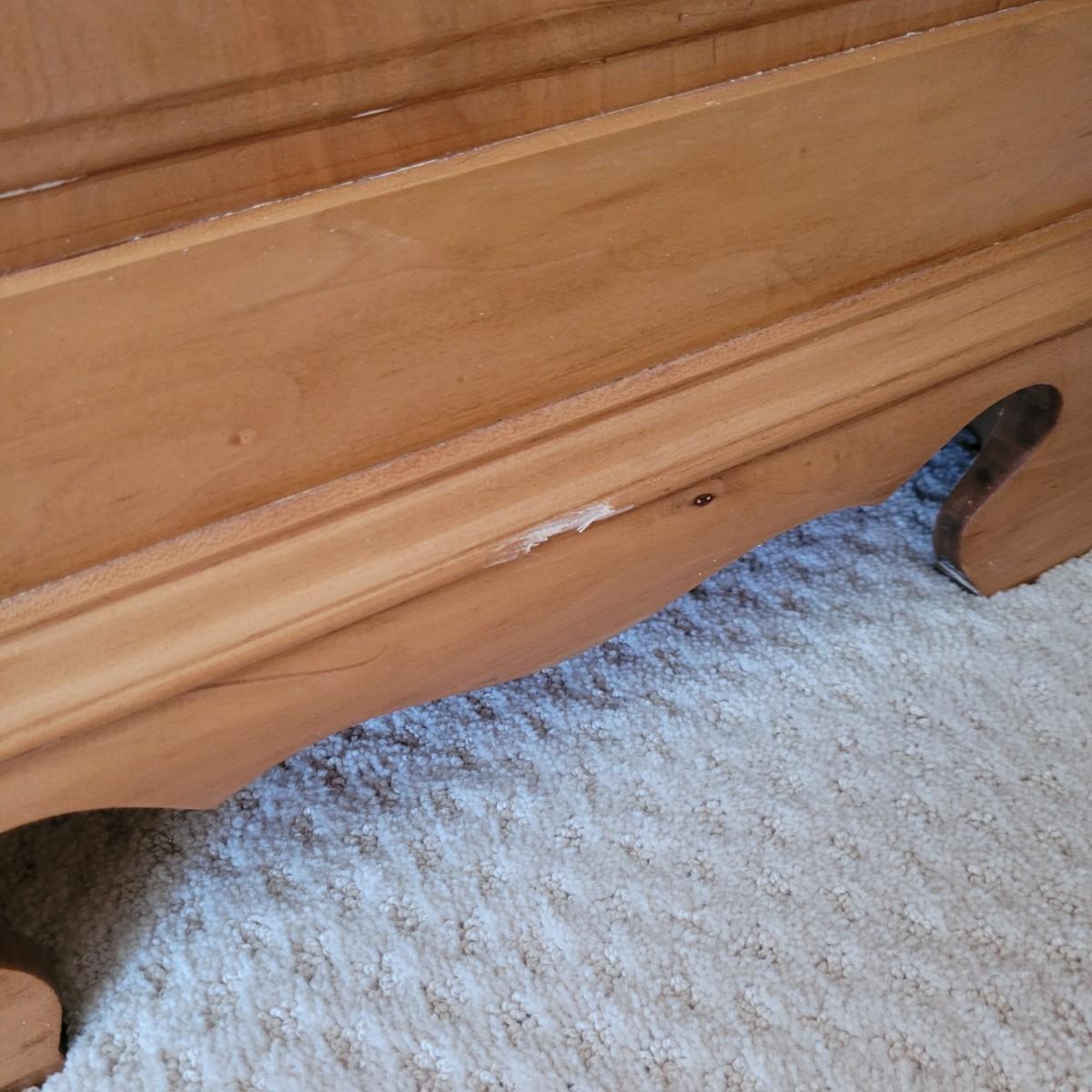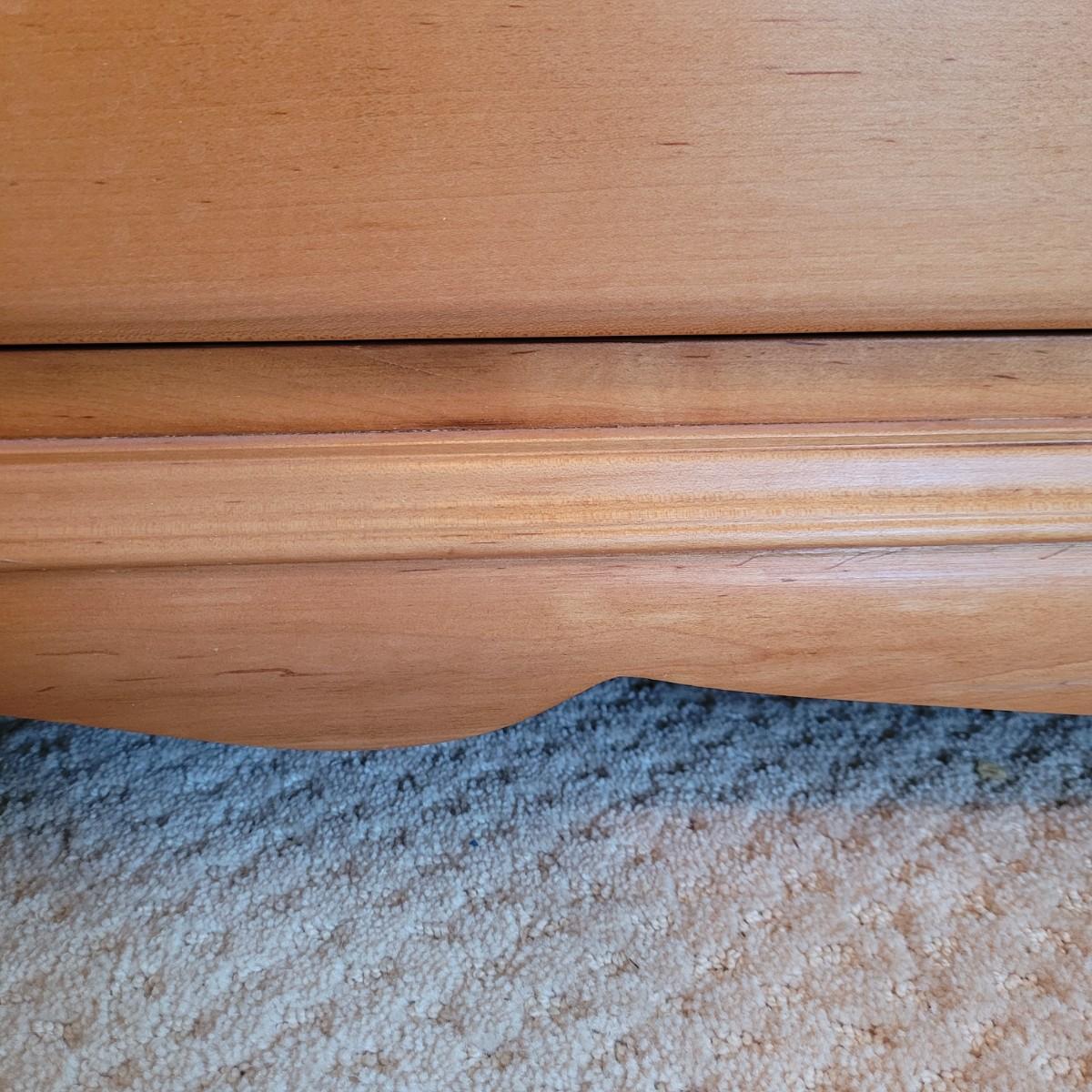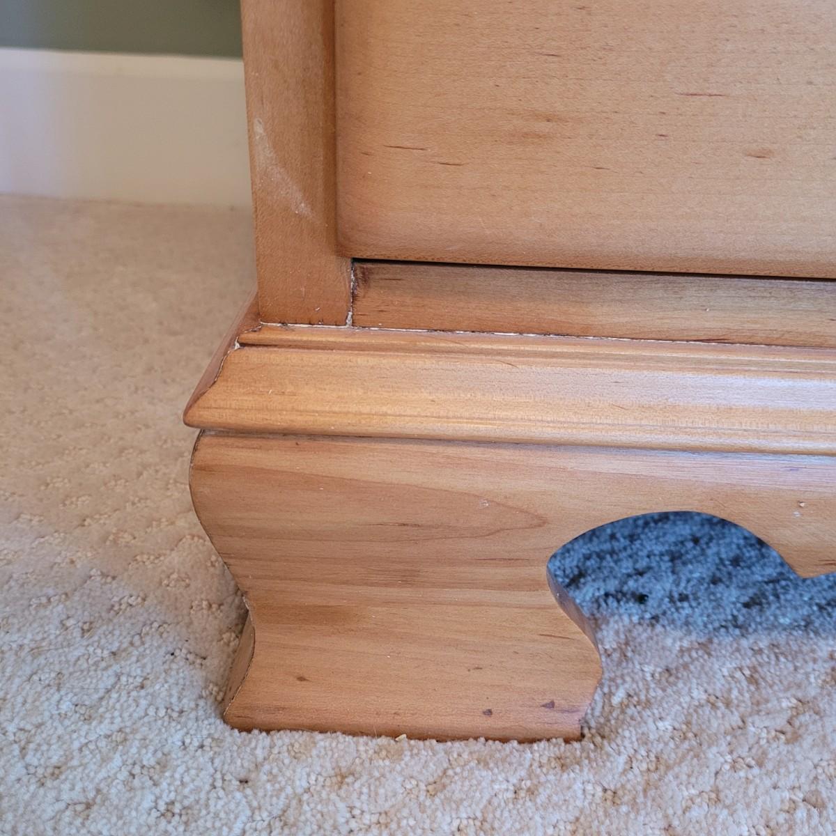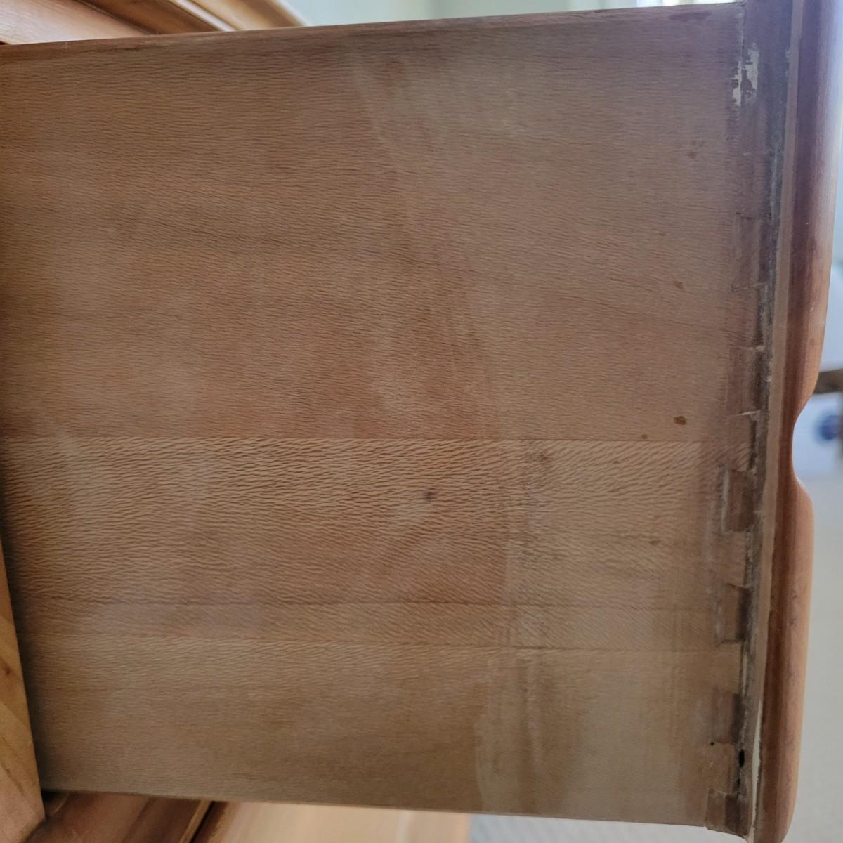 Permacraft Furniture by Sanford Furniture Company wooden seven drawer dresser with attached mirror and dovetailed drawers. Dresser is in good condition with some nicks and scratches (see photos). Dresser measures approximately 56"L x20.5"W x33"H, top drawers 7"H, middle 7.5"H, bottom 8"H. Mirror measures approximately 47"L x33"H. Local pickup only. Winning bidder must bring assistance to help move and load this item due to its weight and/or size. Winning bidder is responsible for dismantling the mirror from the dresser, no tools are necessary as the screws are hand tight. Item will also need to go up a flight of stairs.