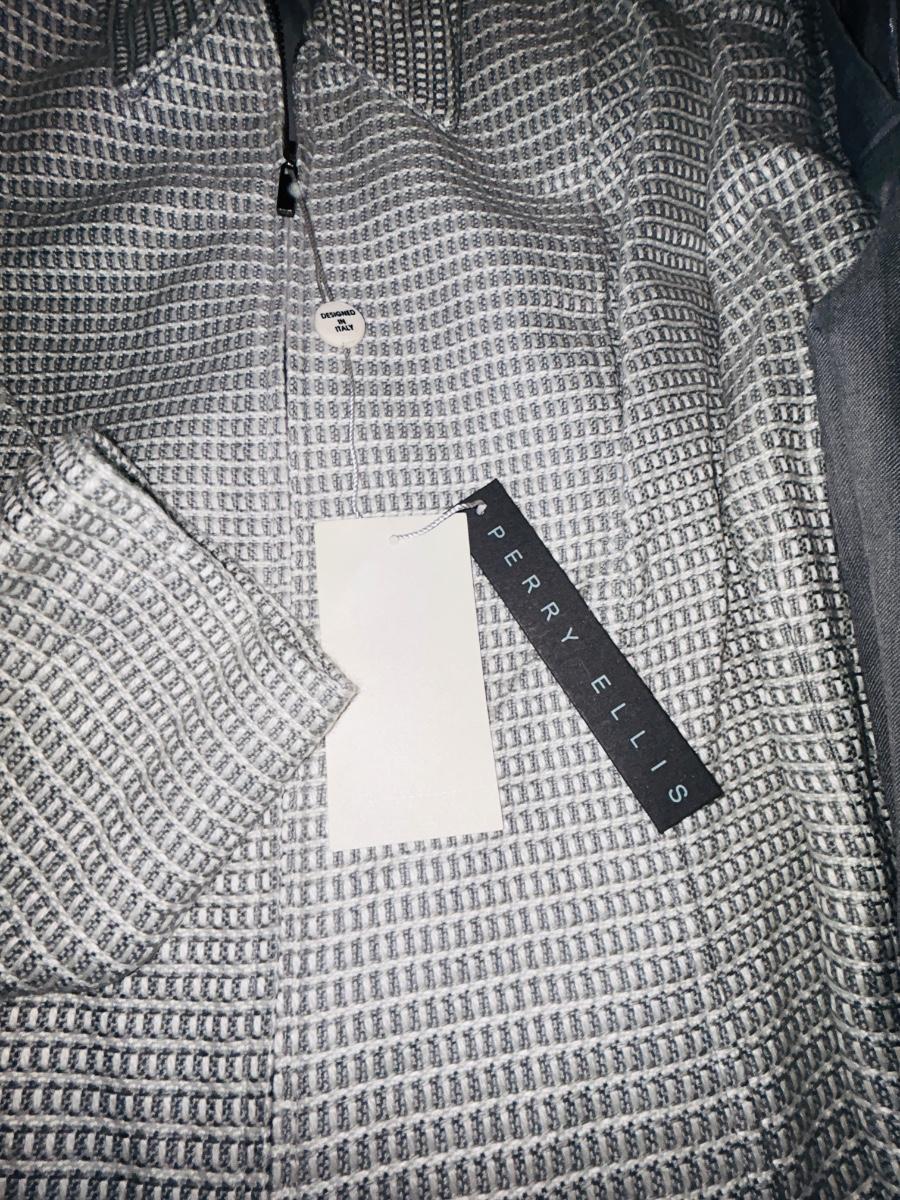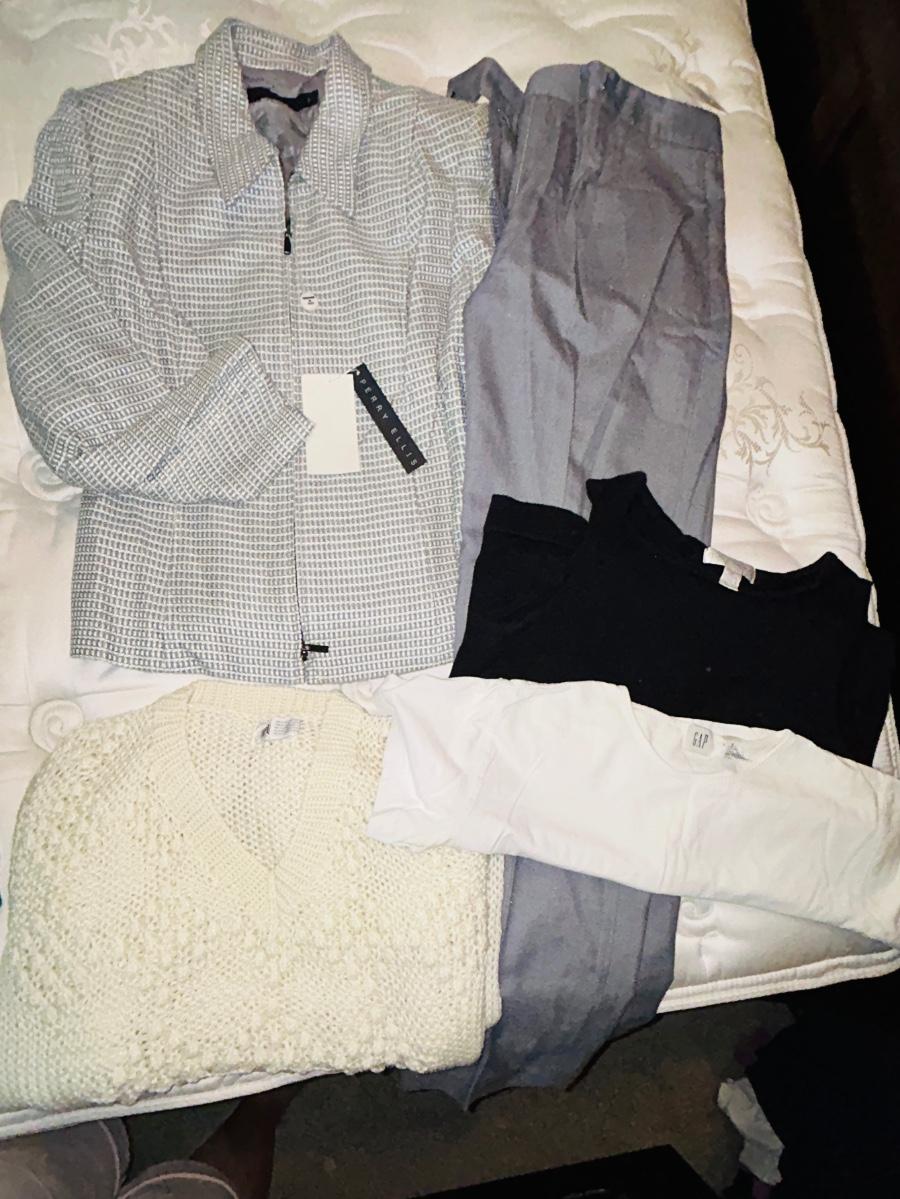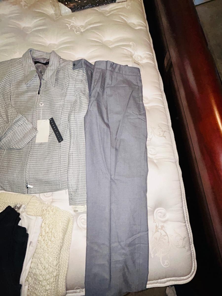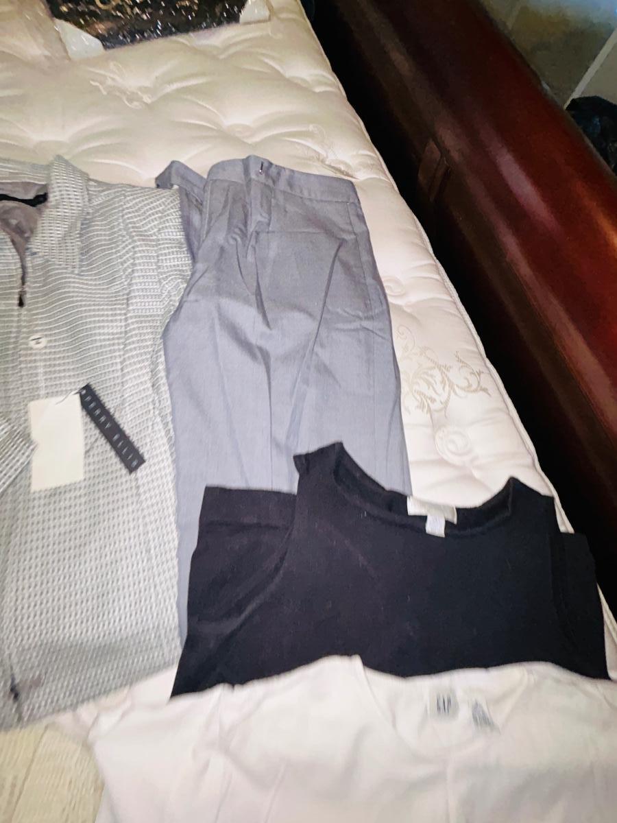 PERRY ELLIS 2 PC SUIT (SIZE 6) , MED SWEATER AND SMALL SHIRTS