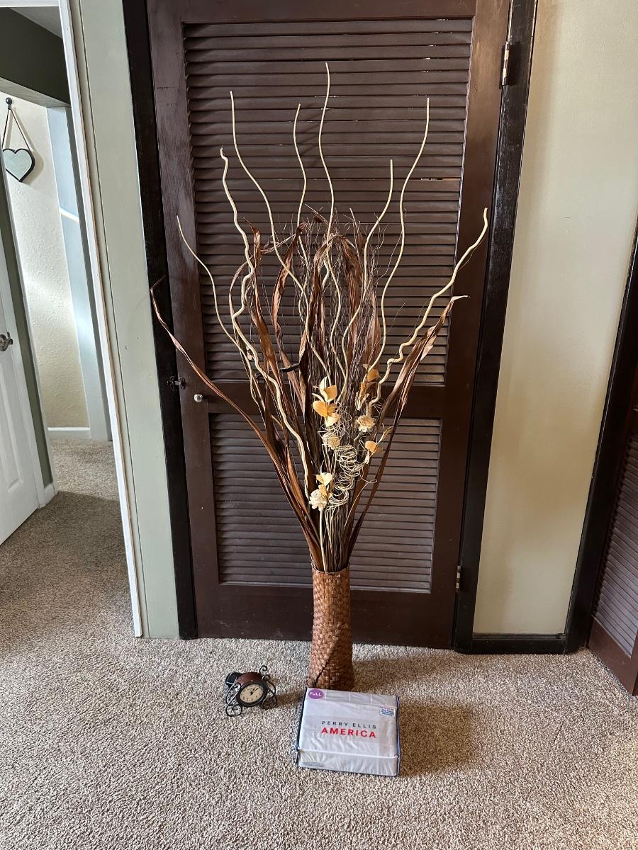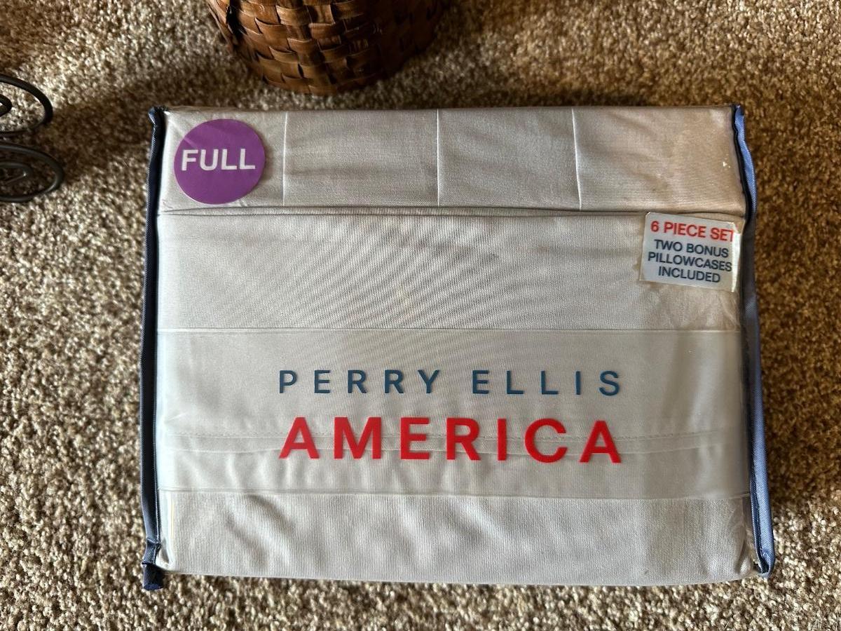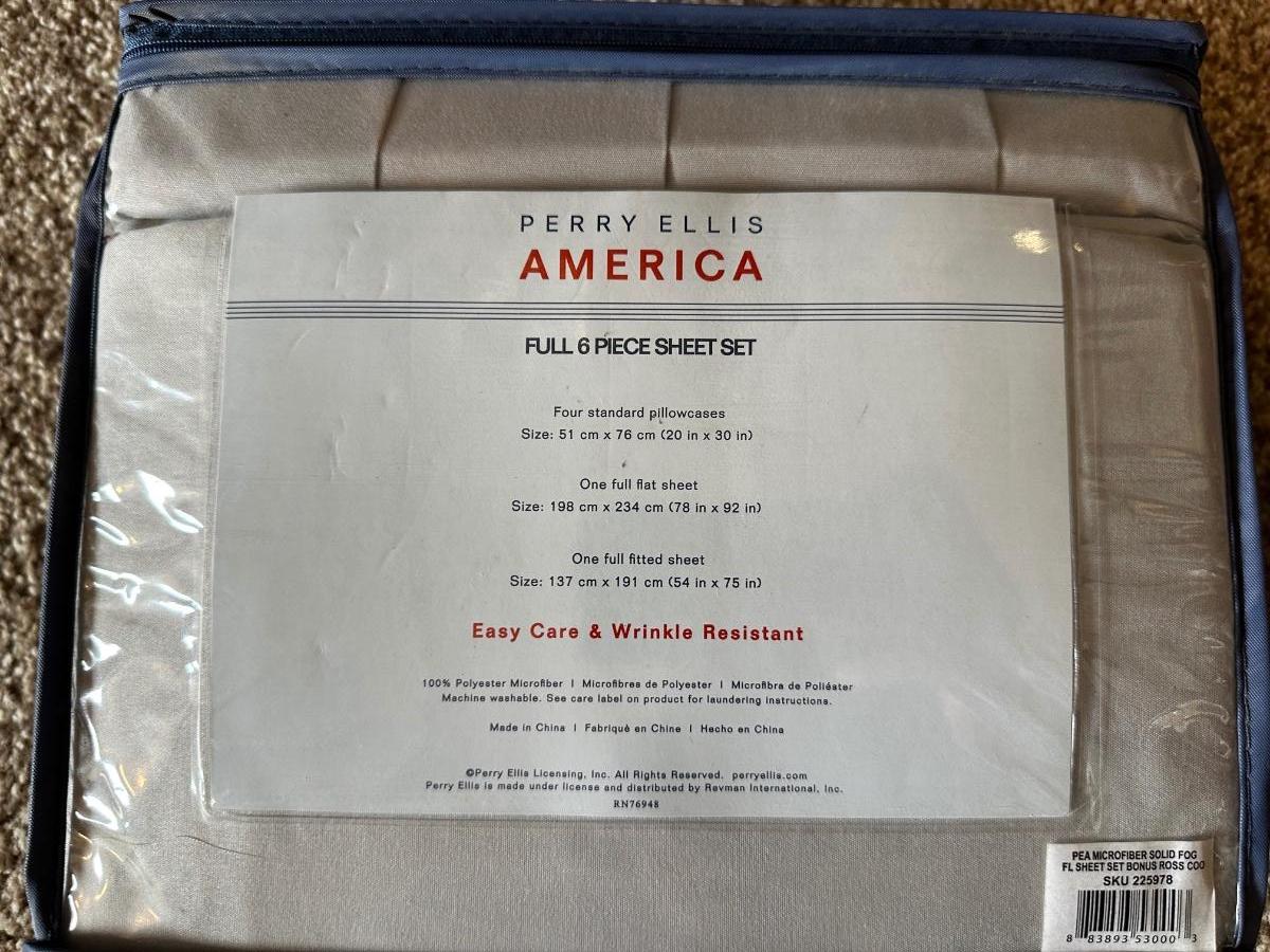 PERRY ELLIS 6 PIECE FULL SHEET SET, HOWARD MILLER CLOCK AND HOME DECOR VASE WITH FAUX PLANTS