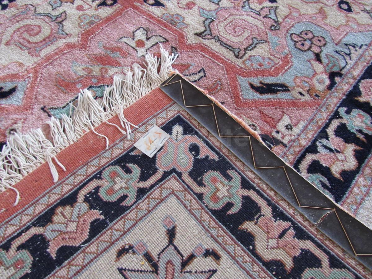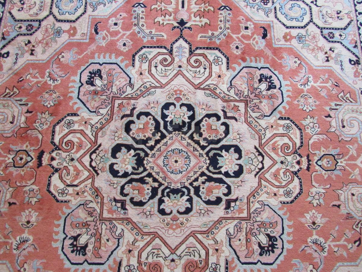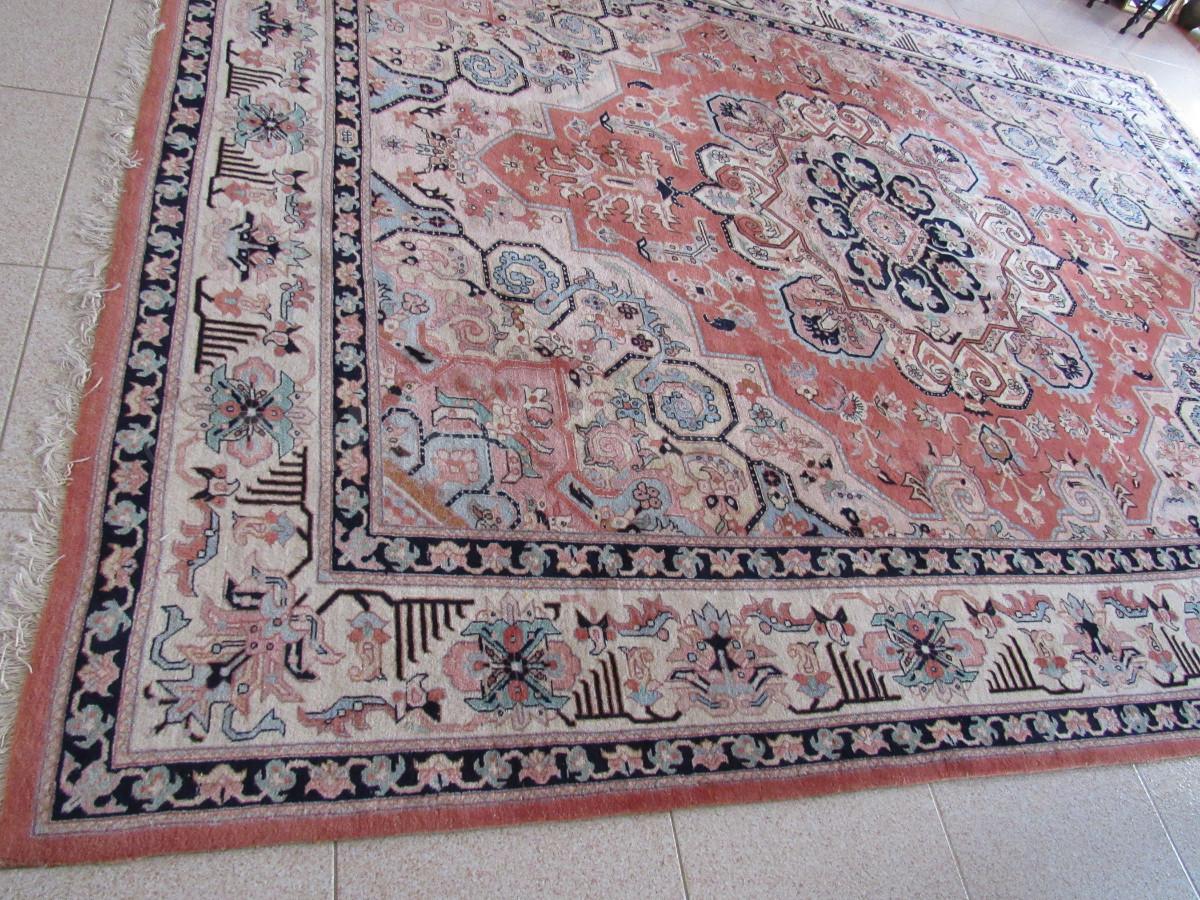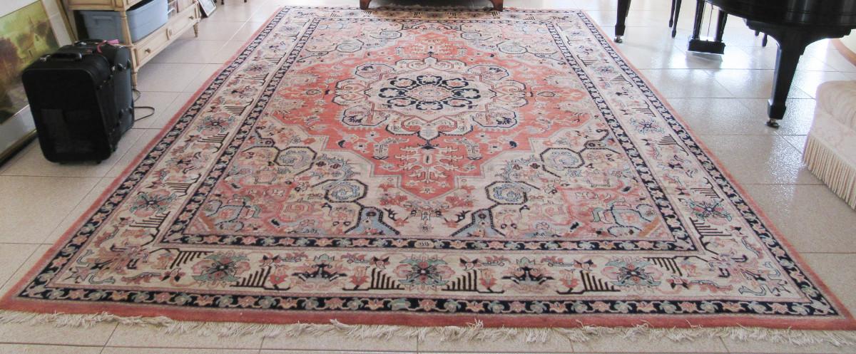 Persian Heriz hand-knotted wool rug, signed. Mauve. giant hole - discounted for damage