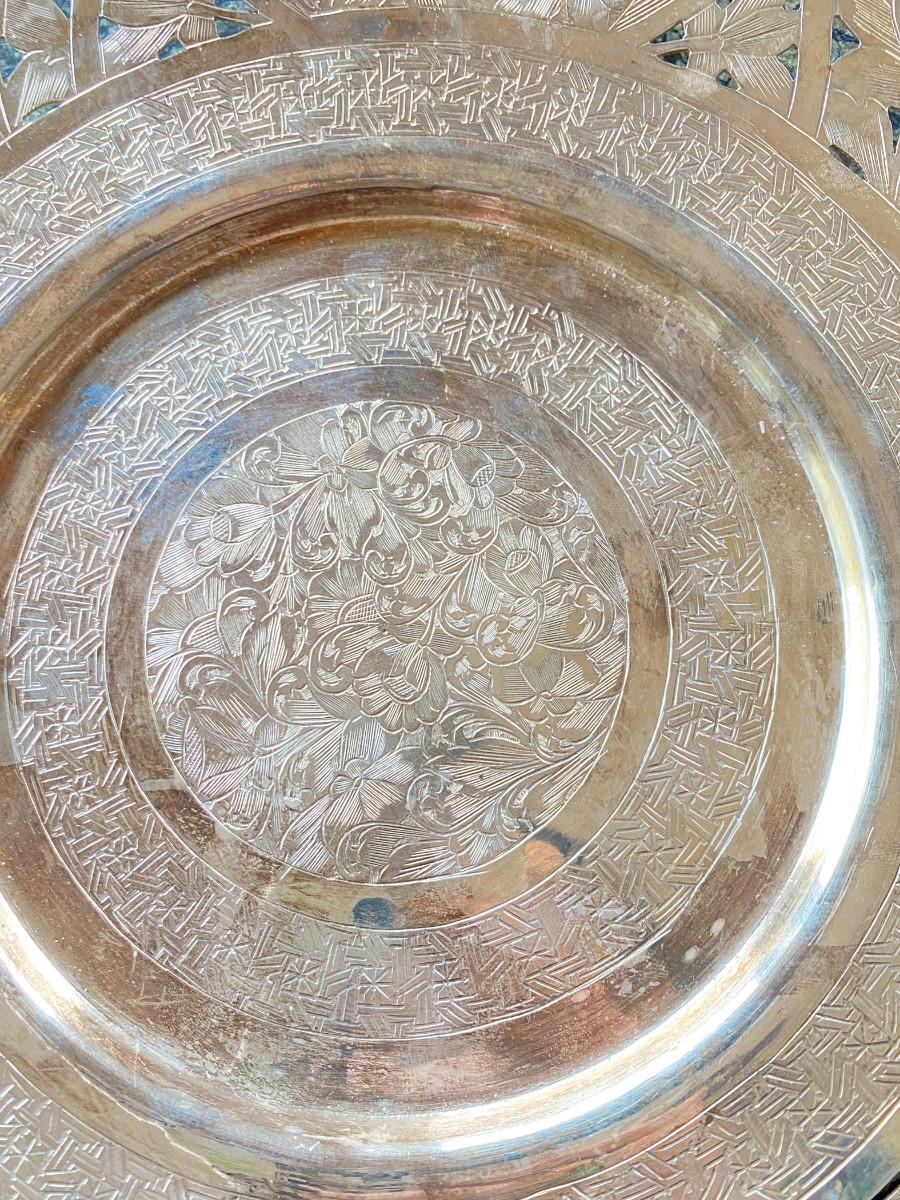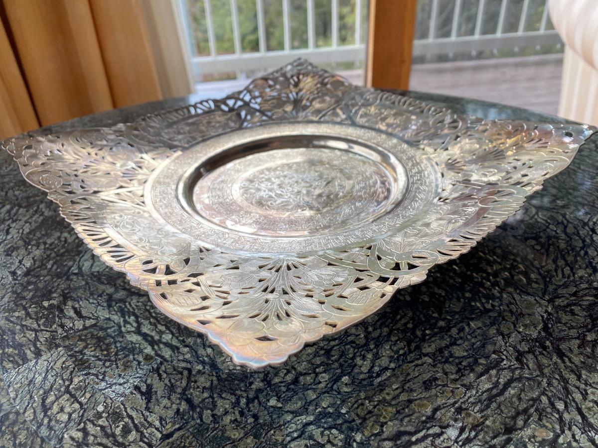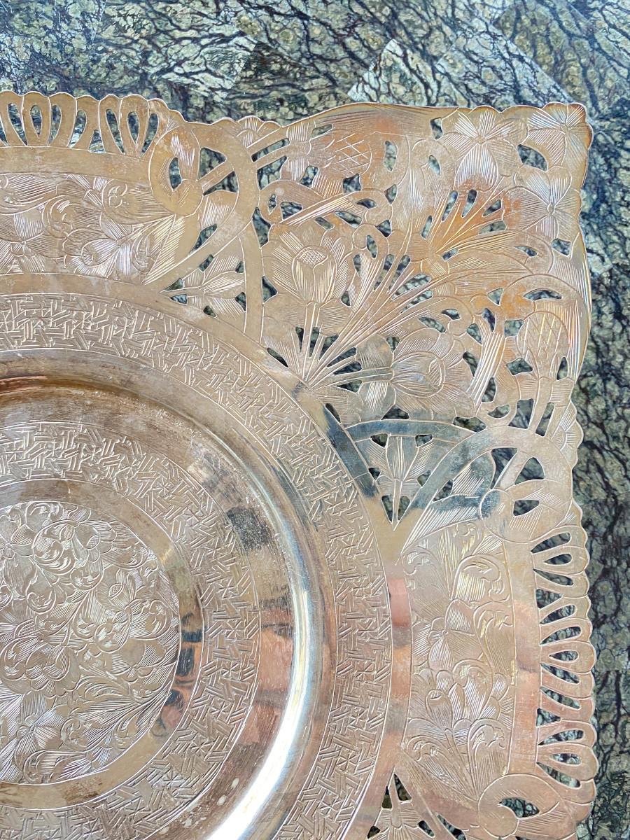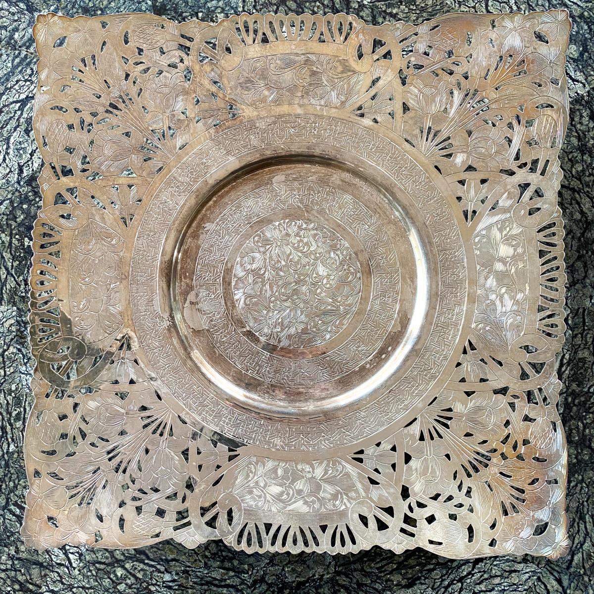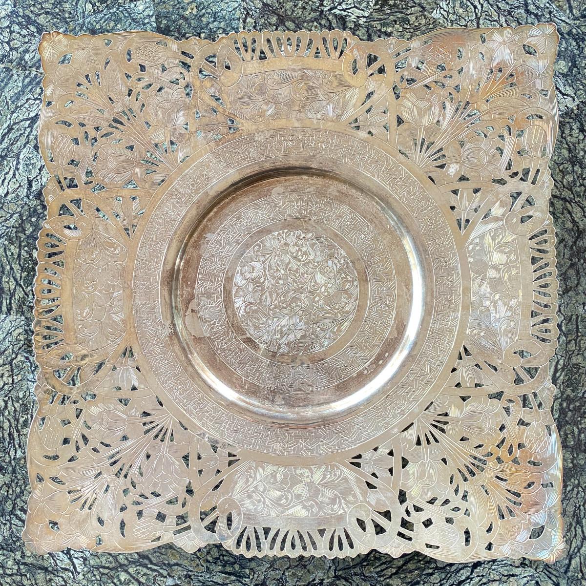 Persian footed square tray, 84 Russian standard silver, pierced and engraved. 20.860 ozt