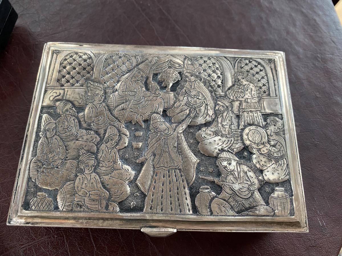 Persian footed standard silver répoussé box with hinged lid. 14.180 ozt. 84 Russian standard silver = 87.5% silver