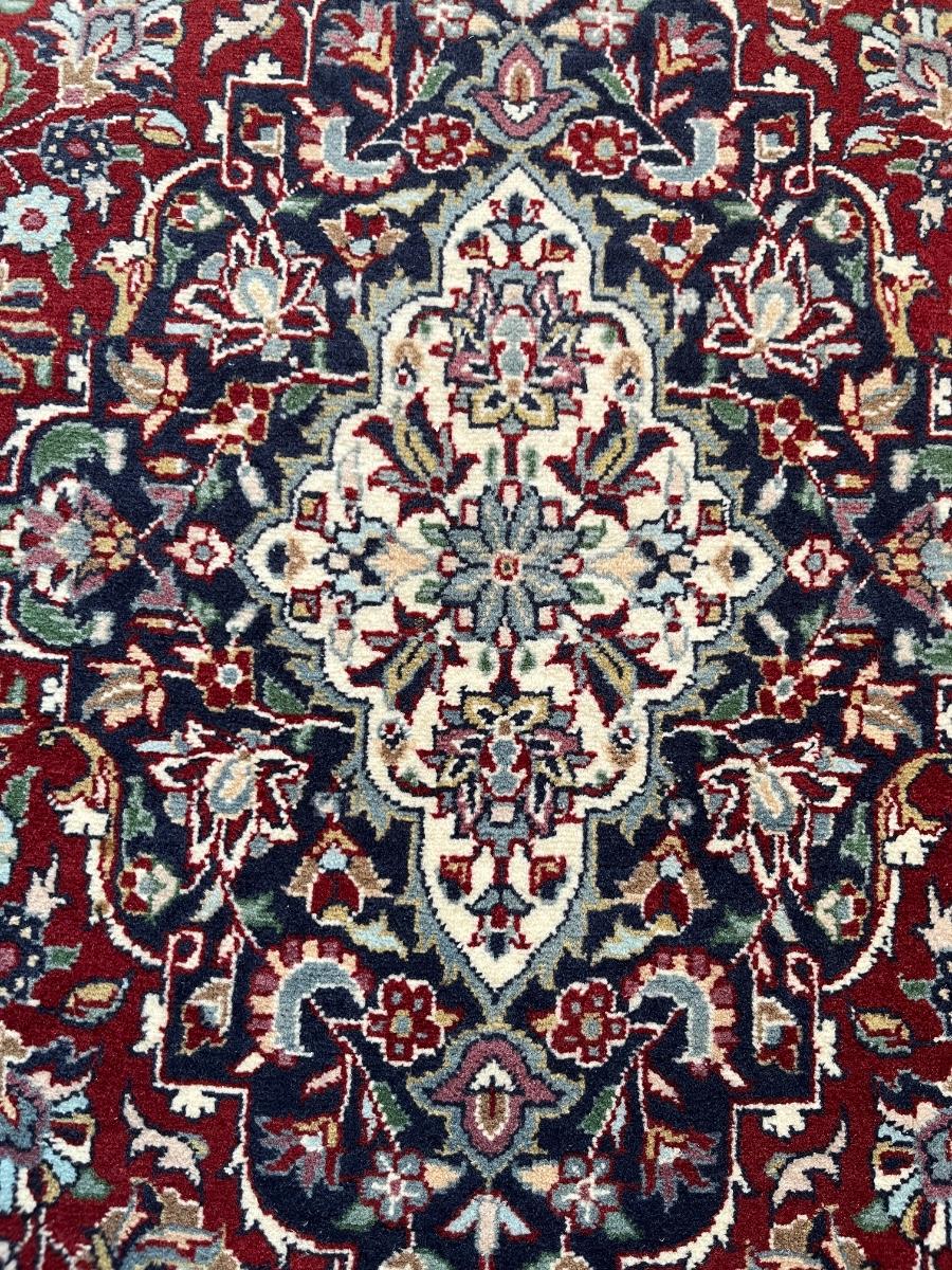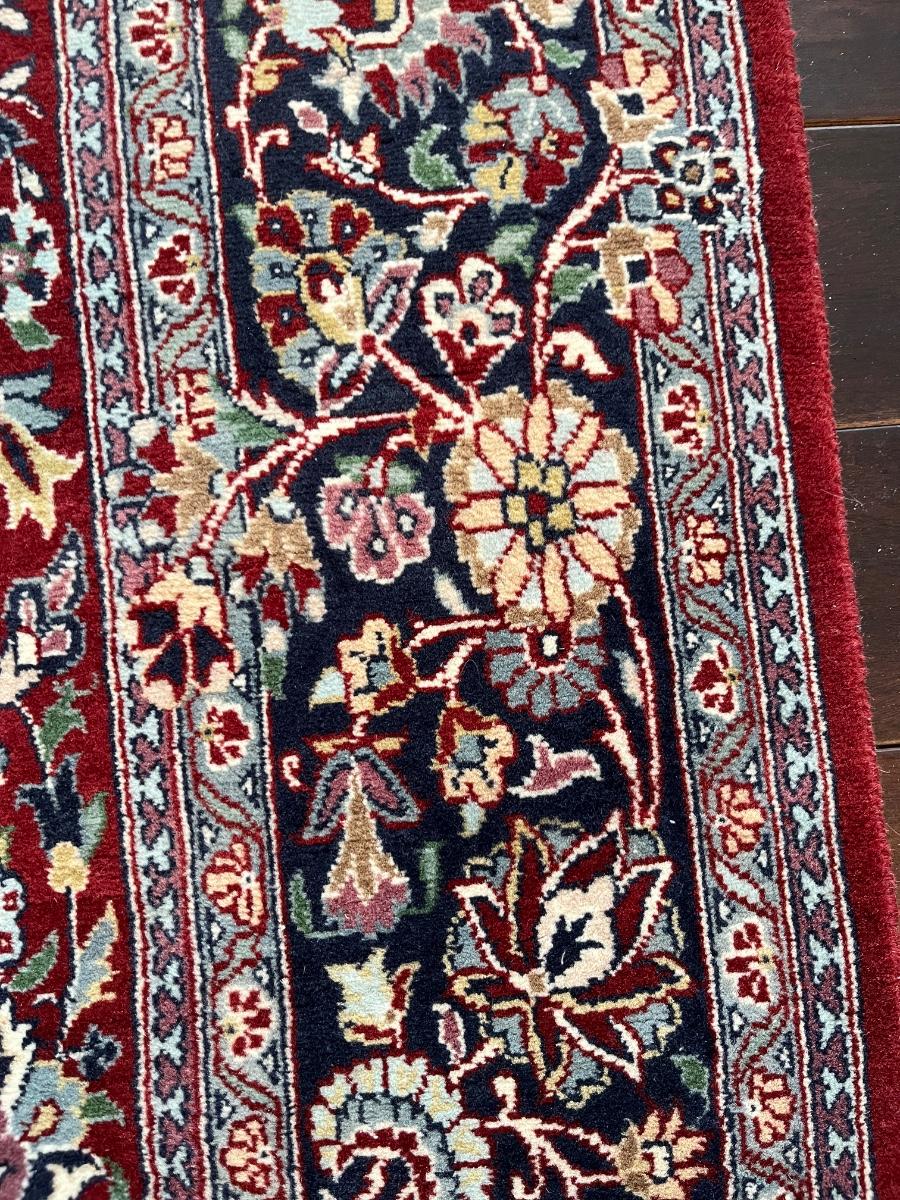 A hand knotted Kashan Persian rug all done in wool with a burgundy background and designs in navy, ivory, pale blue and gray.