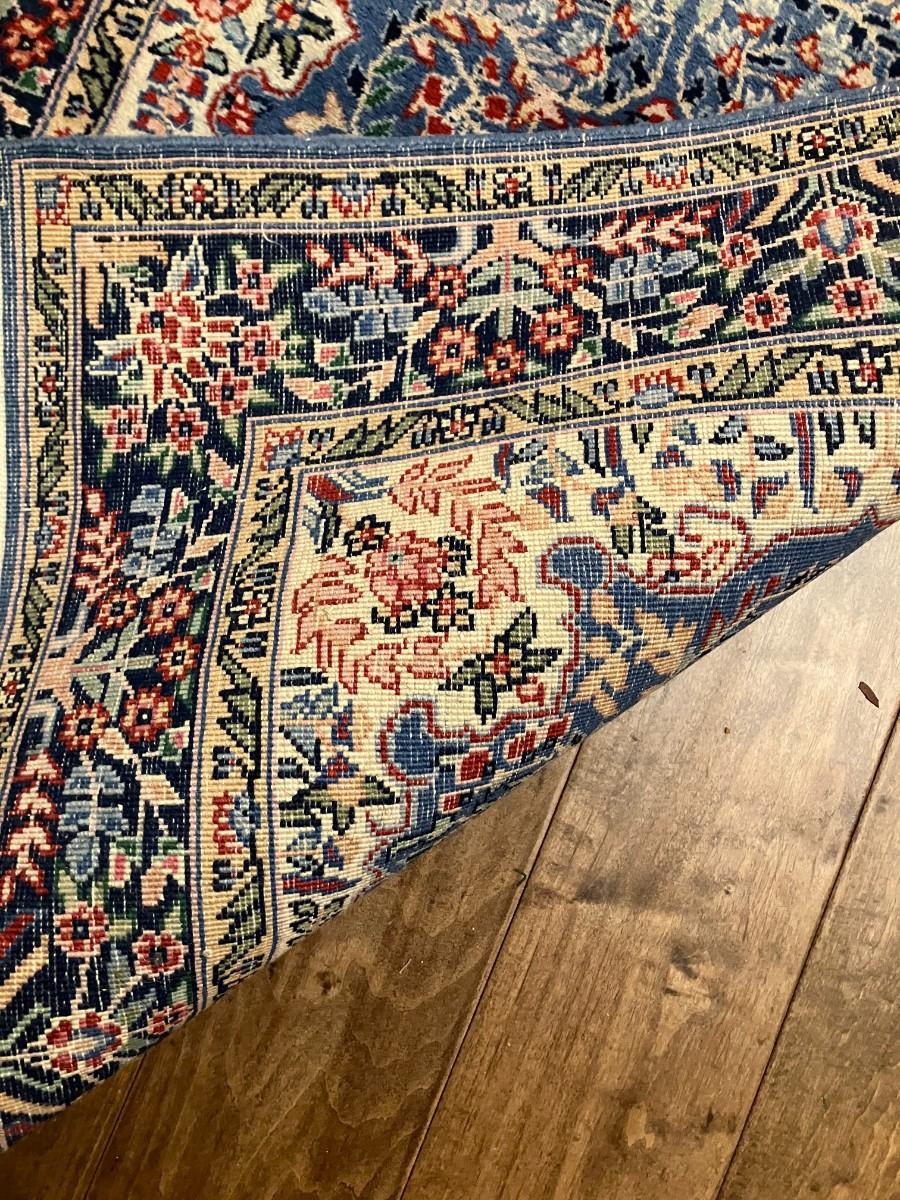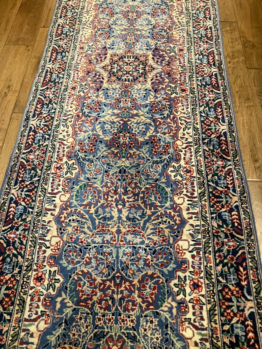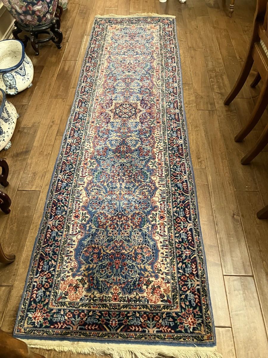 Persian rug blue runner measuring 112" L x 30" W, excellent condition with normal wear but no damage