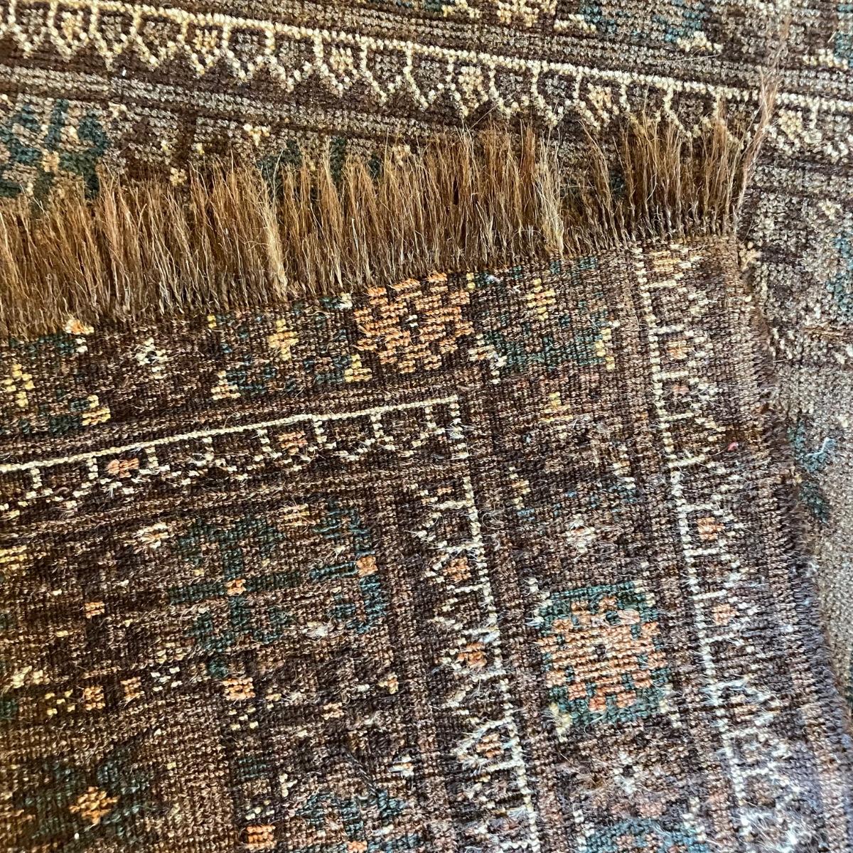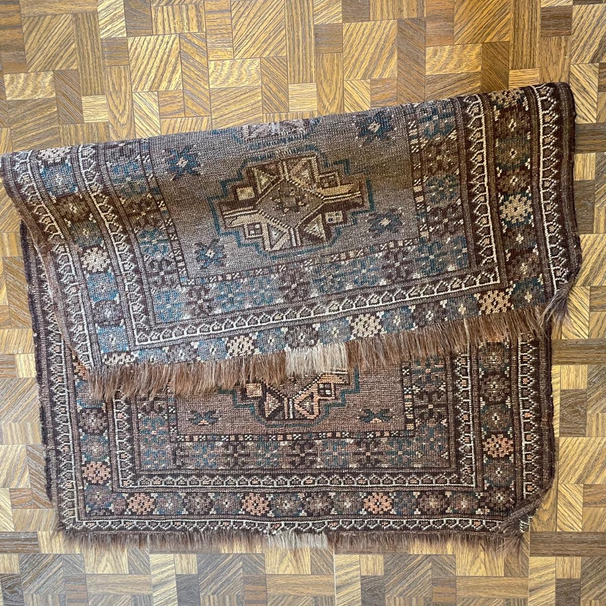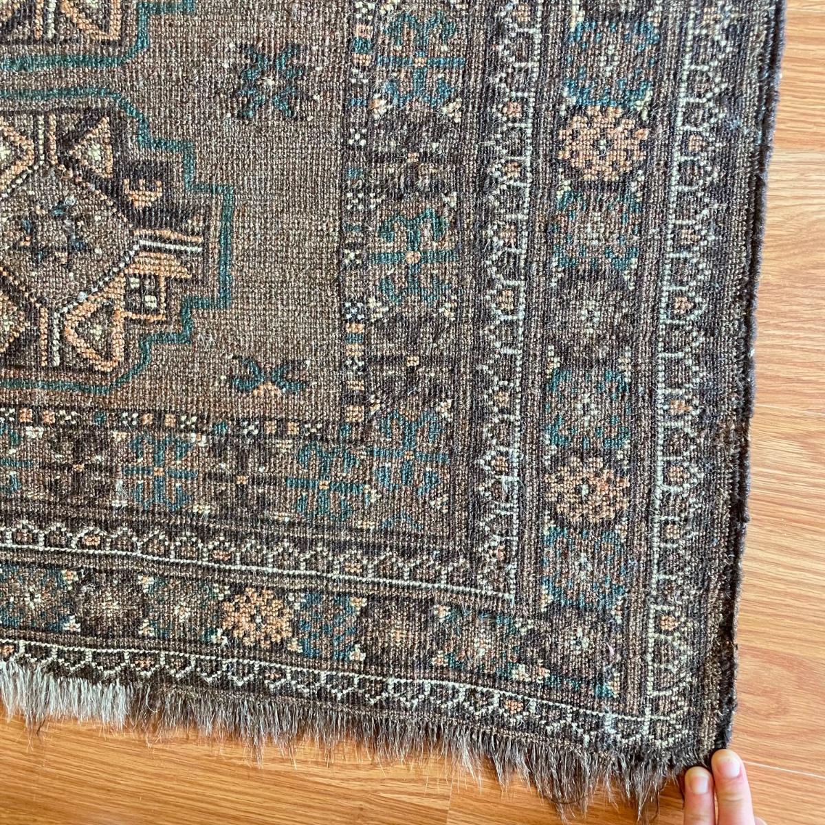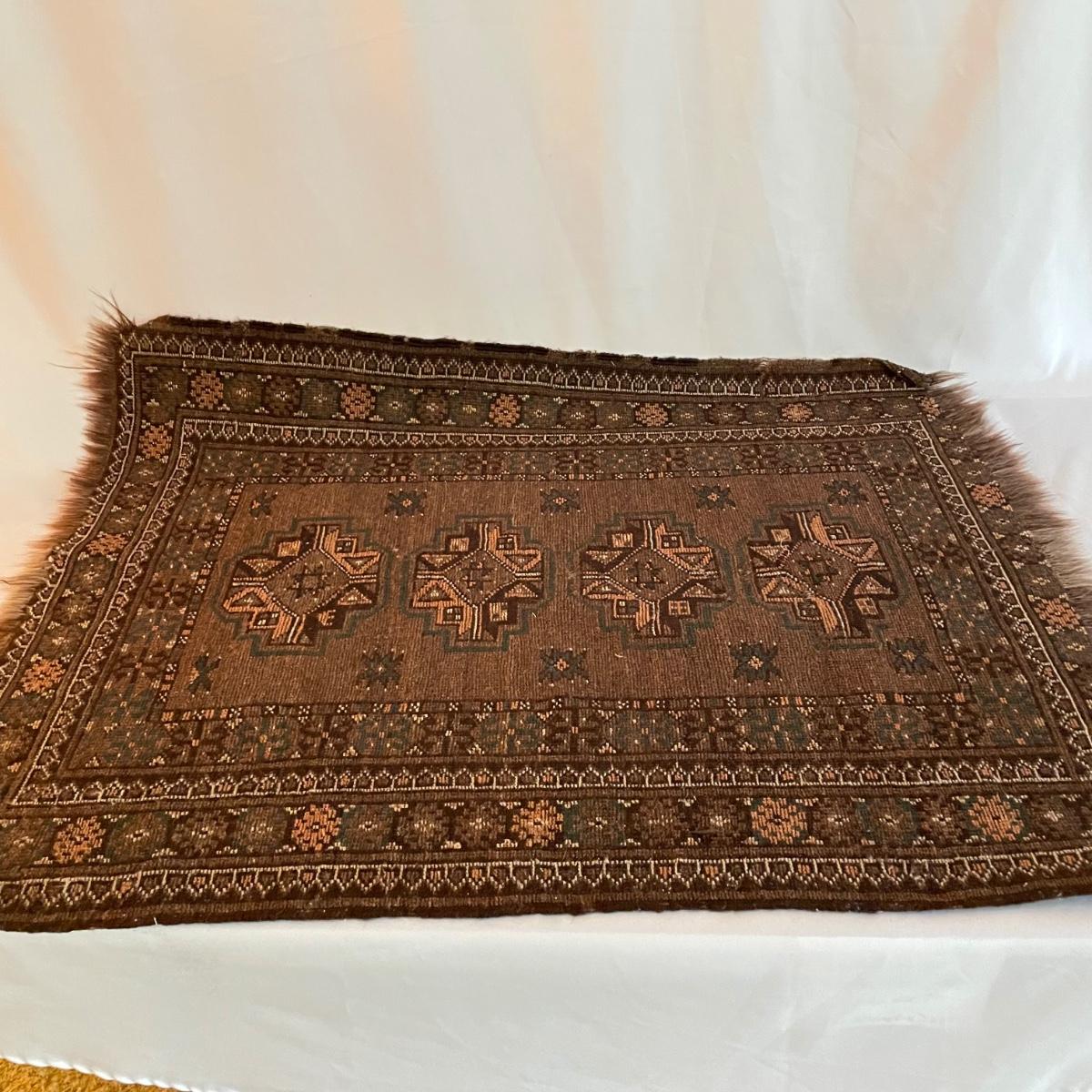 Stunning brown Persian rug measures approximately 31” x 39”. One side has salmon and teal accents, the other side is more tan and teal. The rug is in amazing shape, with a light stripe on its side of its fringe and mild wear on the edges. See images. Shipping available.