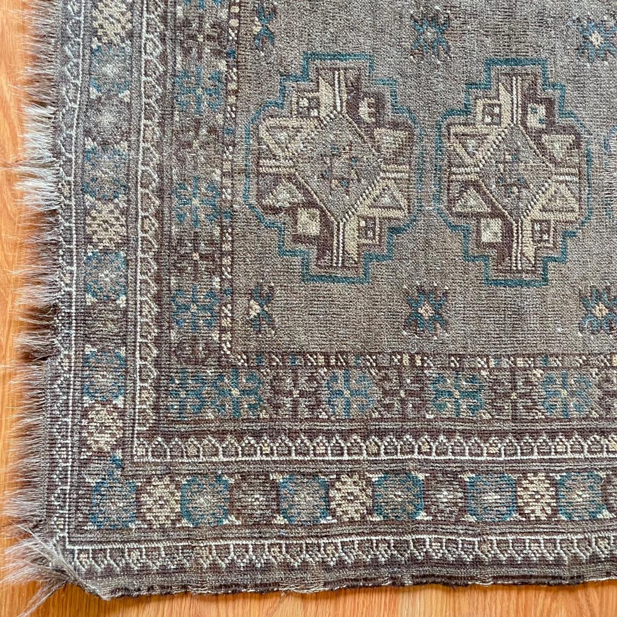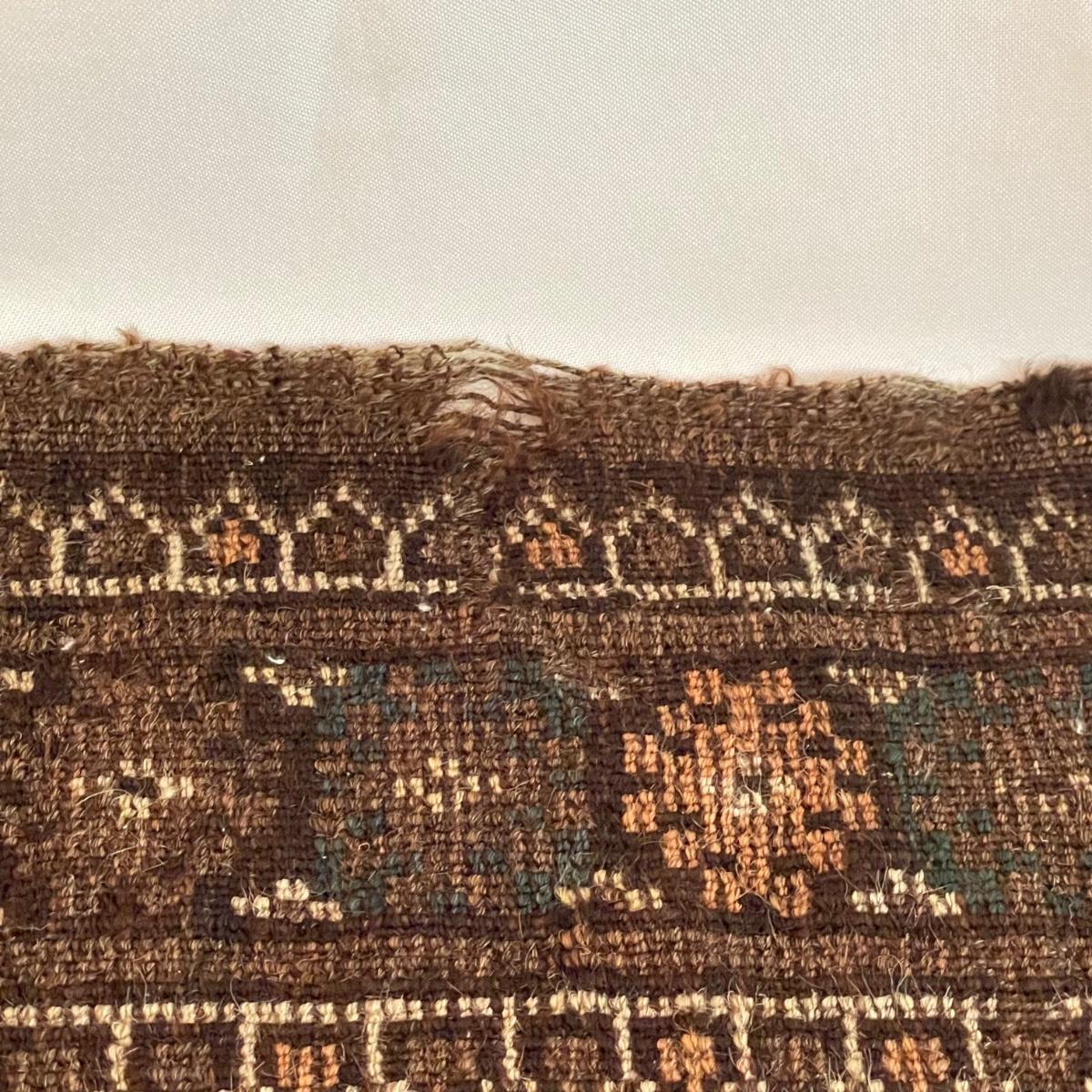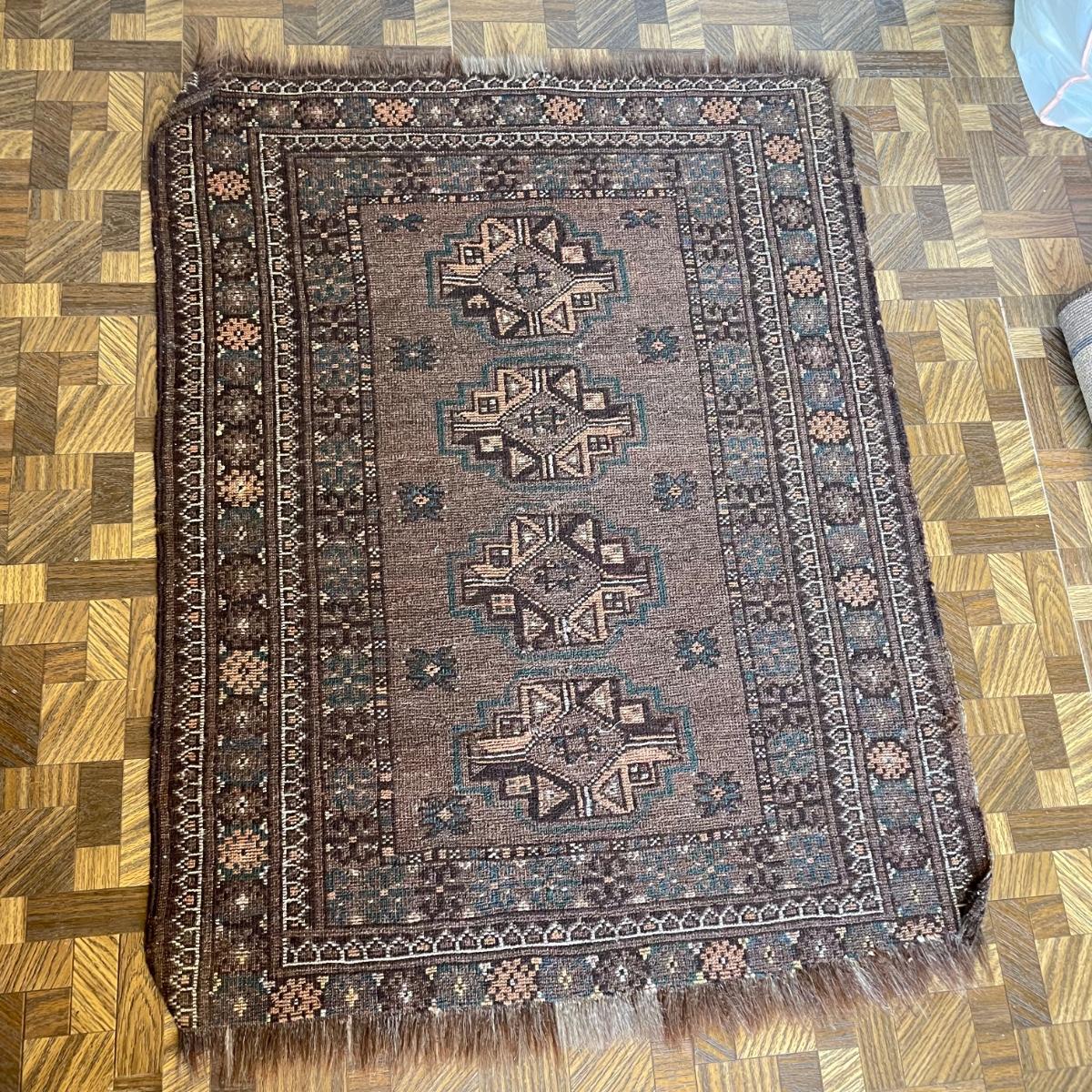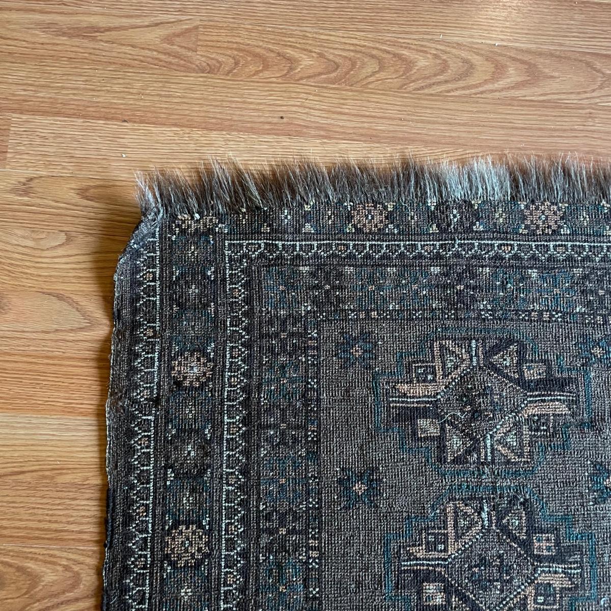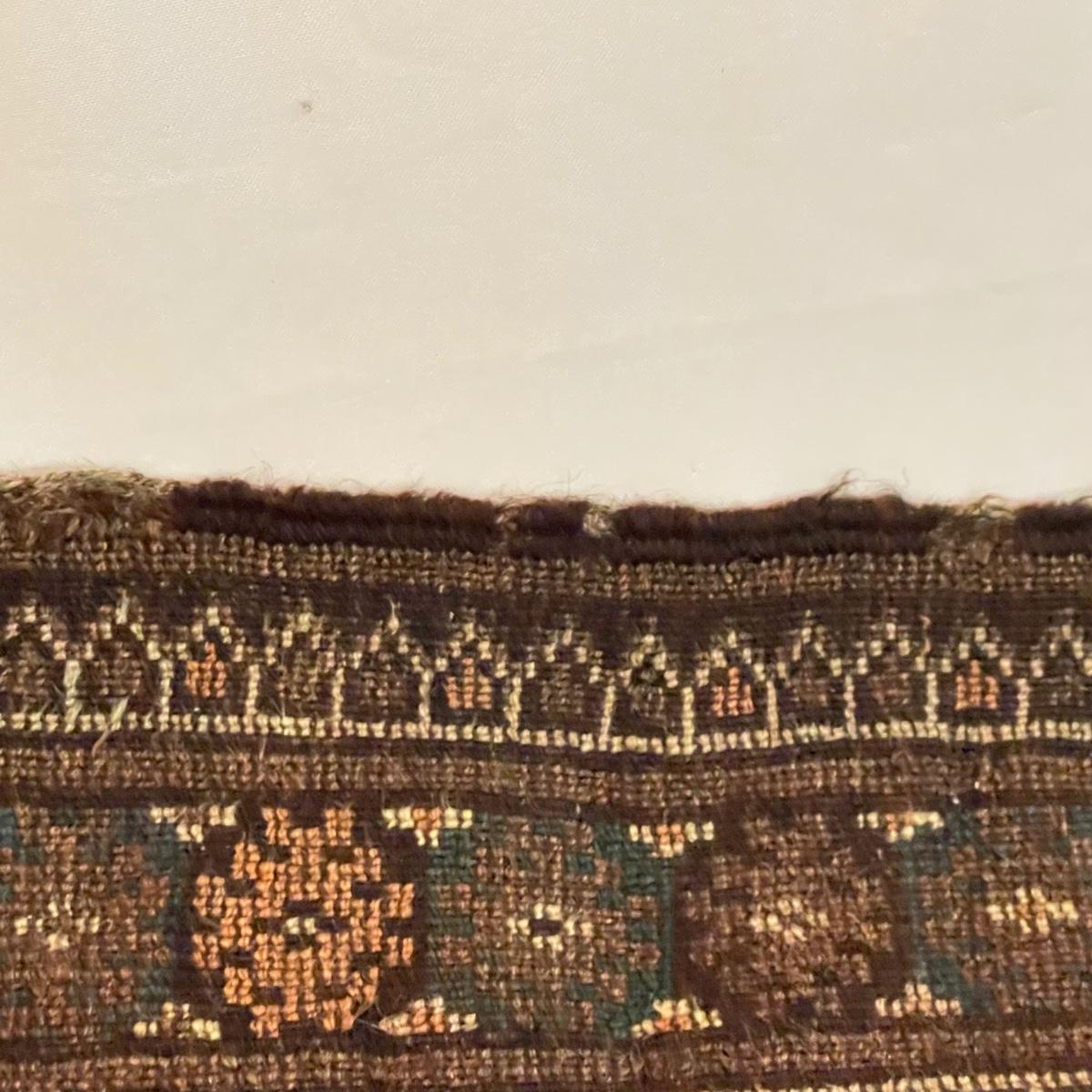 Stunning brown Persian rug measures approximately 31” x 39”. One side has salmon and teal accents, the other side is more tan and teal. The rug is in amazing shape, with a light stripe on its side of its fringe and mild wear on the edges. See images. Shipping available.