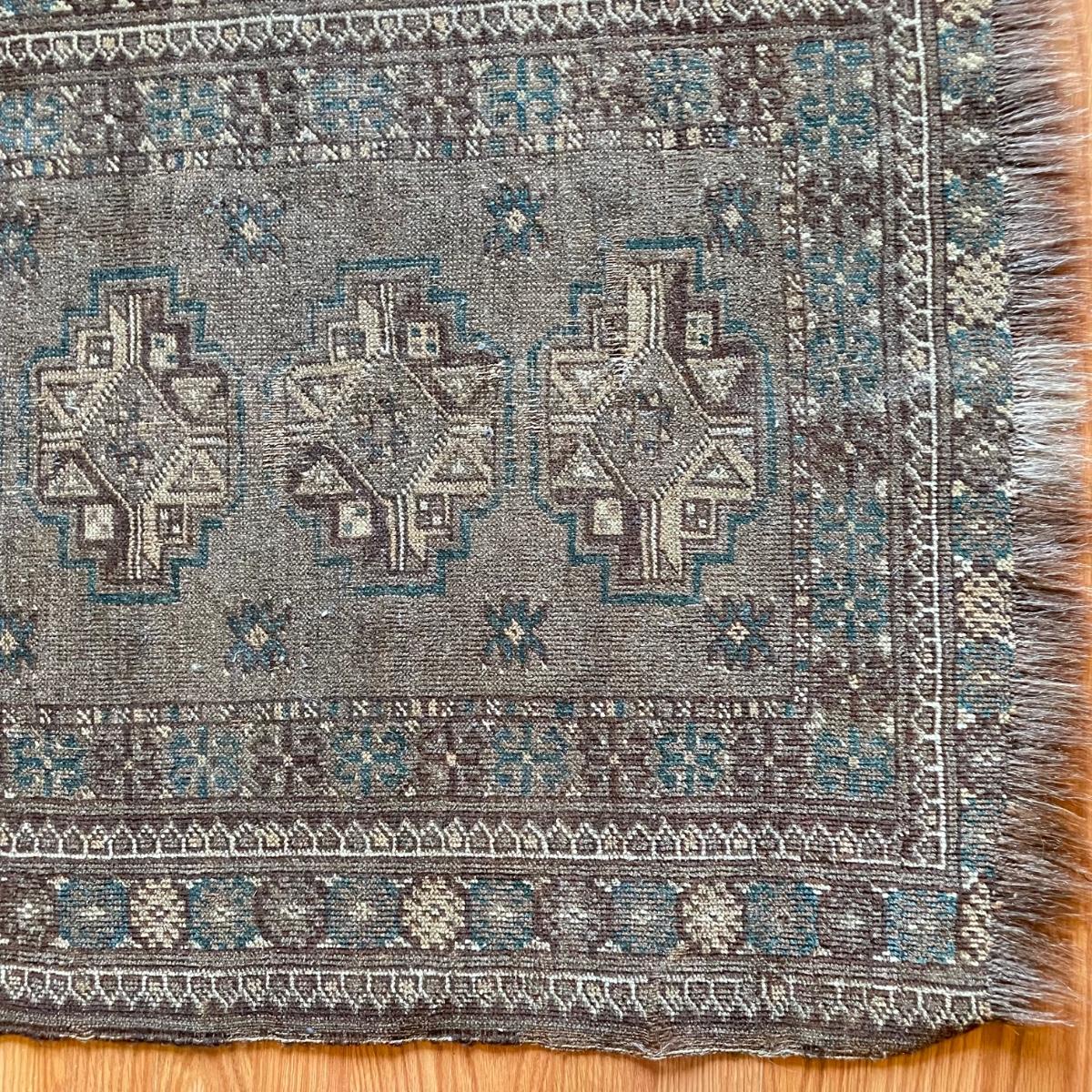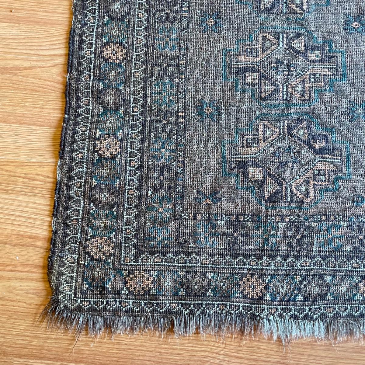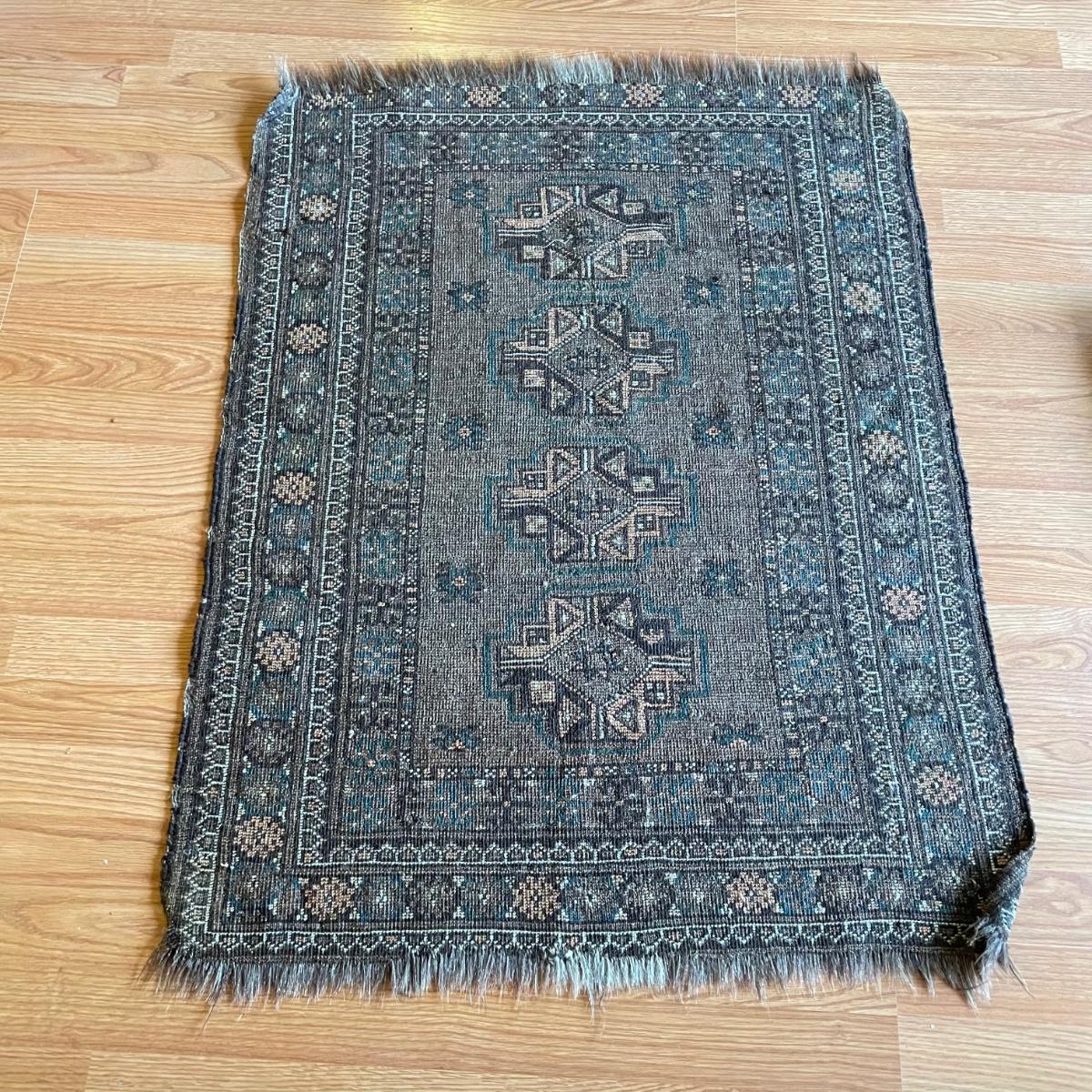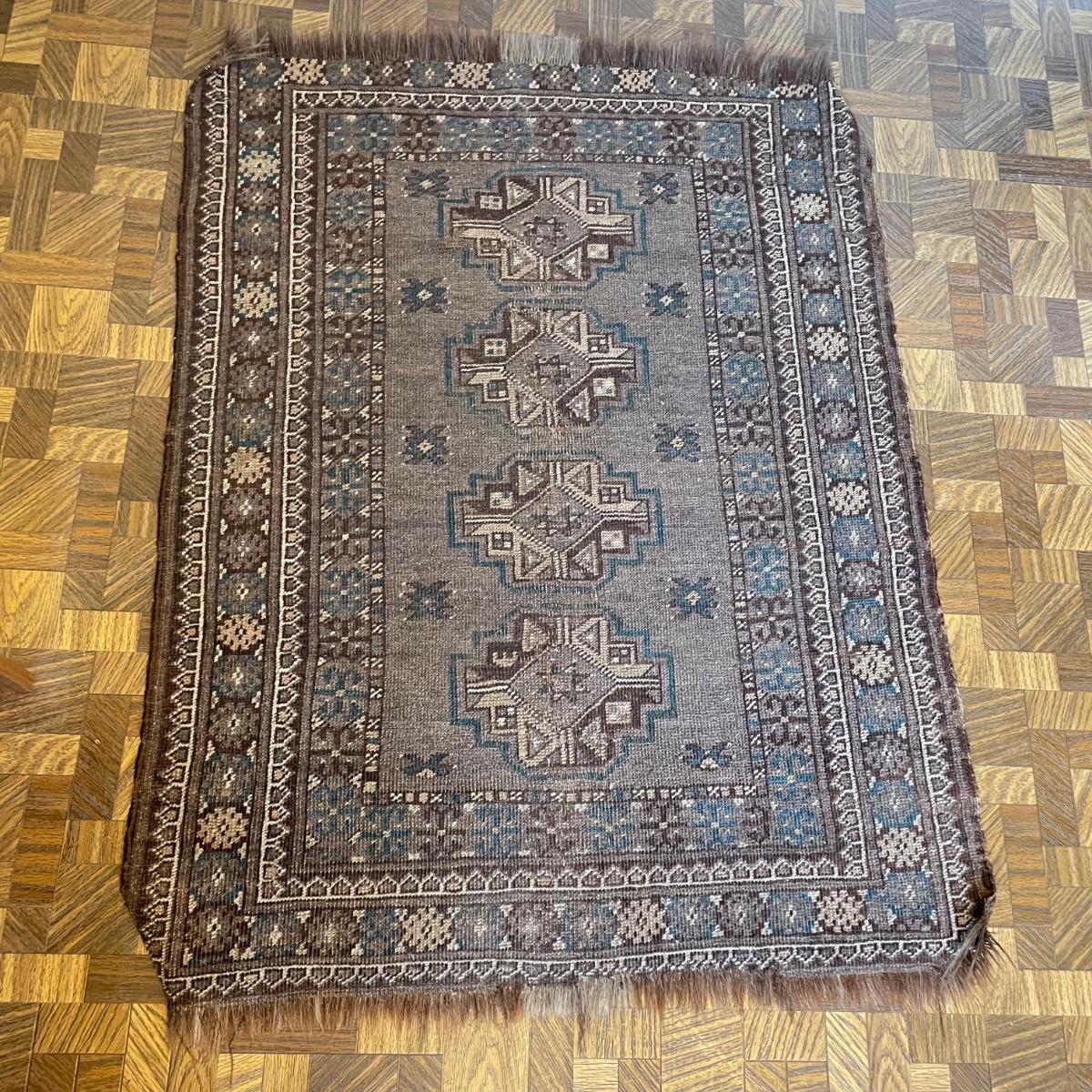 Stunning brown Persian rug measures approximately 31” x 39”. One side has salmon and teal accents, the other side is more tan and teal. The rug is in amazing shape, with a light stripe on its side of its fringe and mild wear on the edges. See images. Shipping available.