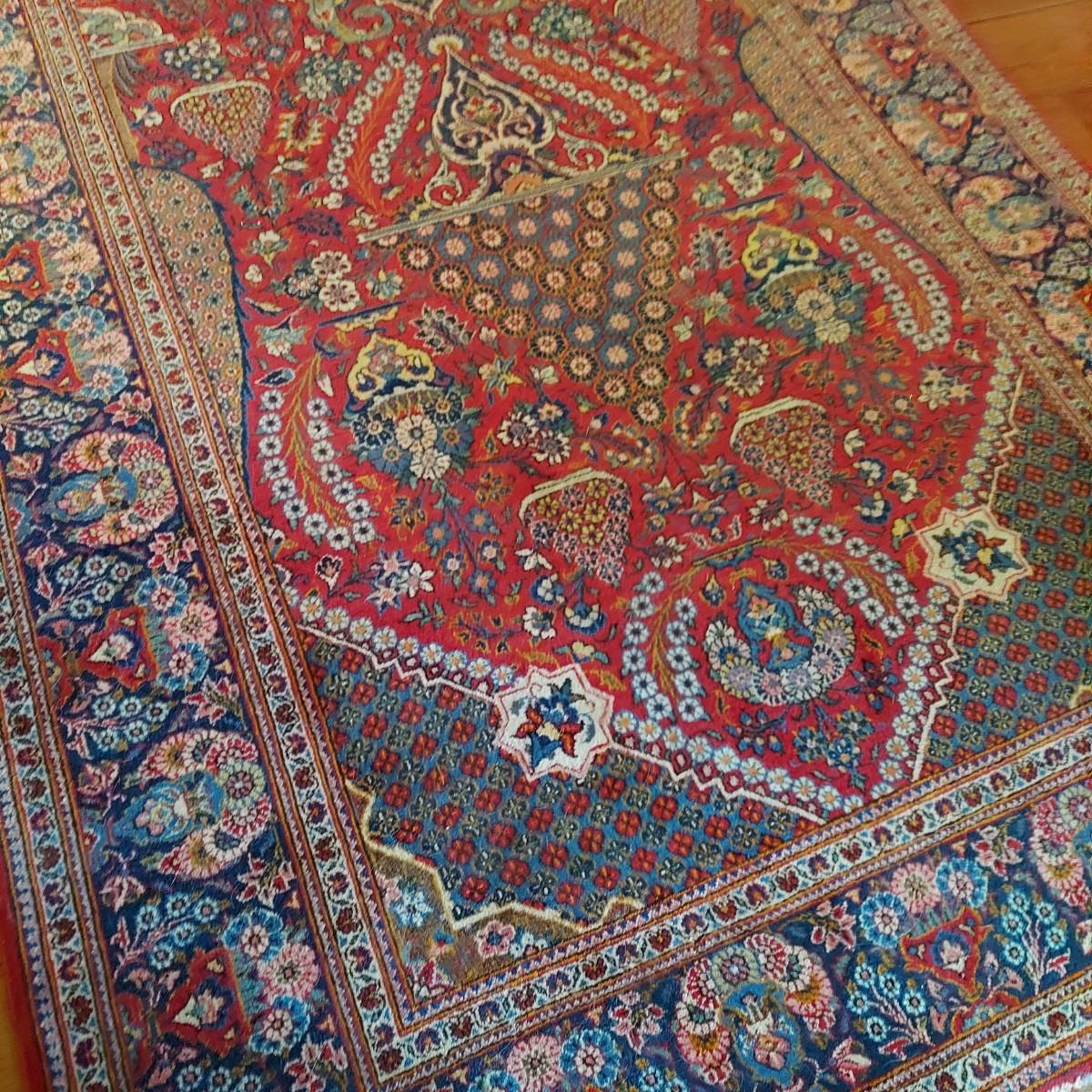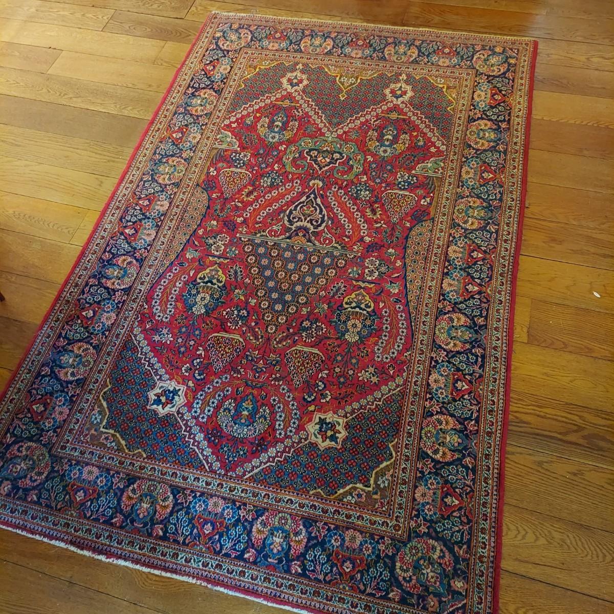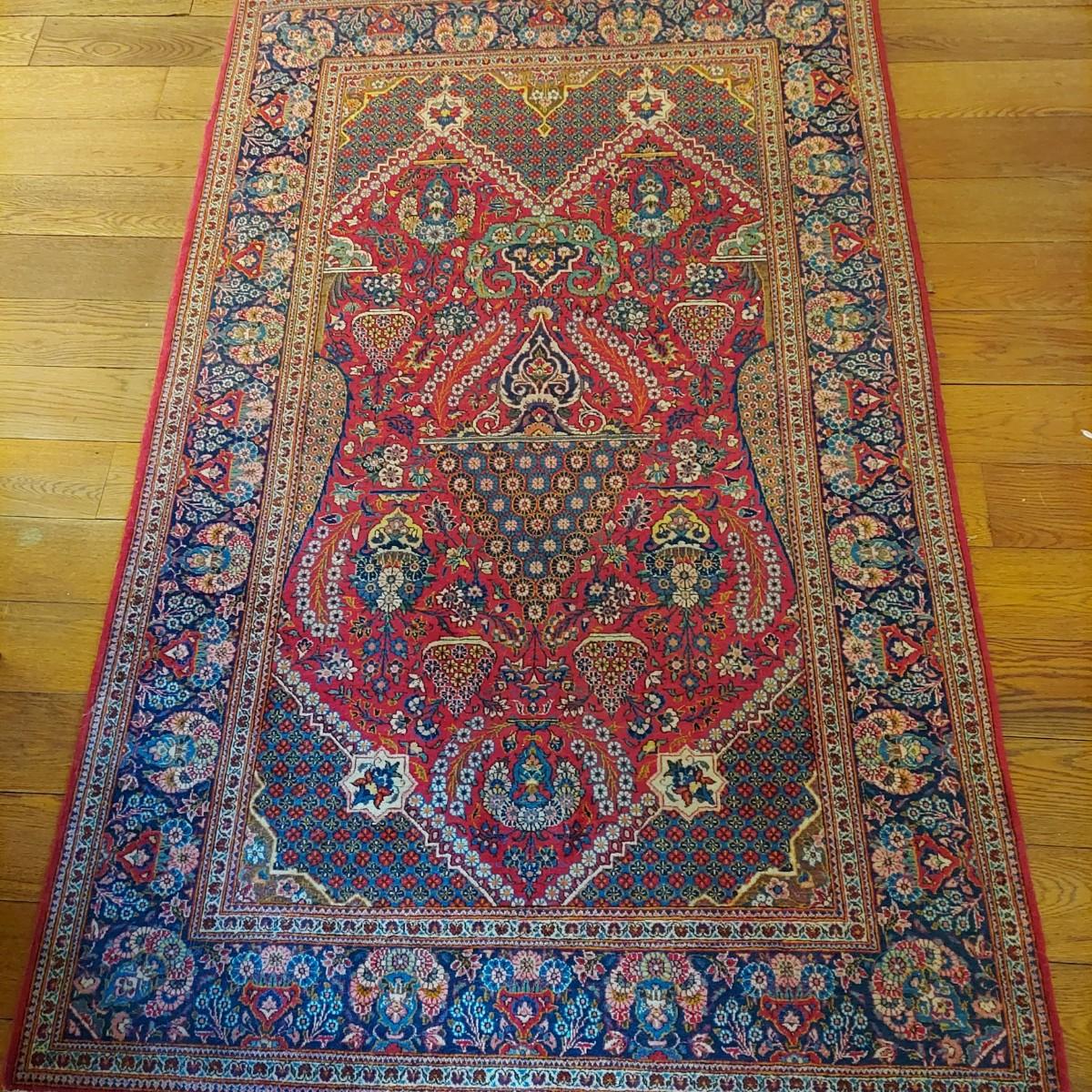 Blue and Red Persian style area rug. Appears to be wool. Measures 4'5" x 6'11". Comes with rug pad. Local Pickup Only.
