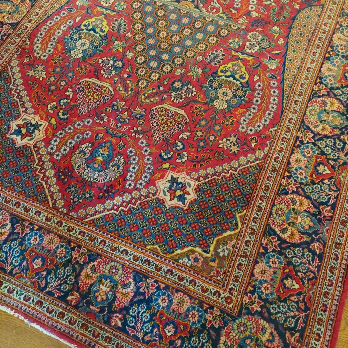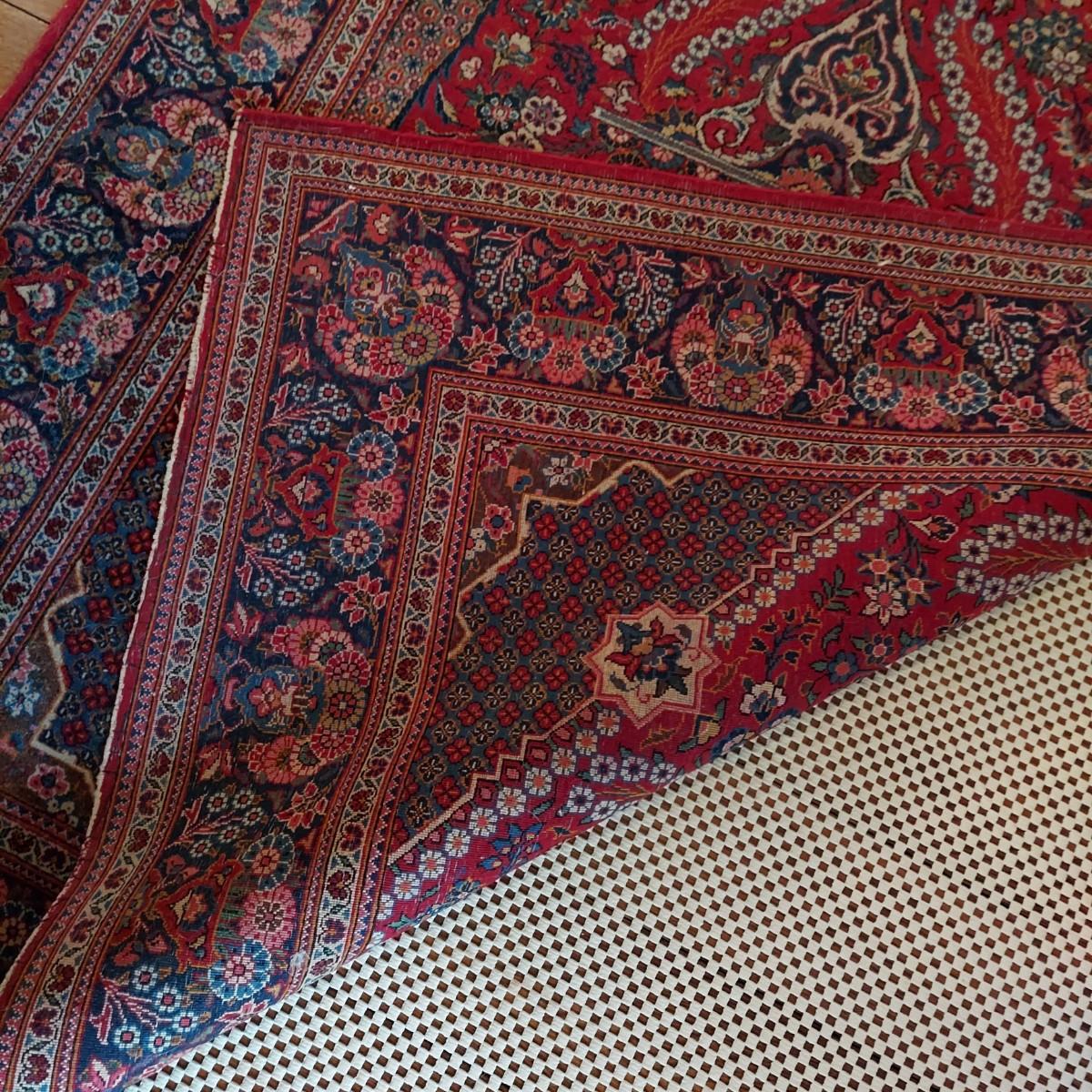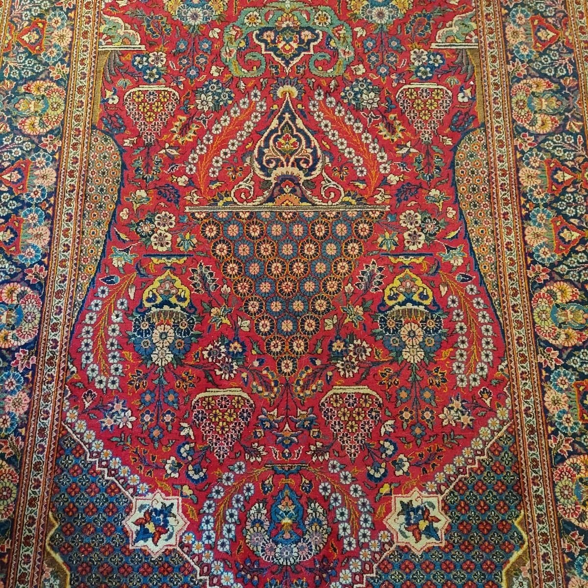 Blue and Red Persian style area rug. Appears to be wool. Measures 4'5" x 6'11". Comes with rug pad. Local Pickup Only.