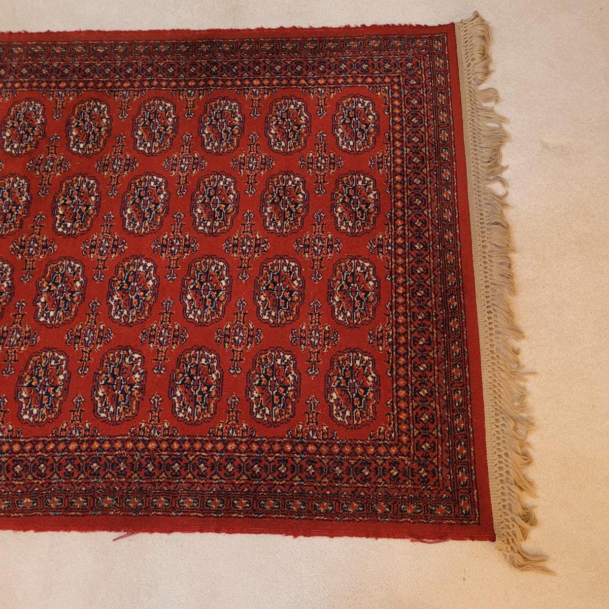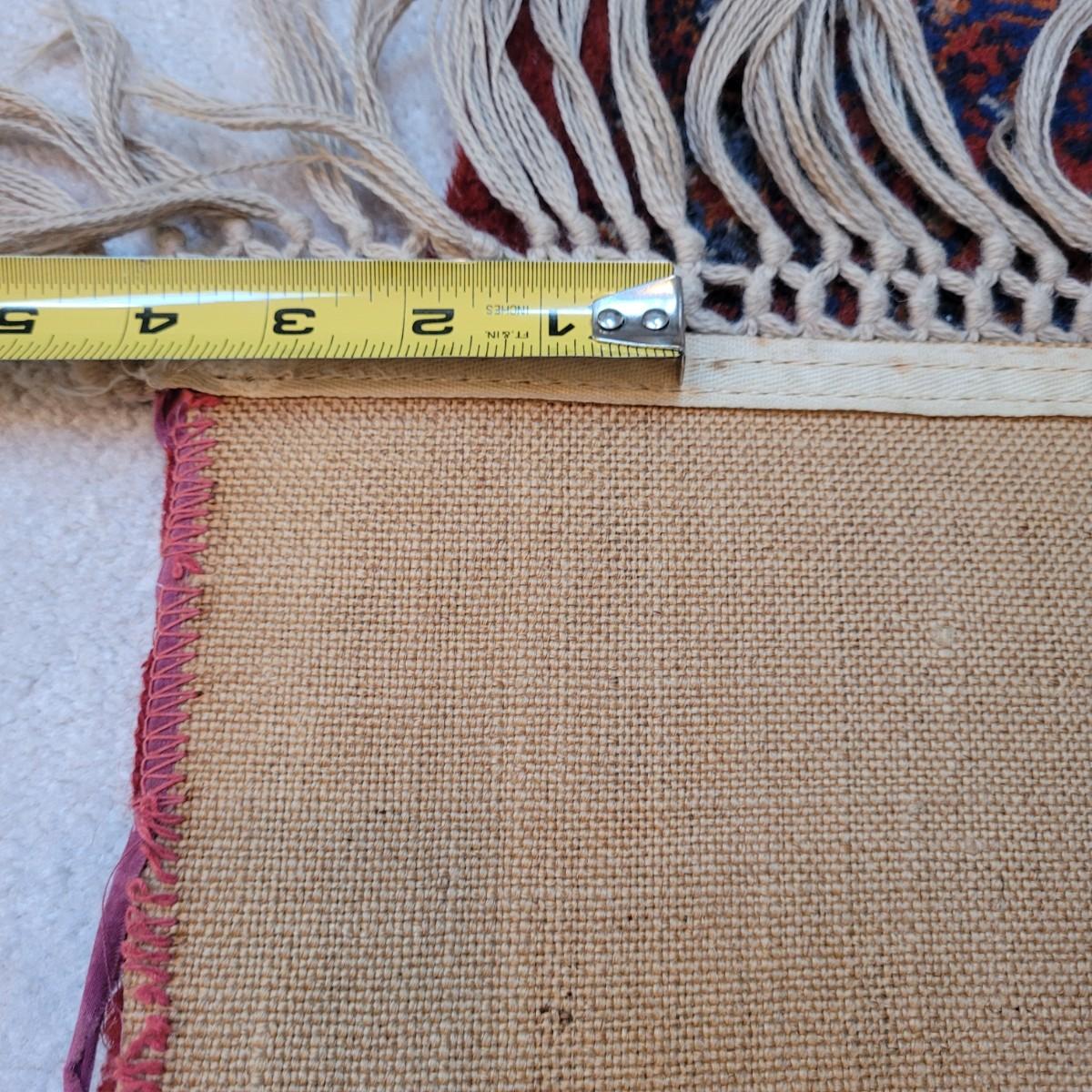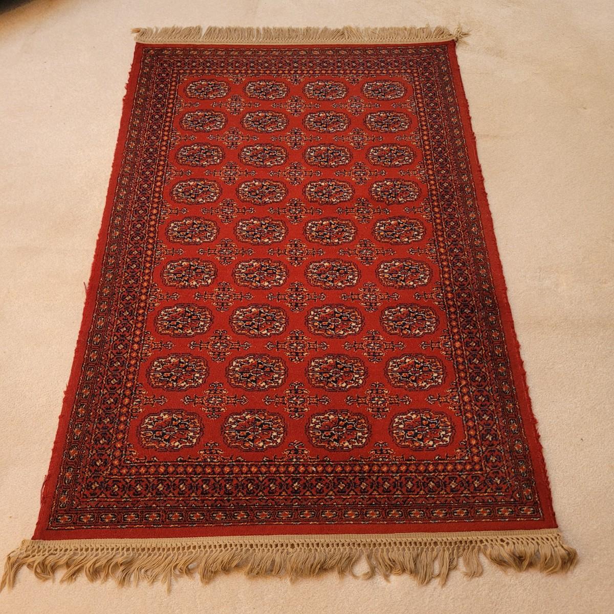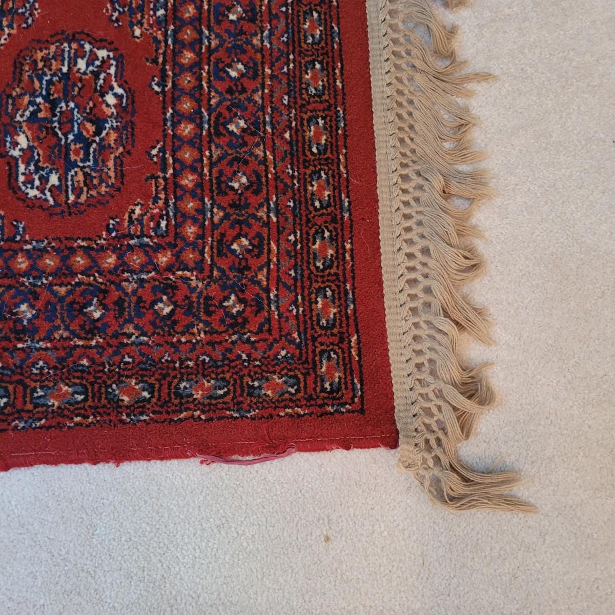 This 100% wool pile rug features a beautiful maroon red design with blue and white details. Tag states that it is an Oriental style Karastan rug. Rug measures 47" x 78" (approx. 4' x 6.5'). There is some fraying on the edges.
