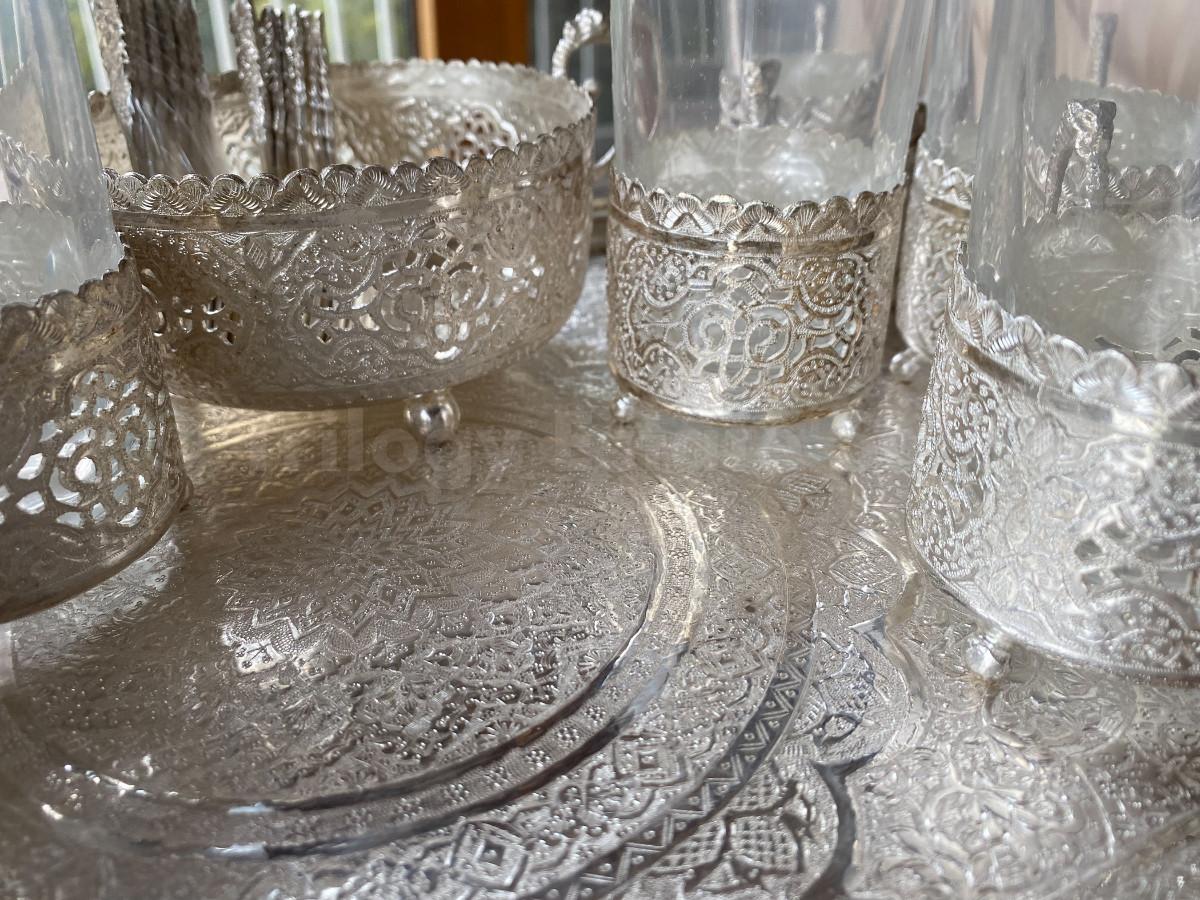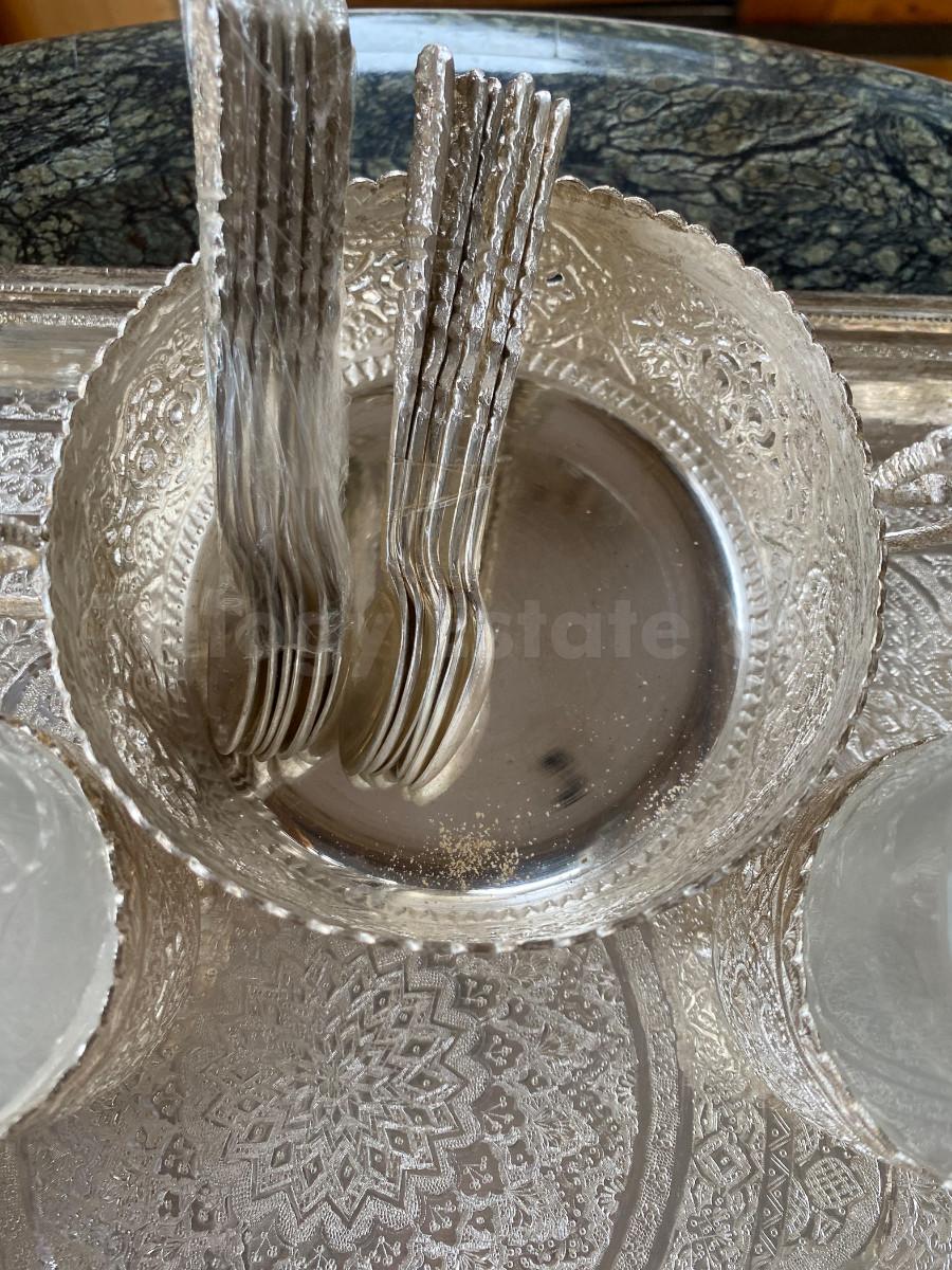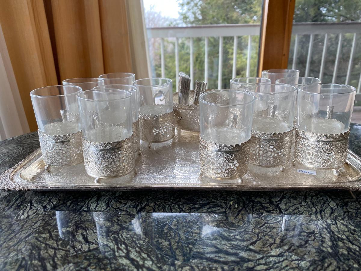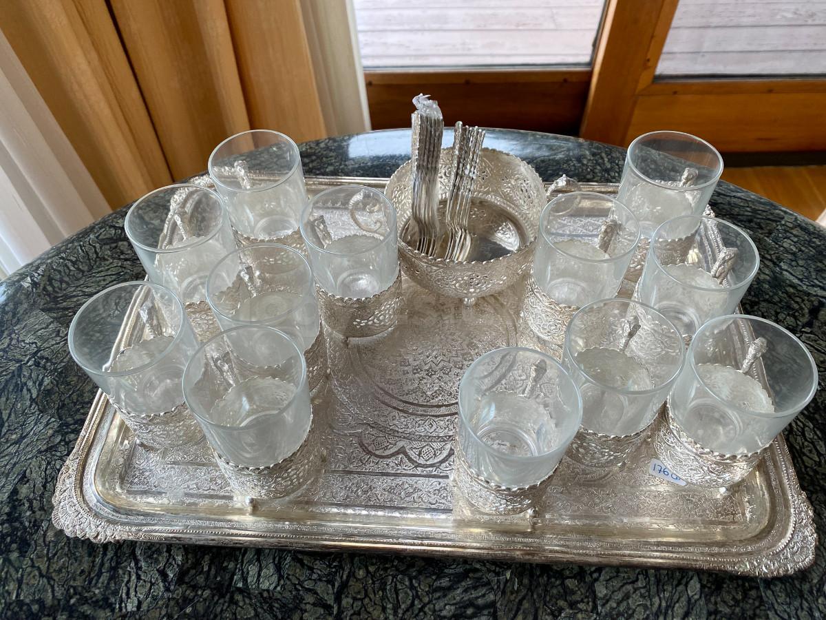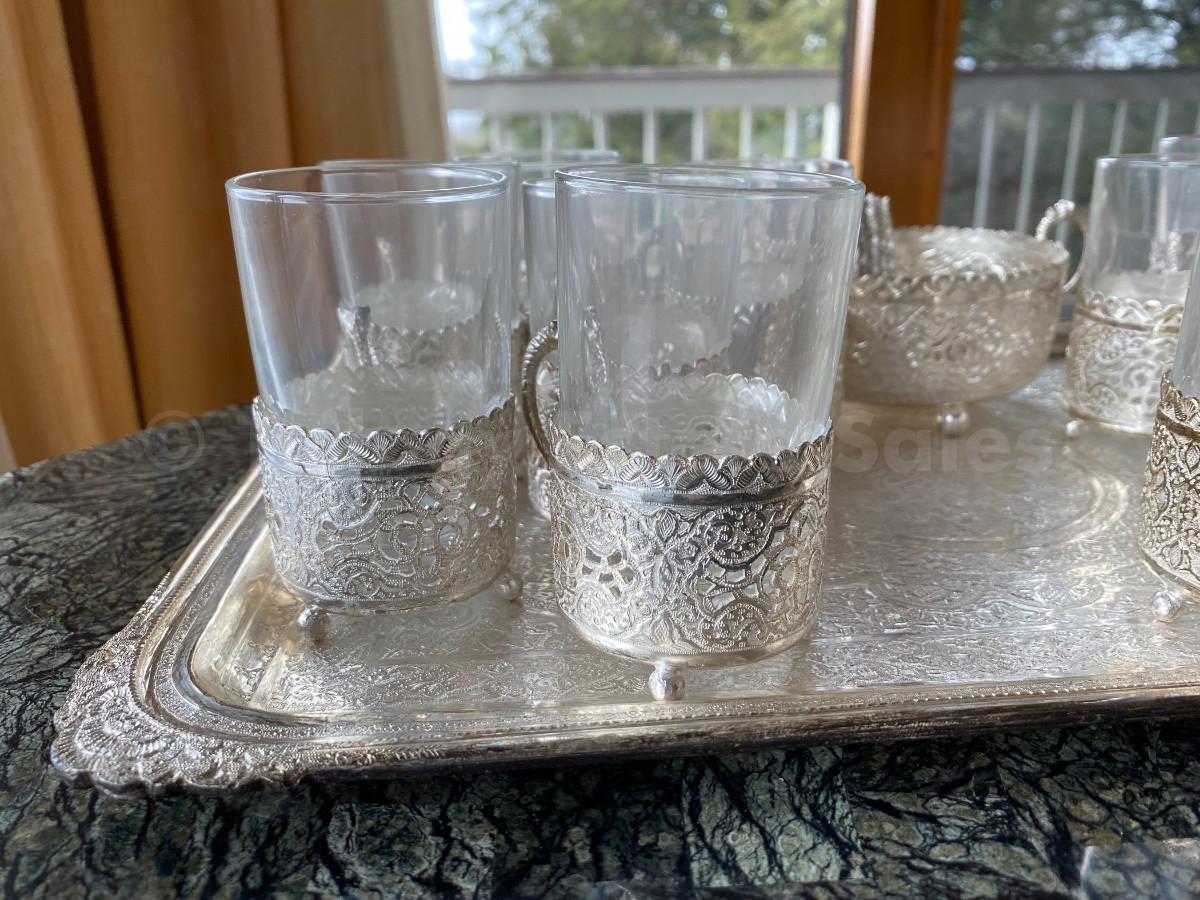 Persian tea set and tray. All marked 84, Russian standard silver.