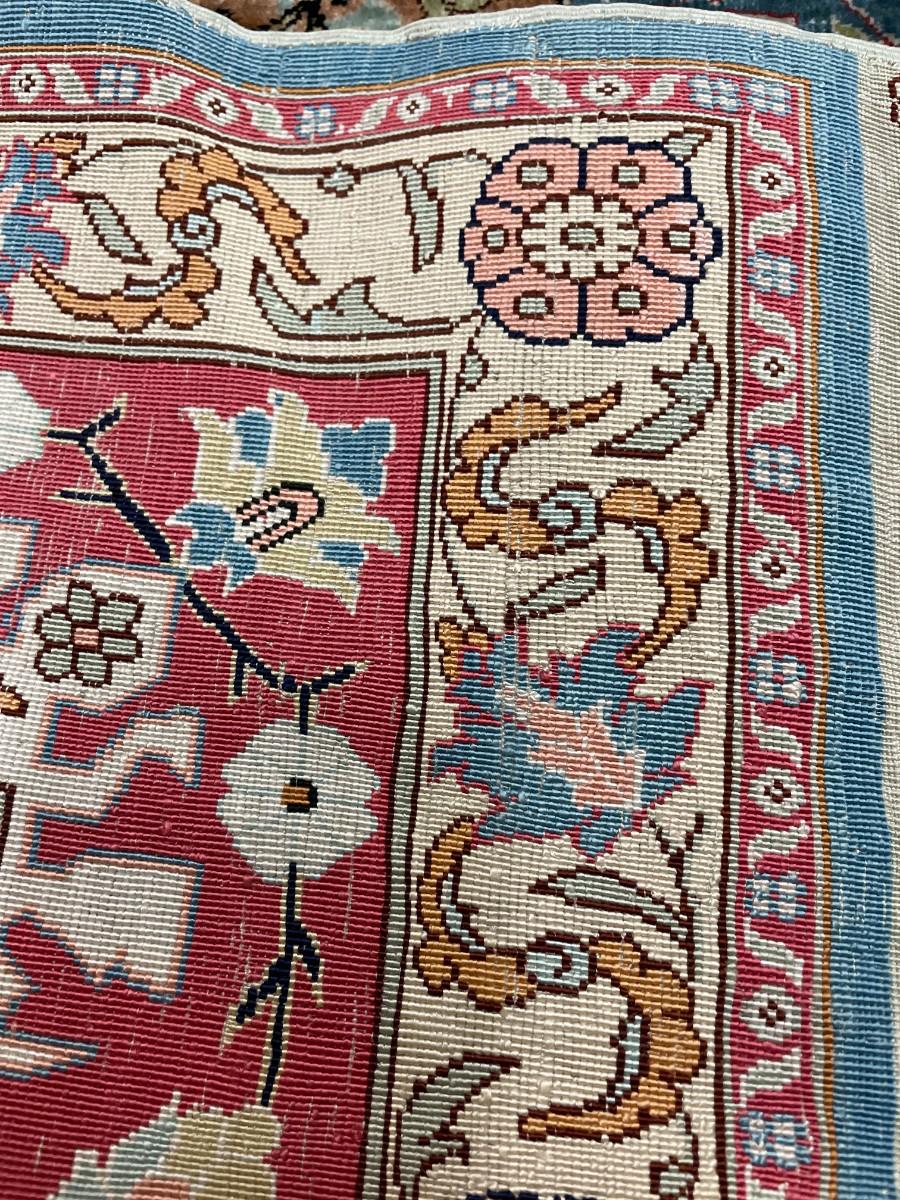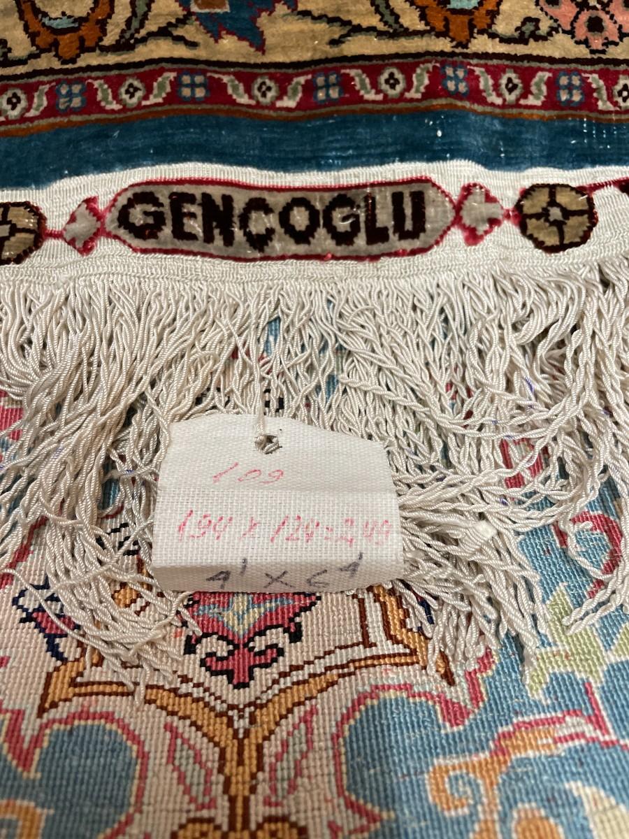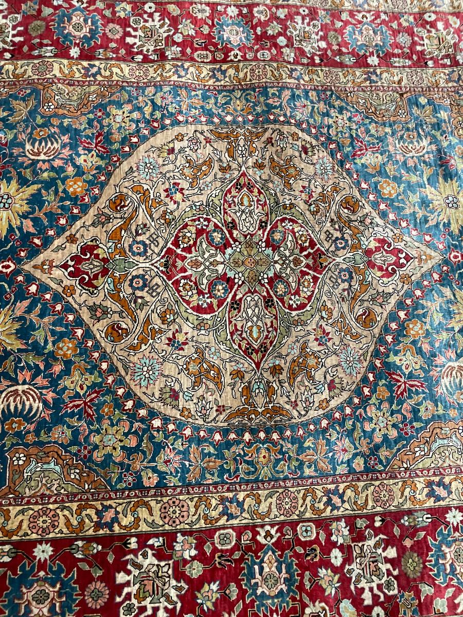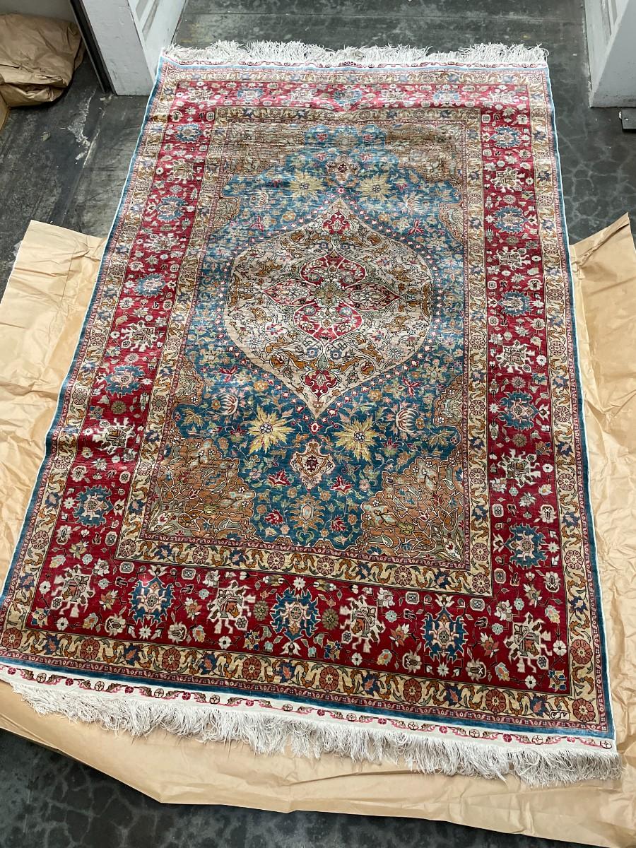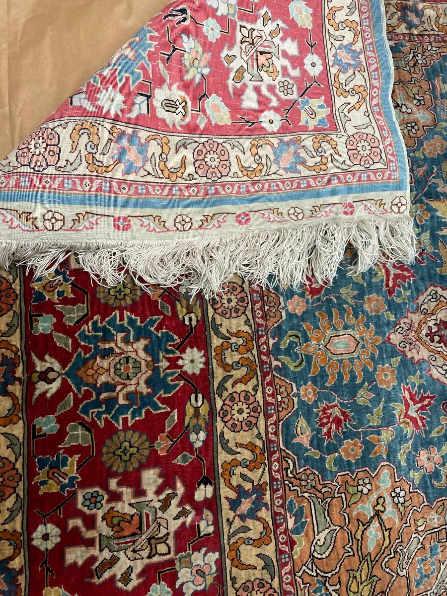 Oriental rug in master bedroom. 6' 9" x 4'1"approx. Persian, modern. Silk blend. (676 knots per square inch.) Turquoise background. Center brown, red design, red border. With fringe. Modern. Condition Good, needs light cleaning