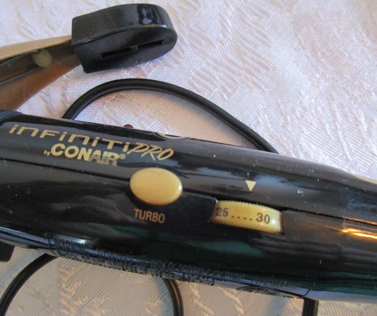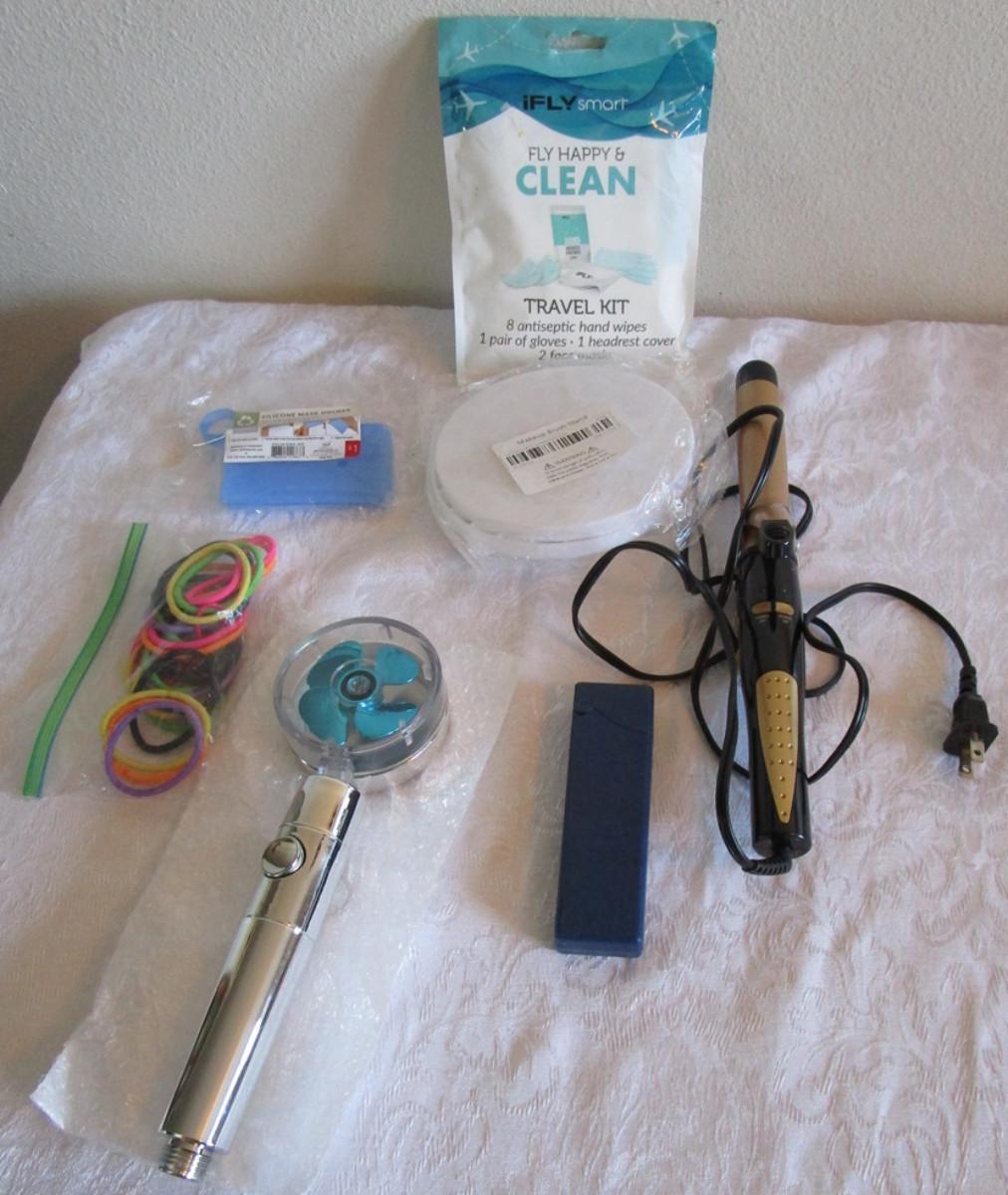 1 Conaiar Infinity Pro curling iron 1", makeup/brush stand new in bag, tampon case, Shower head, hair ties, travel kit