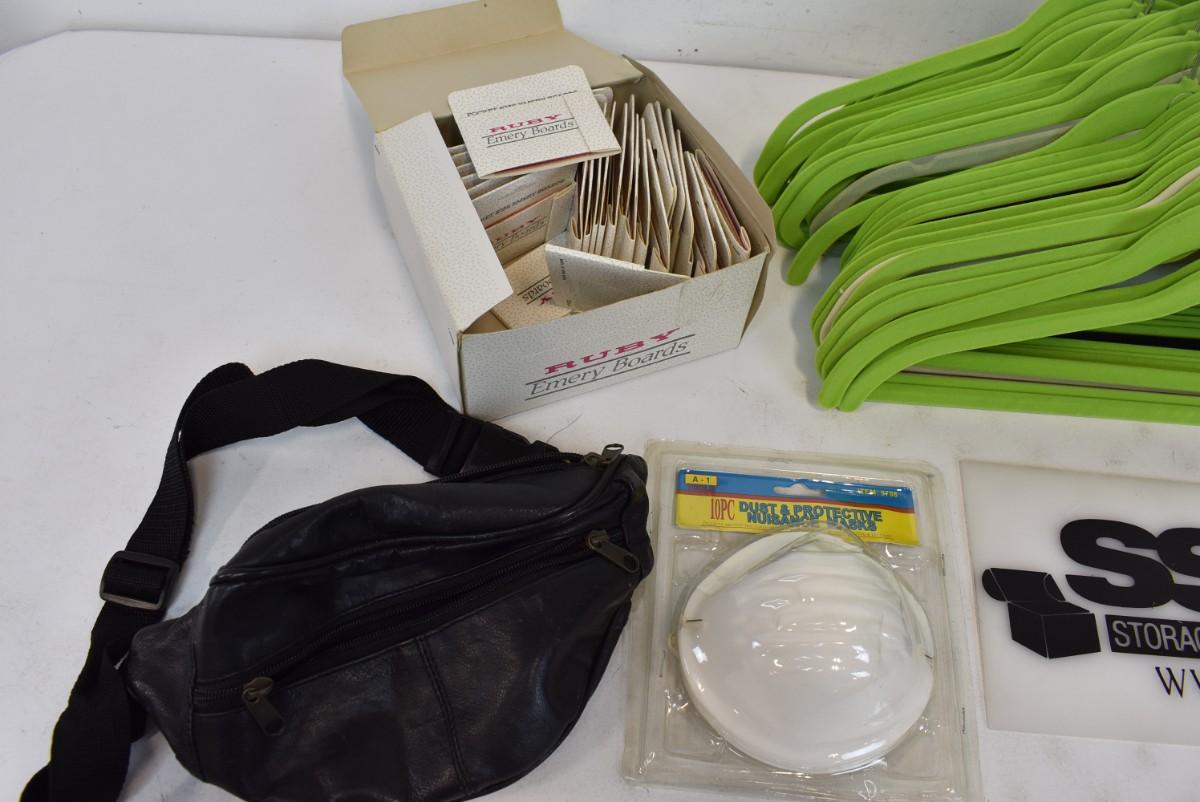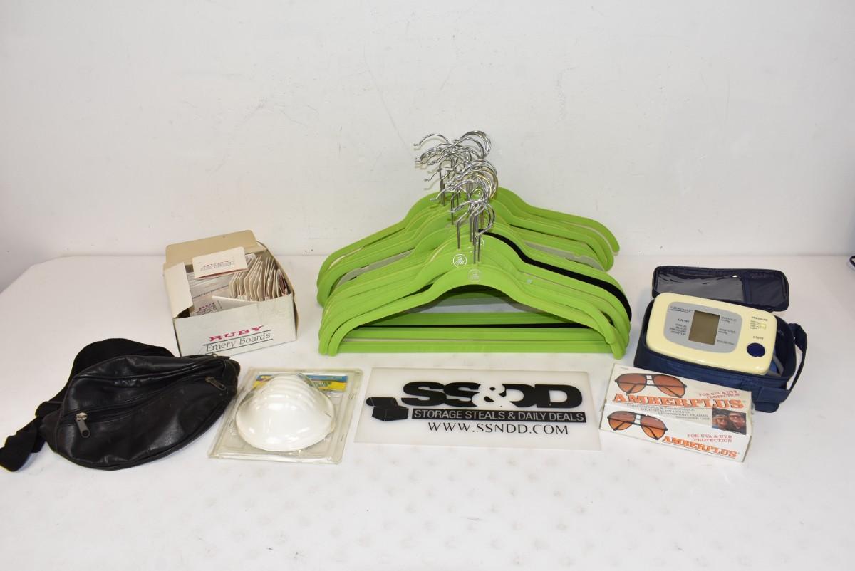 Personal Care Lot: 26 packs of emery Boards, BP Monitor, Sunglasses, Belt Bag, Mask, 35 hangers