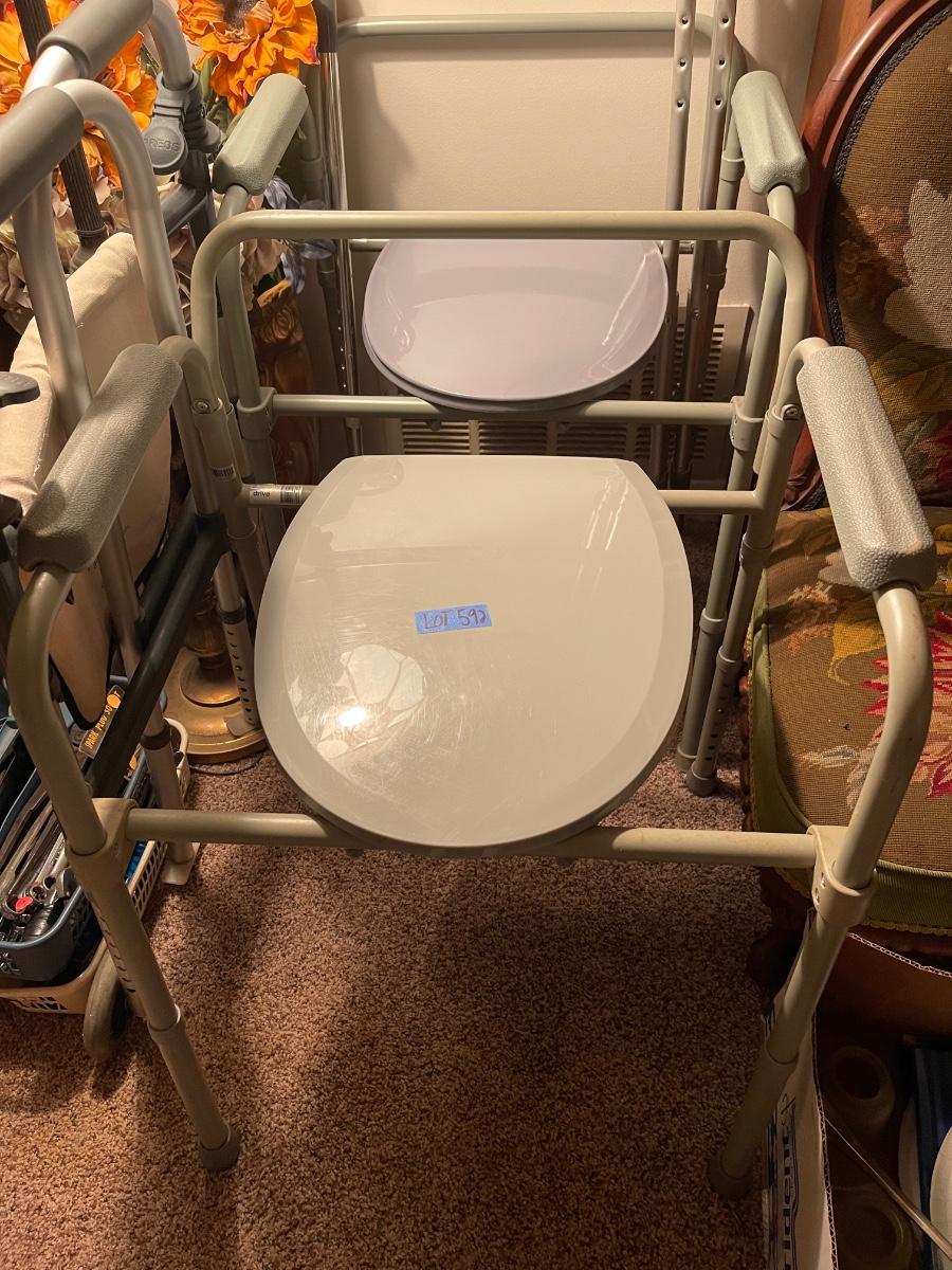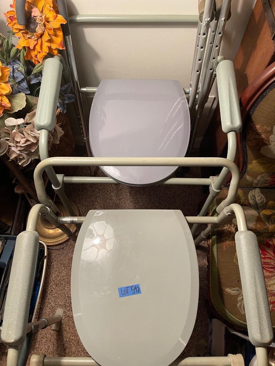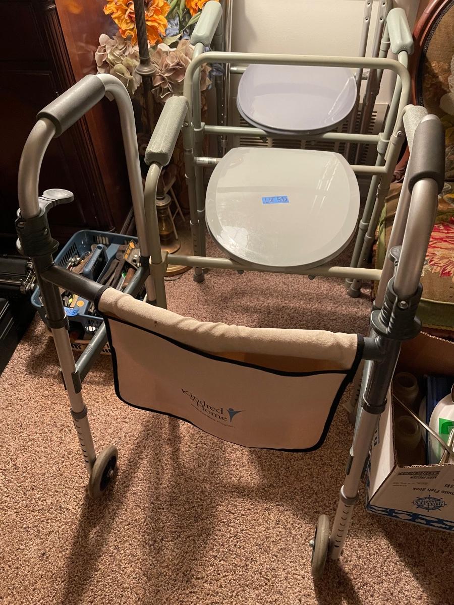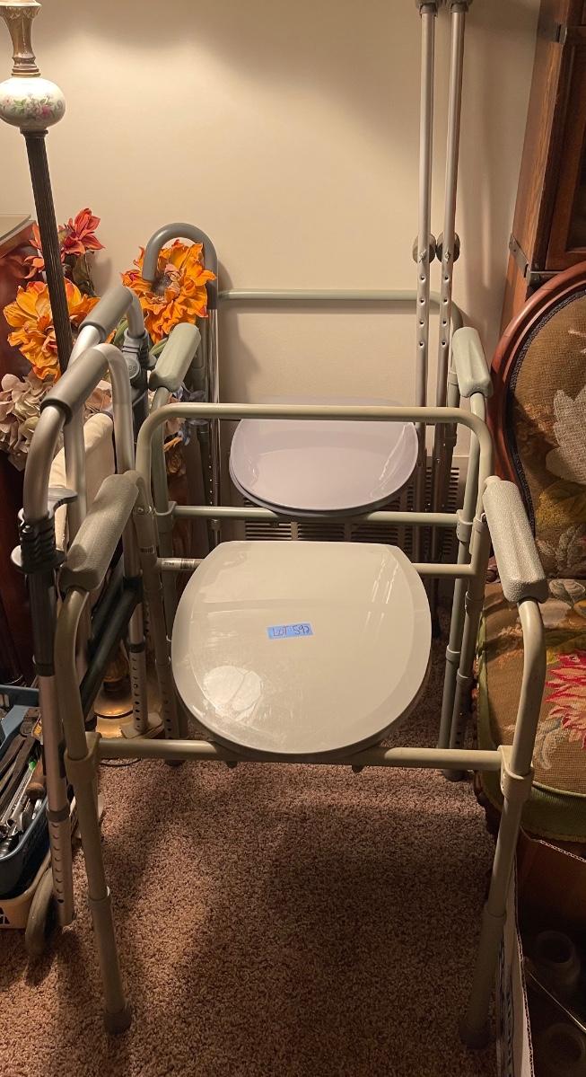(2) mobile toilet seats, rolling walker, regular cane, pair of crutches.