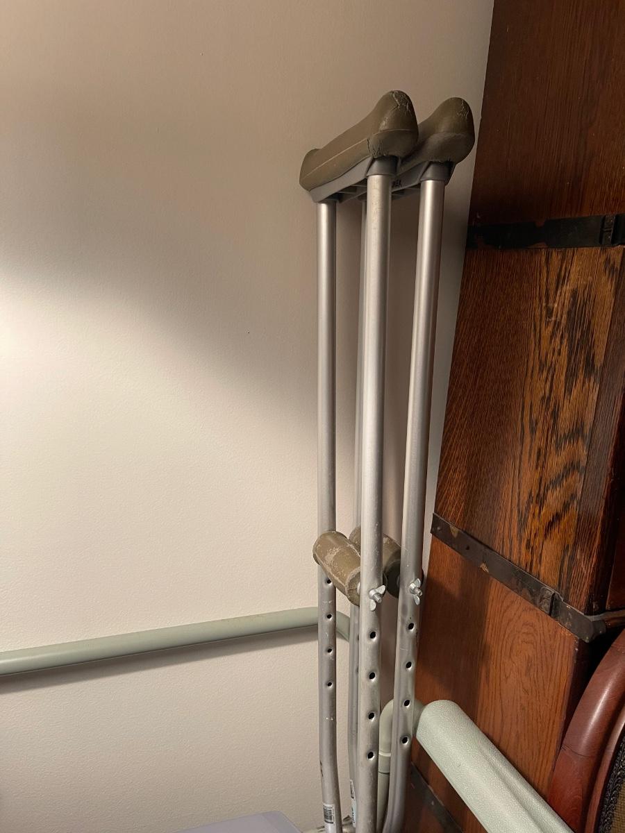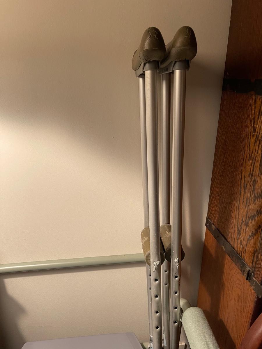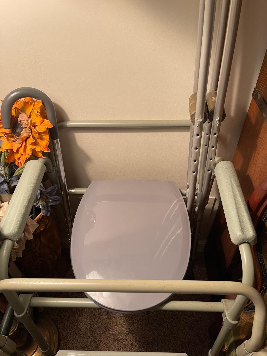 (2) mobile toilet seats, rolling walker, regular cane, pair of crutches.
